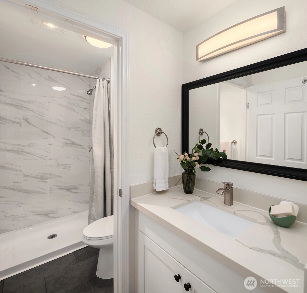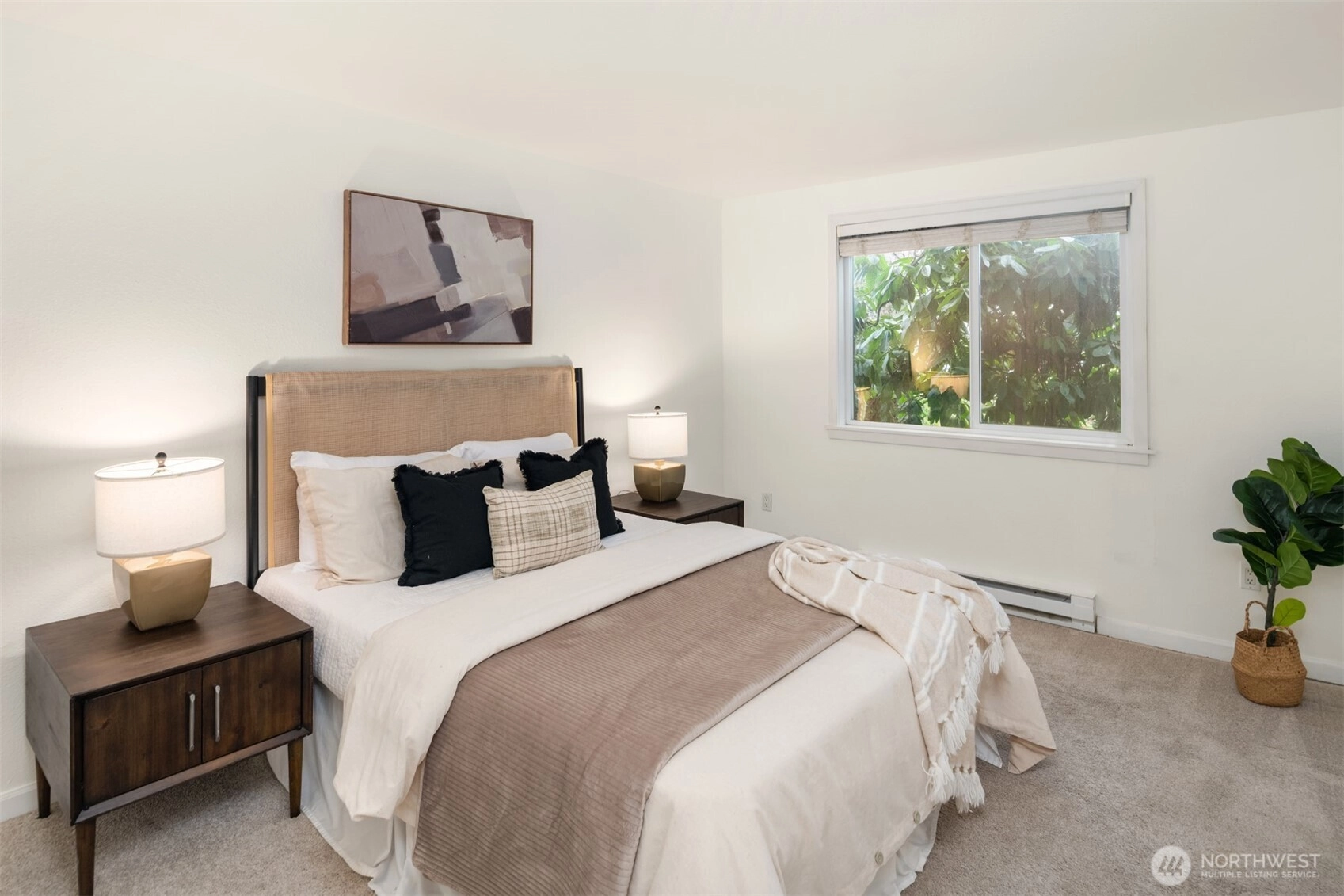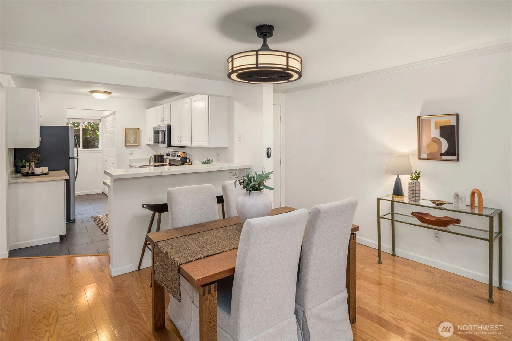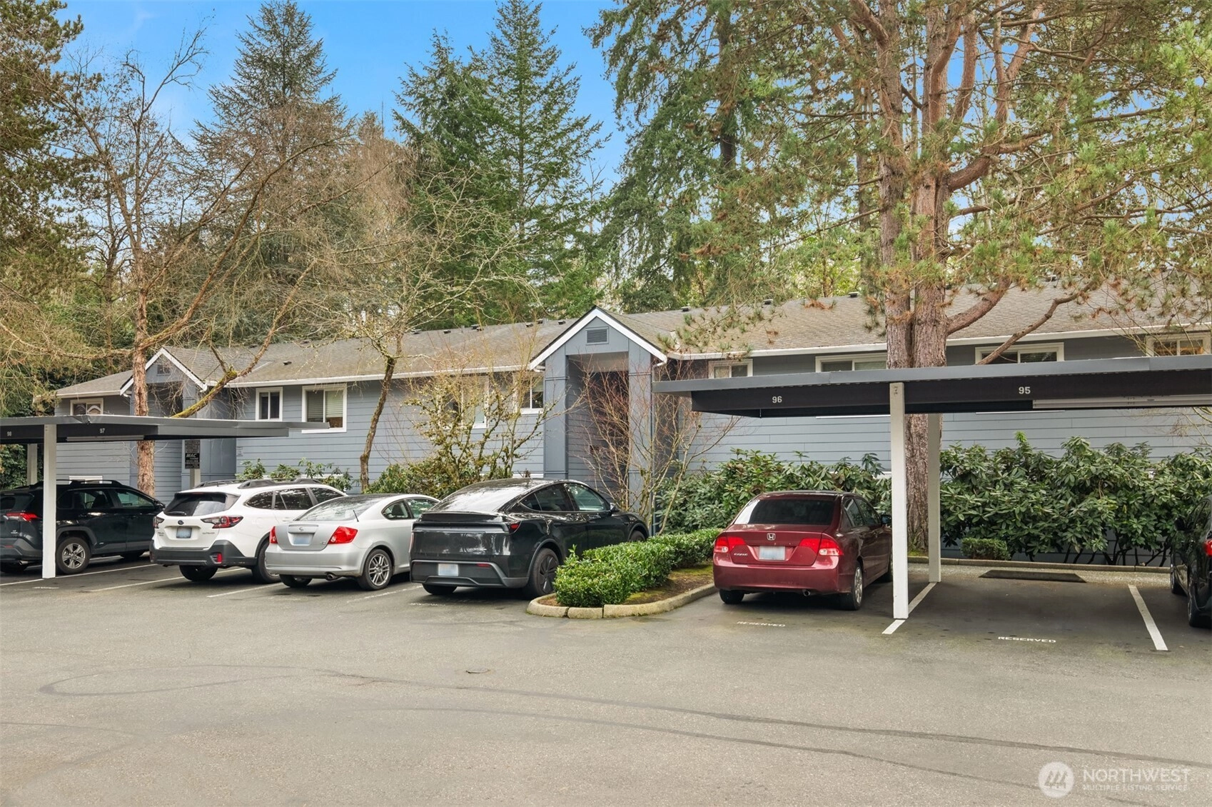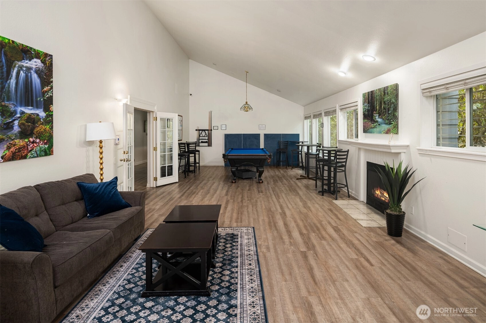 Tucked into the peaceful, well-maintained Kirkland Springs community, this updated ground-floor unit offers 980 square feet of comfortable, easy living. With a private exterior entrance and no common hallways, access is both convenient and welcoming. The ideal floor plan lives large, featuring an open layout with a dedicated dining area, a cozy wood-burning fireplace, and two generously sized bedrooms. The living space opens to a serene outdoor retreat with a private patio overlooking a tranquil pond and fountain. Recent upgrades include fresh interior paint, new tile flooring in the entry, kitchen, and bathrooms, marble kitchen countertops, and brand-new appliances including a refrigerator, dishwasher, and range. Both bathrooms have been refreshed with new tile flooring and countertops for an upgraded modern look. This unit checks all the boxes on your condo list with an assigned covered parking space plus additional owner and guest parking, in-unit laundry, and amenities including a clubhouse, pool, hot tub, fitness room, and basketball court. Located just a short stroll or roll to shopping and dining at Juanita Village and Juanita Beach Park, and minutes to The Village at Totem Lake and downtown Kirkland's lively waterfront. Convenient to I-405 for easy access to downtown Bellevue, Google Kirkland, and Microsoft. No rental cap, no special assessments, and located in the award winning Lake Washington School District.