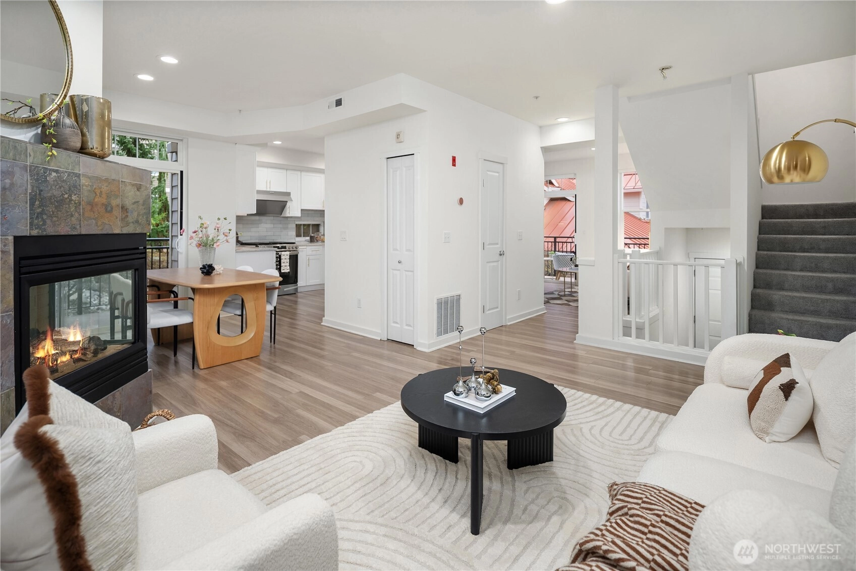 Great Location! Great schools! Great Price! Rare END-unit townhome in the private, GATED Corta Madera community directly across from Factoria Mall. This light-filled corner home offers a flexible floor plan with 3 bedrooms + Office, 2.25 baths, and an attached 2-car garage. Features include high ceilings, 2 gas fireplace, abundant natural light, and seamless indoor-outdoor living with 2 sunny decks, private patio, and fenced backyard. Remodeled kitchen with new stainless steel appliances and ample storage. Newer remodeled bathrooms and new vinyl flooring on the main level and basement add modern comfort. Steps to shopping, dining, groceries, transit, and minutes to I-90 & I-405. Beautiful Tuscan-style community with landscaped courtyard. Award-winning Bellevue Schools: Woodridge, Tyee, and Newport High. HOA covers water & sewer.