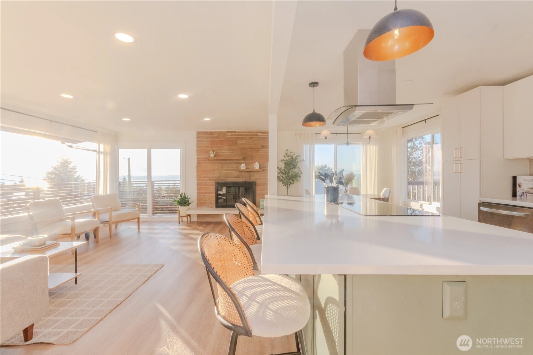 Unlock Your Dream Home in the Heart of Normandy Park. This beautifully reimagined mid-century modern residence offers breathtaking Sound and mountain views from the main living spaces and private deck. Thoughtfully renovated by a designer, the home features 1,960 sq ft of well-designed living space with an open-concept kitchen, dining, and living area—perfect for entertaining or everyday comfort. The lower level includes a spacious recreation room and a full-size laundry room with an additional full bath, offering flexible living options. Enjoy peace of mind with extensive 2024 upgrades, including a new heat pump with A/C, upgraded 200-amp electrical panel, conversion from septic to city sewer, all-new plumbing, a new roof, new appliances, washer and dryer, and new flooring throughout. Nearly half of the electrical has been updated, and new windows have been installed throughout the home (excluding the oversized living room window). Additional features include a two-car garage and a prime location within walking distance to QFC, Starbucks, and neighborhood amenities. Situated in the highly regarded Highline School District, this home seamlessly blends timeless design with modern efficiency—an exceptional opportunity in one of Normandy Park’s most desirable locations.