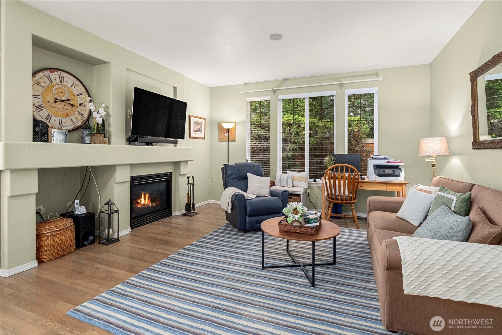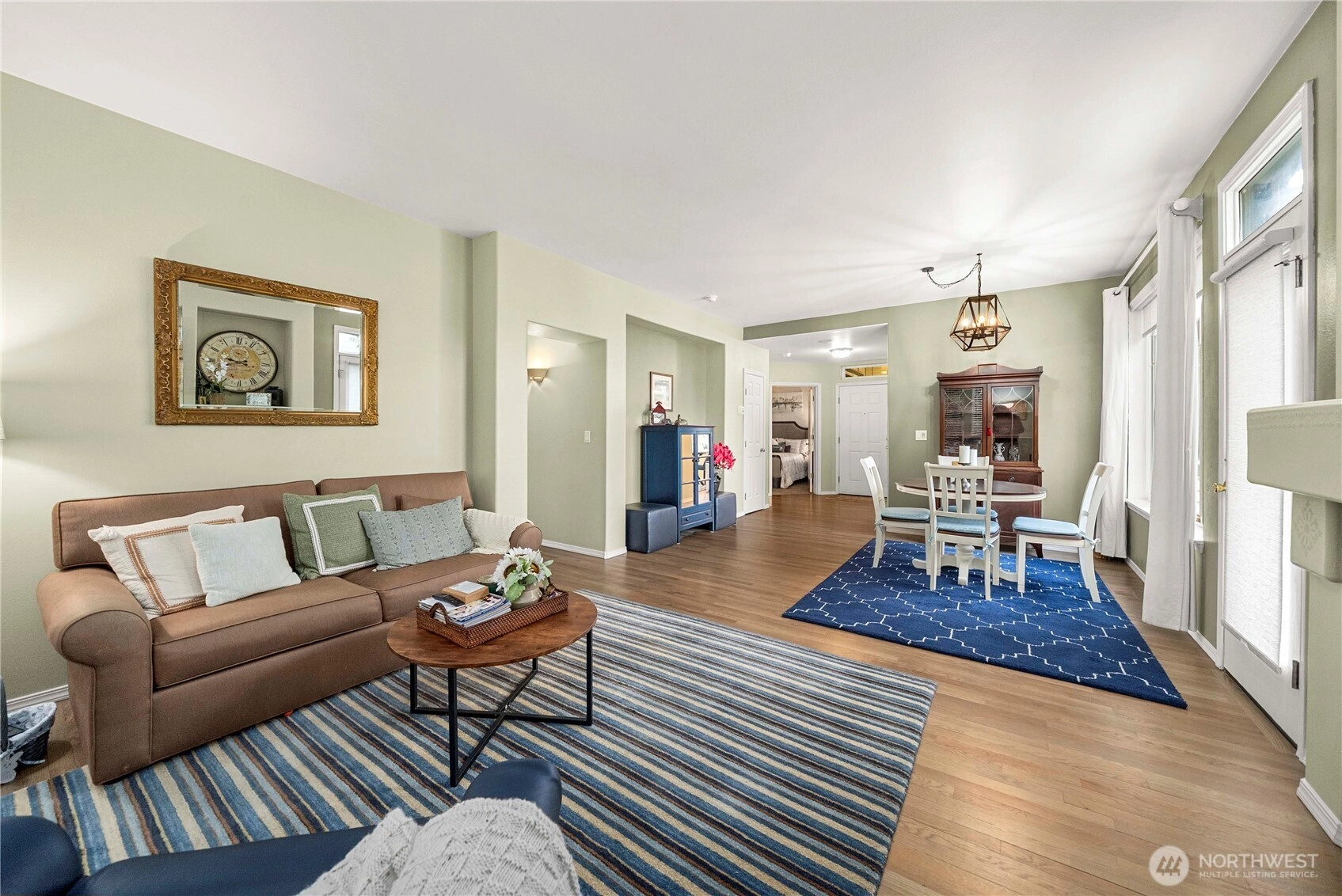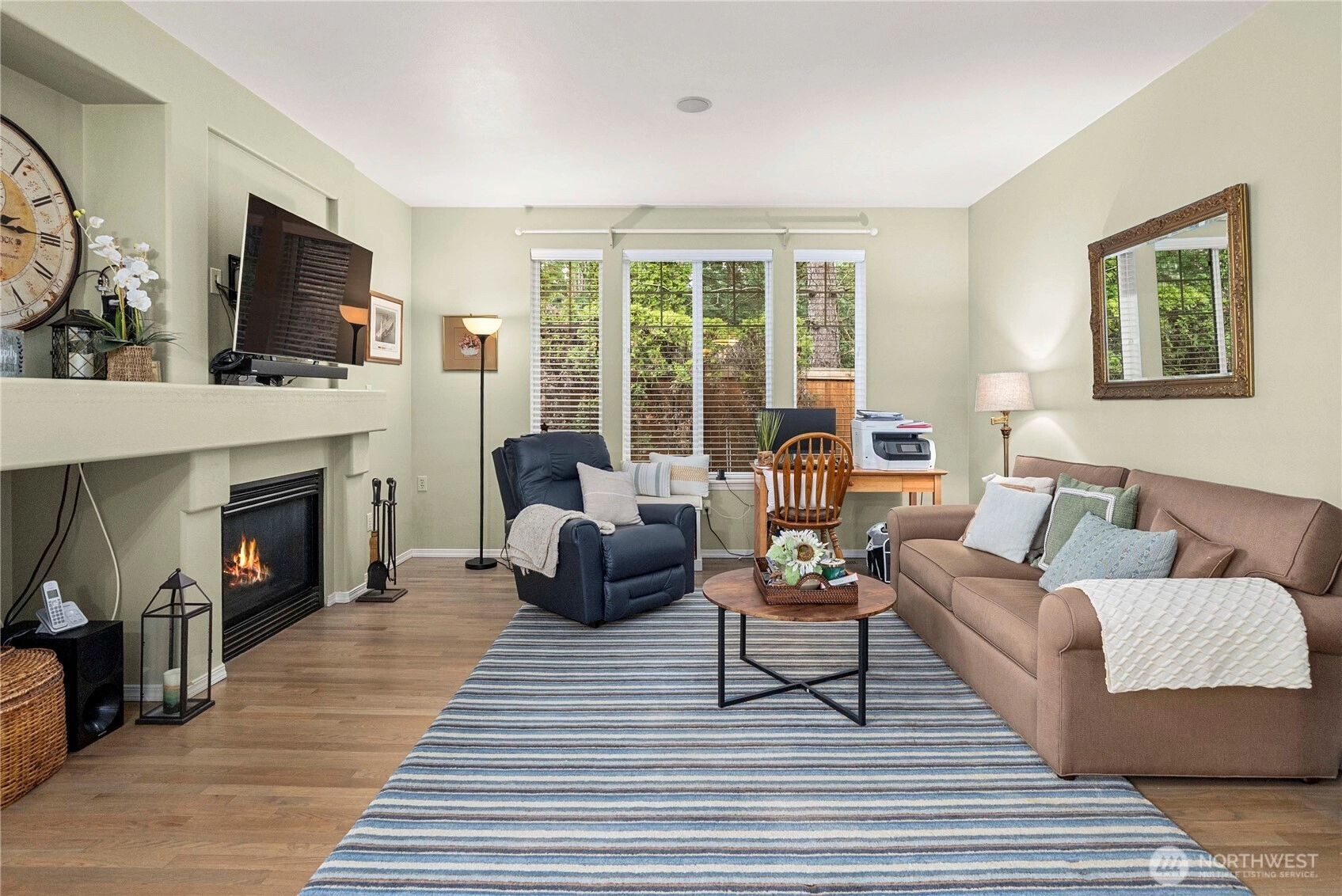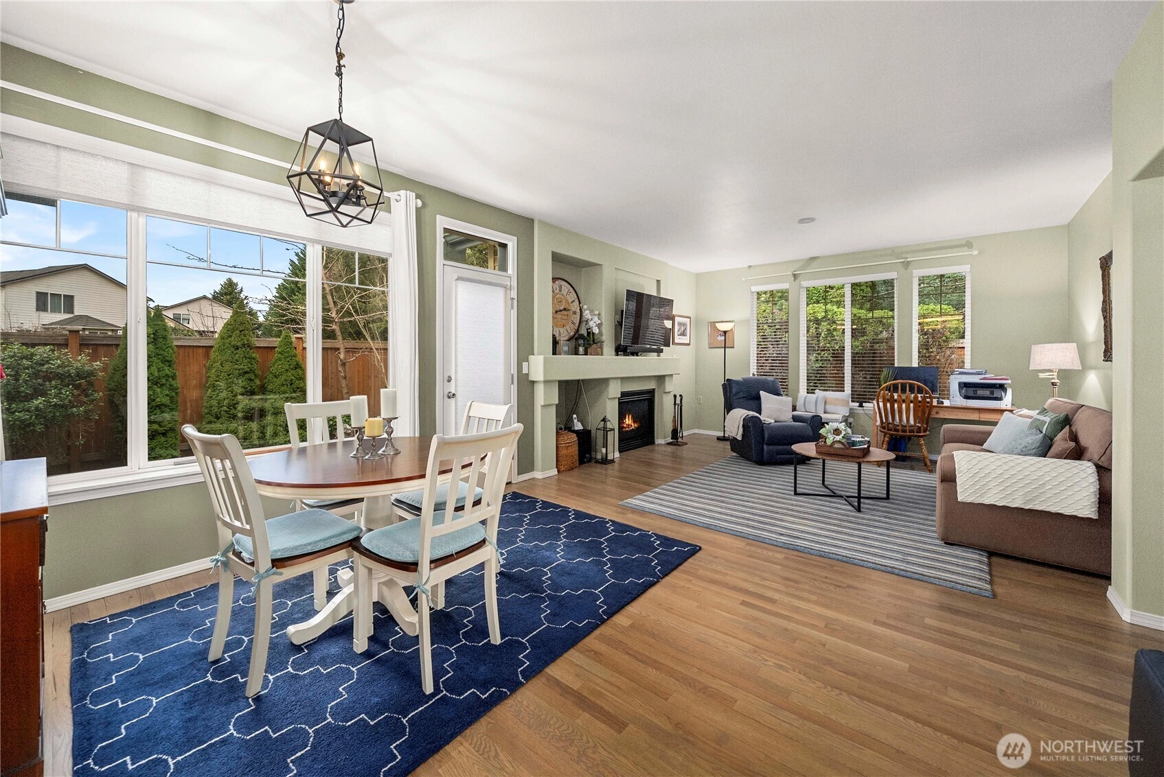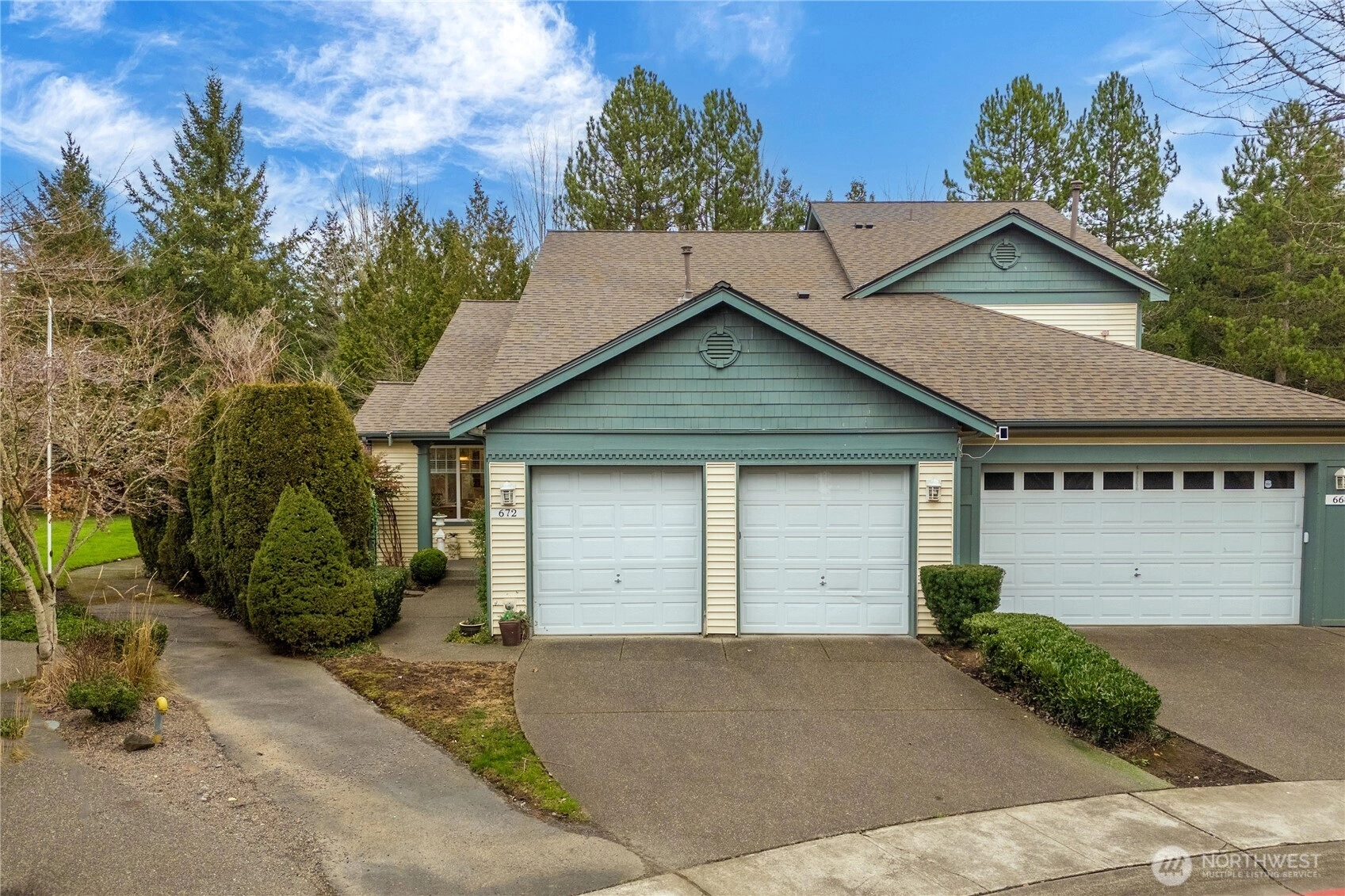 Rare rambler-style living in sought-after Peachtree Lane—where convenience does the heavy lifting. Stroll to nearby shops, errands, and coffee, then come home to easy single-level living and an open-concept layout. This well maintained and upgraded home is ready for it's new owner. Bright and airy kitchen offers plentiful cabinetry and counterspace. Generous eating space flows into the great room with a cozy gas fireplace for winter nights, plus sliders to a private patio made for grilling and string lights, set beside peaceful greenspace. You'll love the recently refinished hardwood flooring through the main floor. Spacious primary suite wows with a beautifully updated bath and a large walk-in closet. Second bedroom also features a walk-in closet. Enjoy your own 2-car garage with extra storage, plus two driveway parking spots for guests. Greenspace off the patio-play area or walk the dog right next door. HOA includes exterior maintenance, landscaping, water, sewer, and garbage. Fenced yard, private clubhouse and pool, and approx. Great commuter location- 10 minutes to Coal Creek Pkwy.