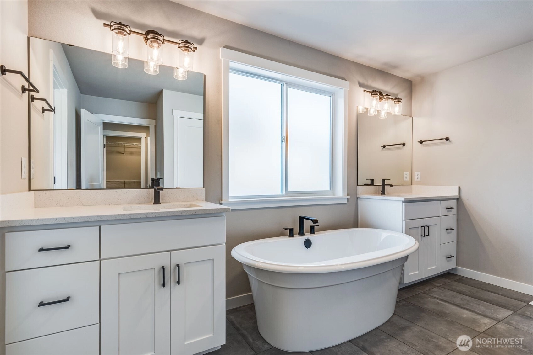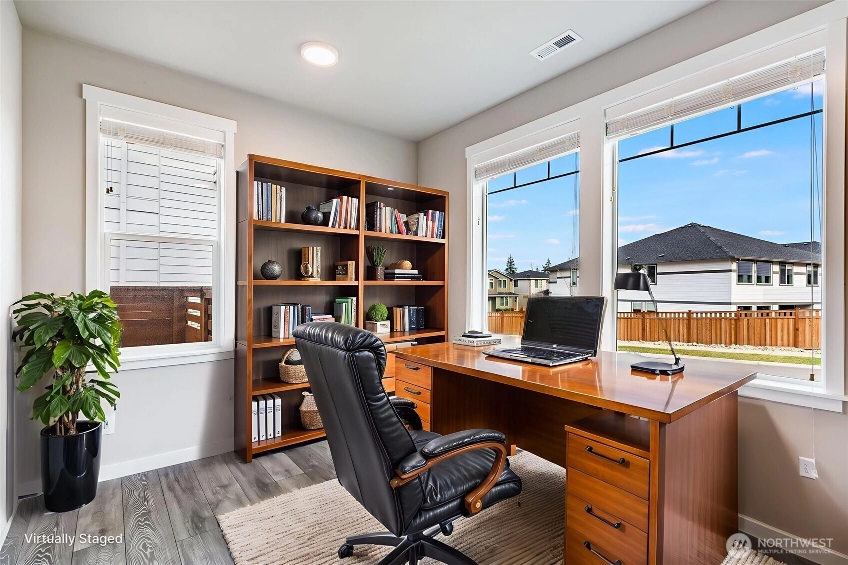 Welcome to this beautiful 2022 resale in the highly sought-after Tehaleh community. Offering 2,188 sq ft, this 3-bedroom, 2.5-bath home features a thoughtful, functional floor plan. The expansive kitchen showcases quartz countertops, stainless steel appliances, ample cabinetry, and generous prep space, opening seamlessly to the main living area with a gas fireplace insert. A main-level office/den provides ideal flex space for remote work or guests. Upstairs, the spacious primary suite features a large ensuite bathroom with his & her closets, a gorgeous freestanding tub, and a massive tiled walk-in shower. Two additional generously sized bedrooms and a full bath complete the upper level. Enjoy outdoor living on the covered patio, along with the convenience of a 2-car garage. Additional highlights include air conditioning, modern finishes throughout, and access to miles of walking trails, parks, schools, and community amenities all within the neighborhood. Experience Tehaleh living at its best—comfort, style, and convenience in one exceptional home.