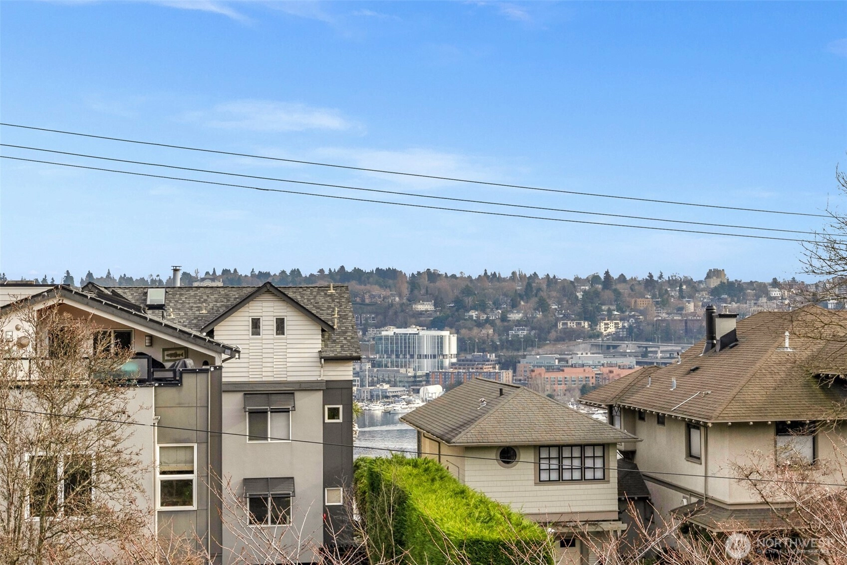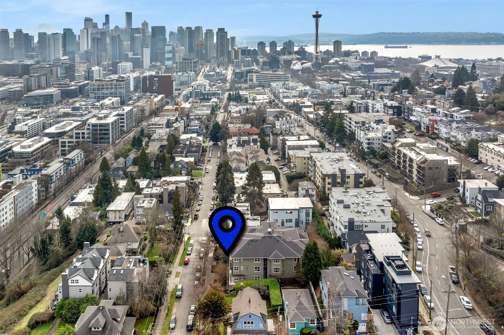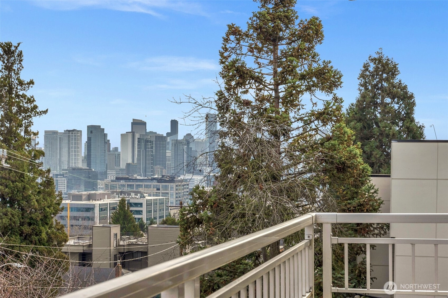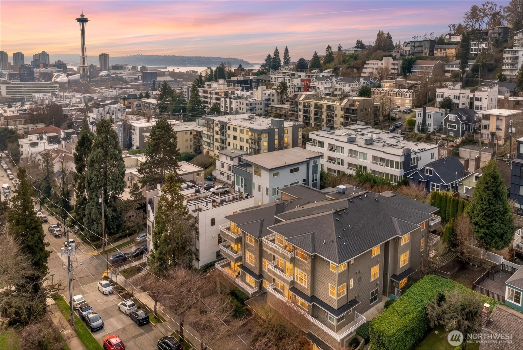 Wake up to sparkling Lake Union and downtown Seattle views from your own private 4th floor deck on Queen Anne's coveted east slope. Set on a quiet, tree-lined street, This luxury, boutique building (only 15 units) offers a calm, neighborhood feel just minutes from vibrant city life below. Morning sun pours into this bright and open east facing home. This spacious end-unit features an open layout with gas fireplace, primary w/walk-in closet & bath & a deck that truly extends your living space—perfect for morning coffee while watching the city wake up or unwinding as the skyline lights come on. Residents here enjoy a well-run, meticulously maintained building, thanks to an active, caring HOA community that prioritizes upkeep, safety, and pride of ownership. Thoughtful amenities include elevator, secure lobby & garage entrance. A rare bonus in this close in QA neighborhood: 2 secure garage parking spaces #23 & #24 and right next to your dedicated storage room #2B—an ideal setup for everyday convenience, gear, & Metro Market runs. Get gardening, walk to the Queen Pea P-Patch community garden at Trolley Hill Park. All of this in a pet-friendly, no rental cap building with easy access to transit, South Lake Union, downtown, and the top of the hill. Walk to work, Amazon Spheres about a mile down the hill! Urban living with a neighborhood soul.