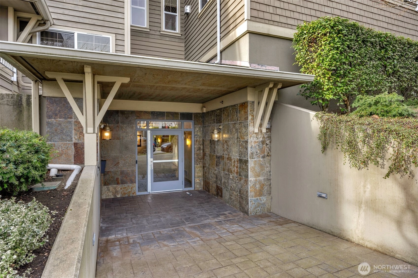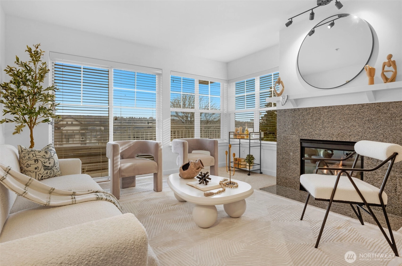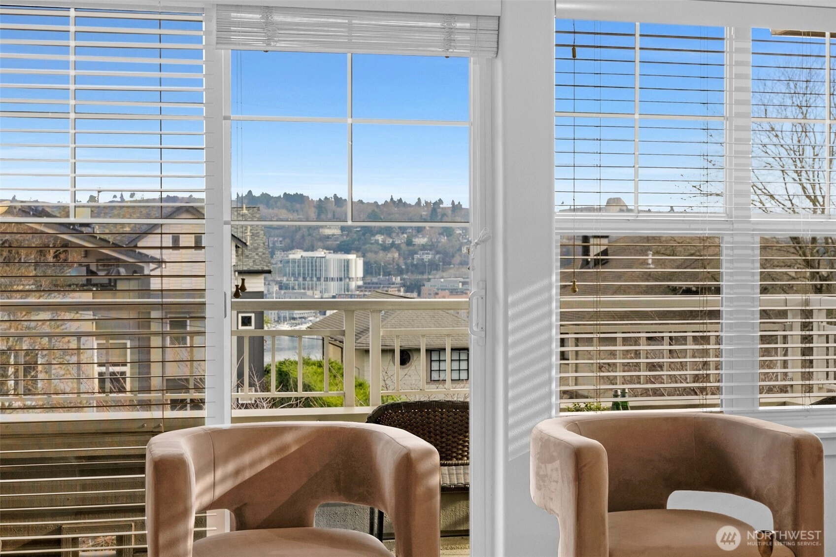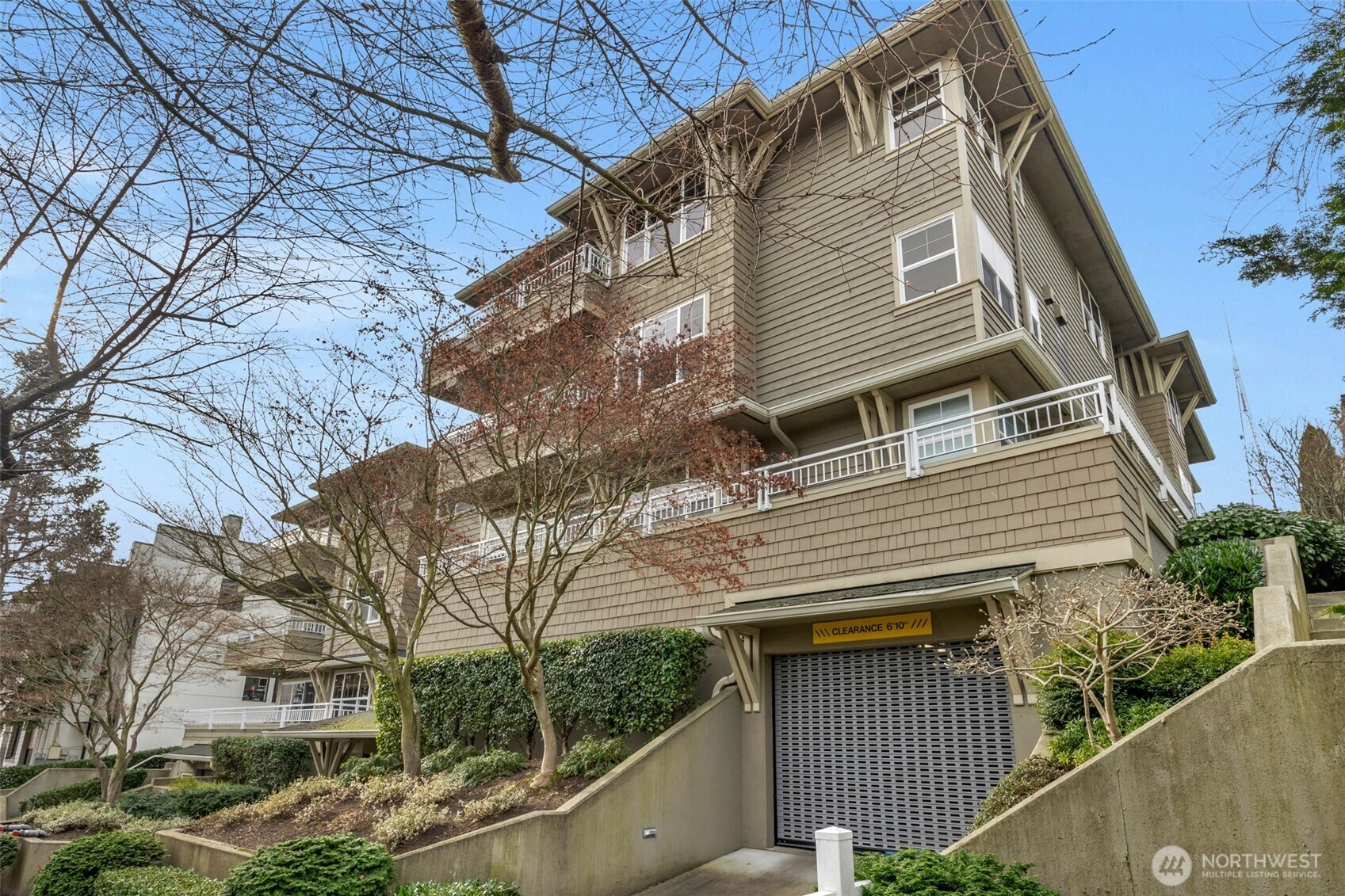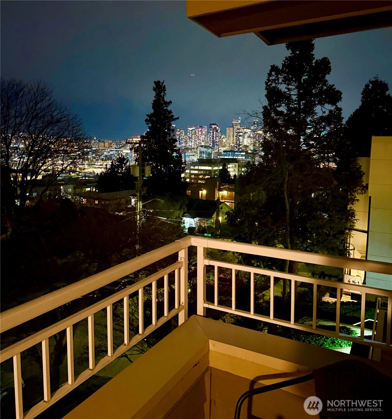 Wake up to sparkling Lake Union and downtown Seattle views from your own private 4th floor deck on Queen Anne's coveted east slope. Set on a quiet, tree-lined street, This luxury, boutique building (only 15 units) offers a calm, neighborhood feel just minutes from vibrant city life below. Morning sun pours into this bright and open east facing home. This spacious end-unit features an open layout with gas fireplace, primary w/walk-in closet & bath & a deck that truly extends your living space—perfect for morning coffee while watching the city wake up or unwinding as the skyline lights come on. Residents here enjoy a well-run, meticulously maintained building, thanks to an active, caring HOA community that prioritizes upkeep, safety, and pride of ownership. Thoughtful amenities include elevator, secure lobby & garage entrance. A rare bonus in this close in QA neighborhood: 2 secure garage parking spaces #23 & #24 and right next to your dedicated storage room #2B—an ideal setup for everyday convenience, gear, & Metro Market runs. Get gardening, walk to the Queen Pea P-Patch community garden at Trolley Hill Park. All of this in a pet-friendly, no rental cap building with easy access to transit, South Lake Union, downtown, and the top of the hill. Walk to work, Amazon Spheres about a mile down the hill! Urban living with a neighborhood soul.