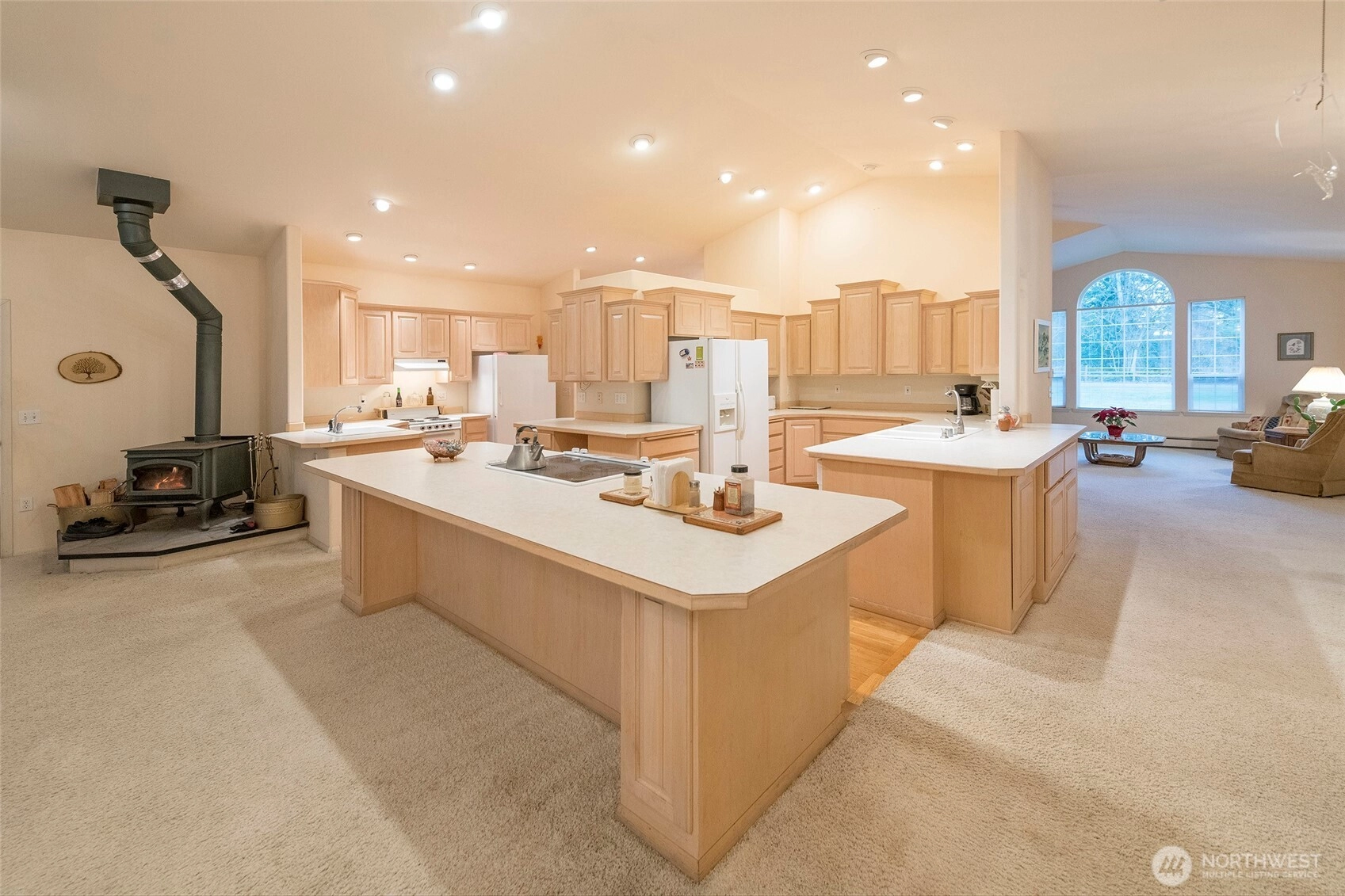 Secluded, one level living, custom-built home on your own private, wooded 4.77 acres in a desirable mid-island location, offering exceptional privacy and a peaceful natural setting. This 3-bedroom, 3 full bathroom residence features a spacious and flexible floor plan ideal for both everyday living and entertaining. The open-concept main living area is designed for large gatherings and comfortable hosting, enhanced by a cozy wood stove that adds warmth and character. The unique kitchen layout feels like having two kitchens, with nearly two of everything, featuring custom cabinetry, generous storage, and ample workspace for cooking and entertaining. The huge primary bedroom feels like your own private suite, offering space to relax and unwind, complete with its own patio and private entrance. An additional bedroom features its own private bathroom and patio access with a separate entrance, making it ideal for guests, a home office, or multi-generational living. Huge garage, room for cars and hobby's. Outdoor living is a highlight with a covered deck, multiple patios, and a large, usable yard surrounded by mature trees for year-round privacy. Additional features include an upgraded well, a convenient dog washing station, and the home is wired for a generator for added peace of mind. A rare opportunity to enjoy serene island living with space, comfort, and thoughtful custom design.