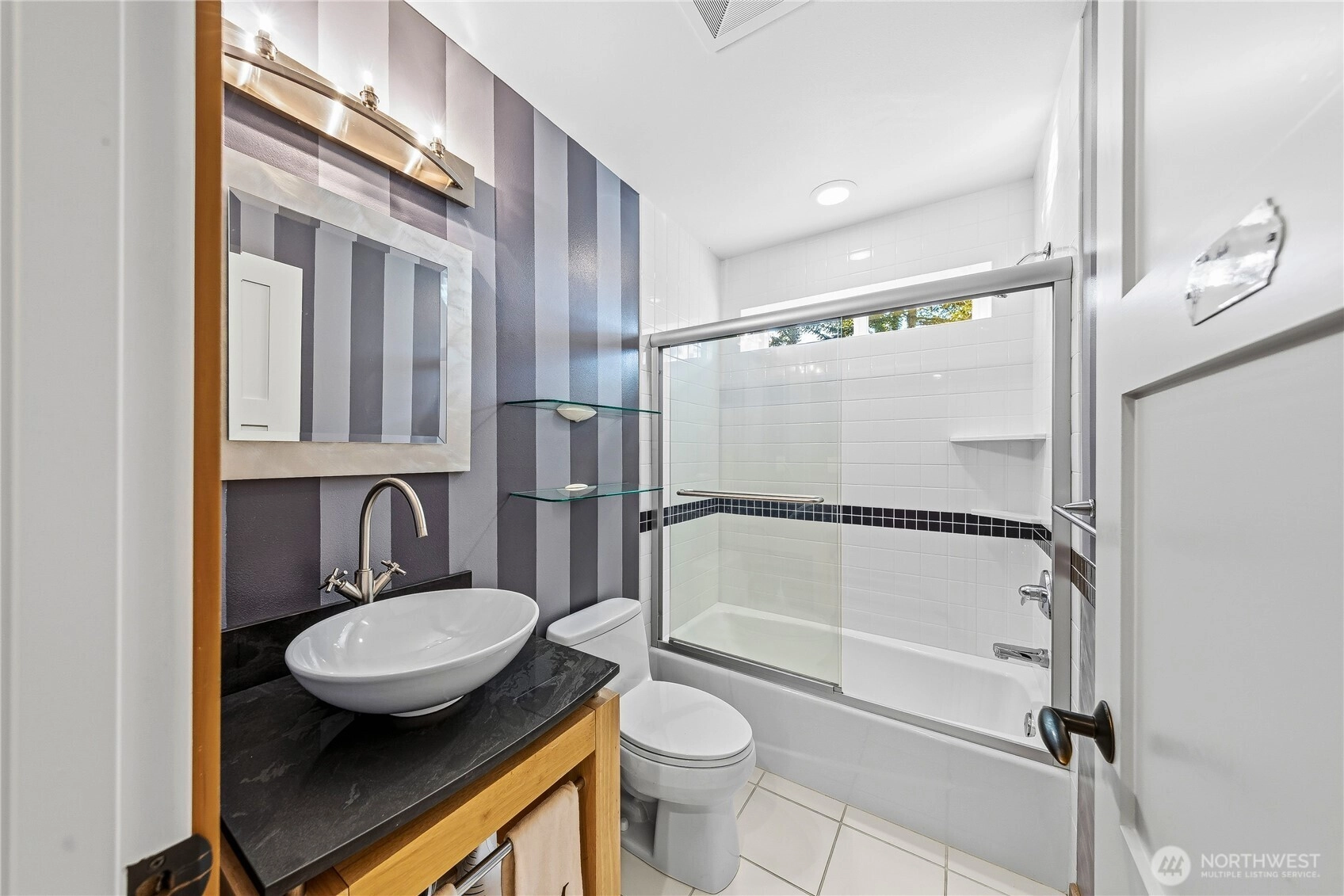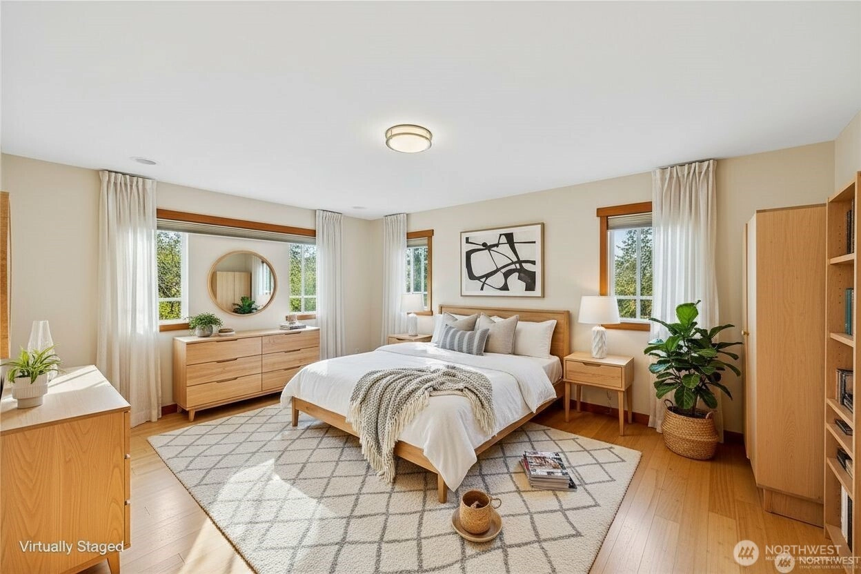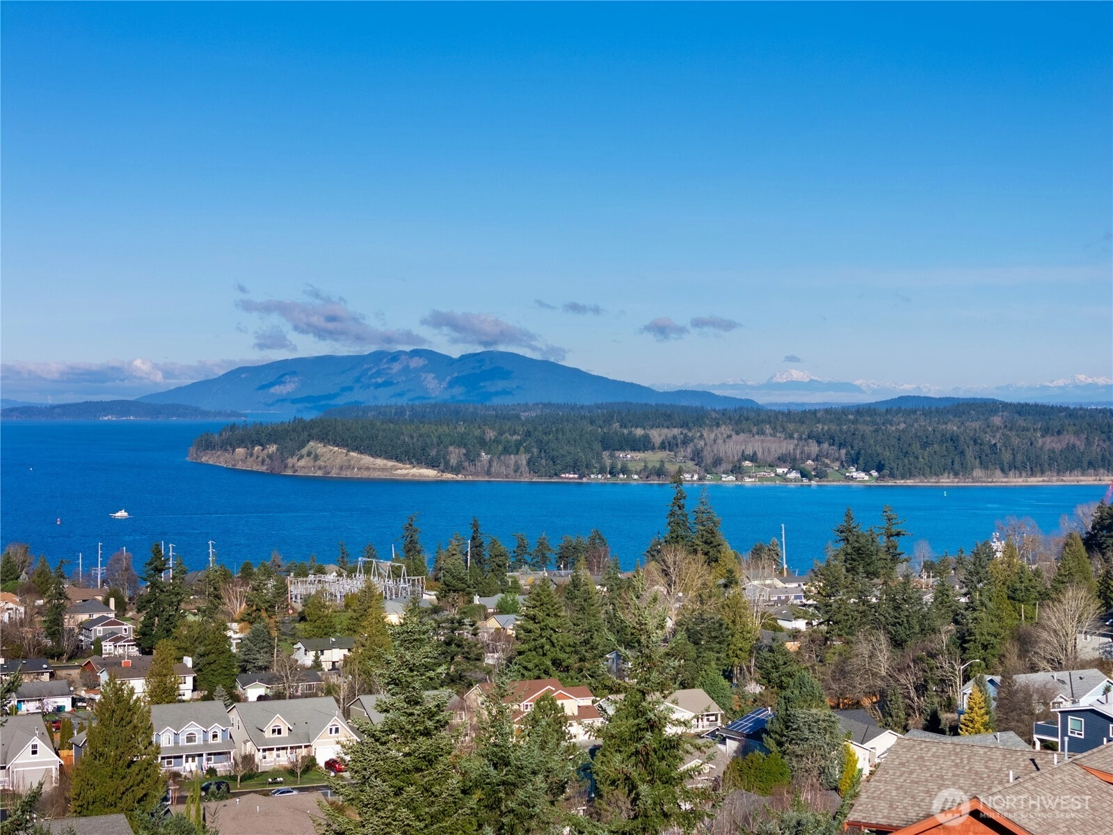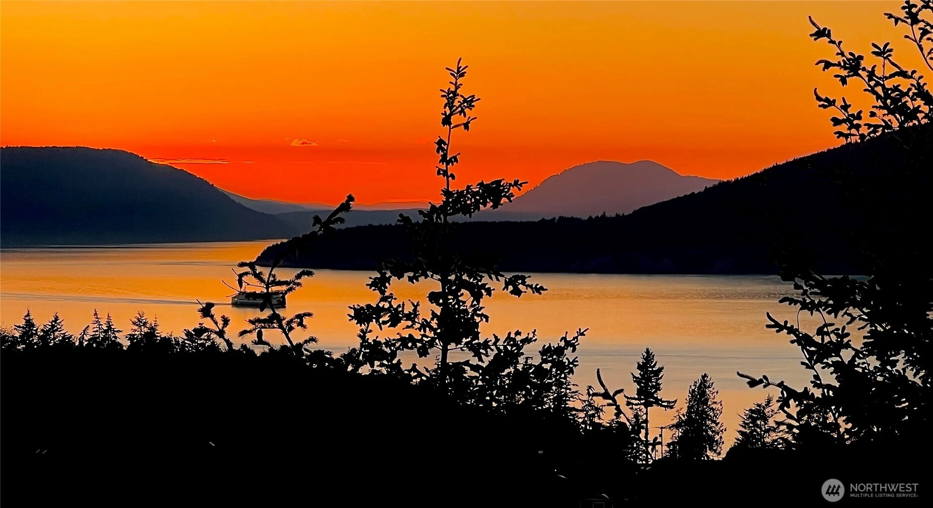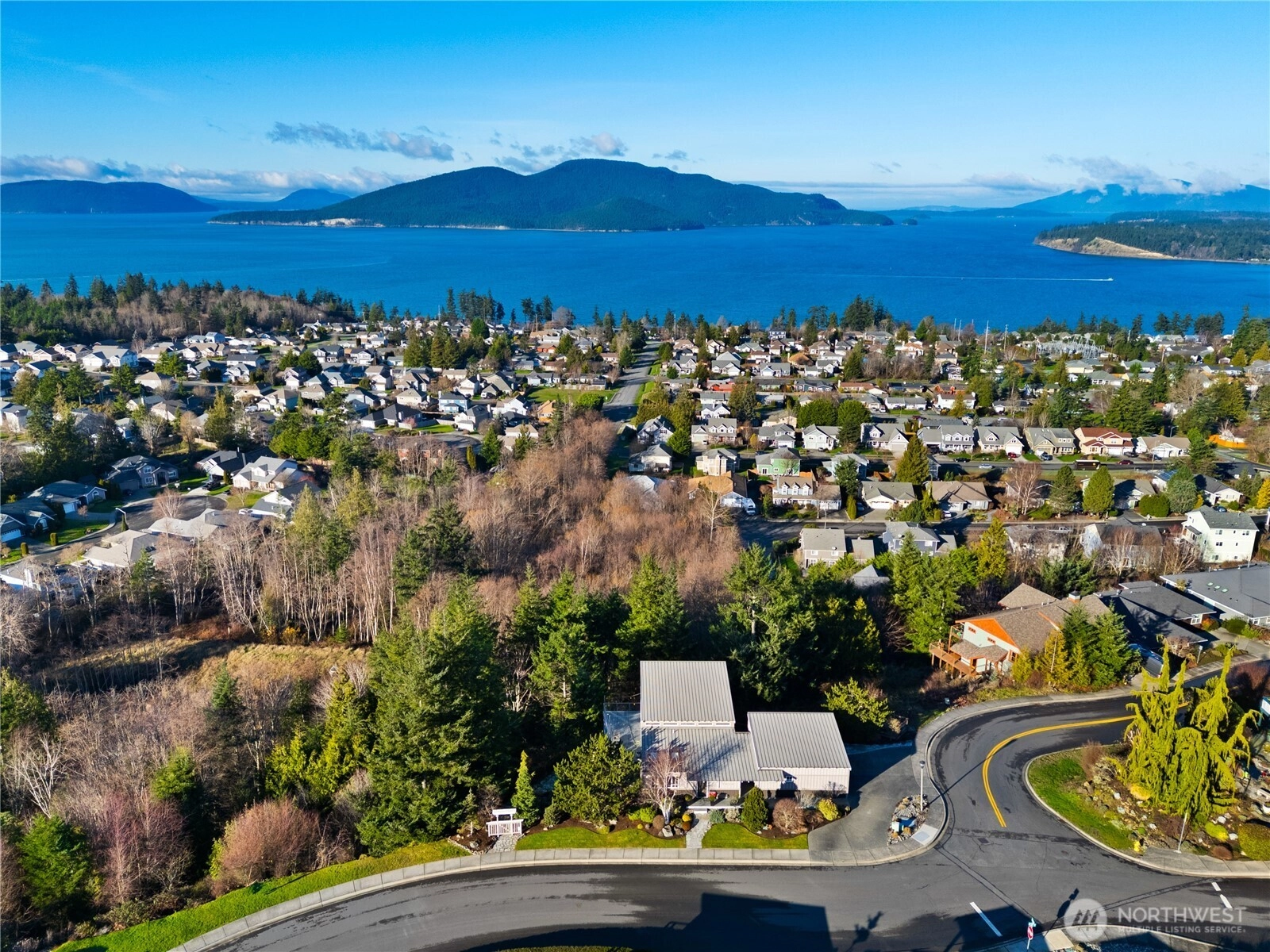 Elevated above the shoreline, this striking modern custom home captures unobstructed, ever-changing views across the San Juan Islands and Guemes Channel. Designed to embrace its Northwest setting, the home features dramatic vaulted ceilings and expansive walls of glass that flood the interior with natural light and frame the scenery from nearly every angle. The open main level flows effortlessly, anchored by a chef’s kitchen with custom cabinetry and premium finishes, and a warm living space centered around a statement stone fireplace and built-in details. A secluded primary retreat offers a true escape with spa-inspired bath, soaking tub, tiled shower, private media space, and a view deck made for quiet mornings and glowing sunsets. The lower level provides comfortable guest accommodations, additional bedrooms, and flexible living space. Outside, professionally designed landscaping, terraced patios, and multiple decks create seamless indoor-outdoor living, perfect for entertaining or unwinding as island sunsets—and even the northern lights—put on a show.