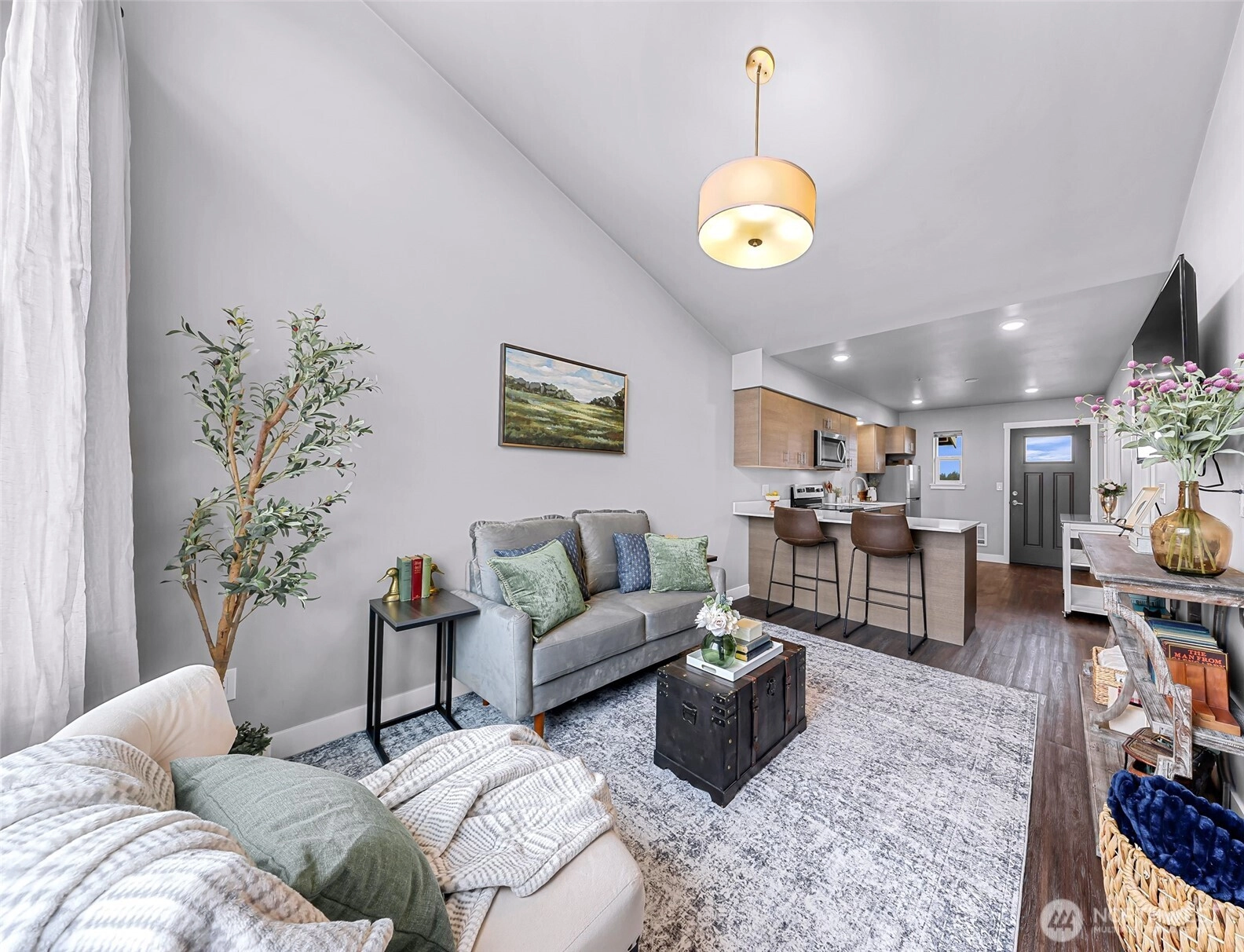 RARE opportunity to purchase this highly coveted, top floor, like-new 2020-built condo in the heart of Lynden! This stylish one-bedroom, one-bath home features a private balcony with serene views of Mt. Baker and a creekside setting. The sprawling vaulted ceilings add brightness and warmth to the open floor plan. Enjoy modern finishes and the convenience of being just minutes from local shops and dining. A perfect turnkey opportunity, ready for its next owner!