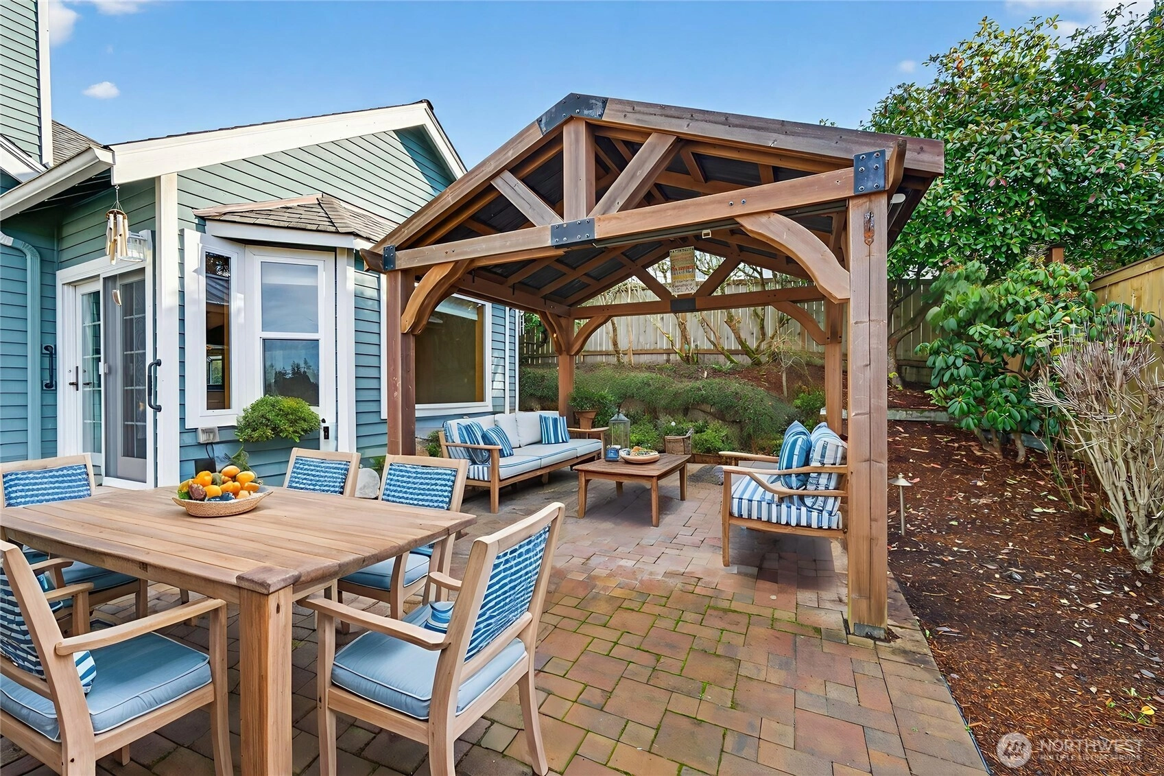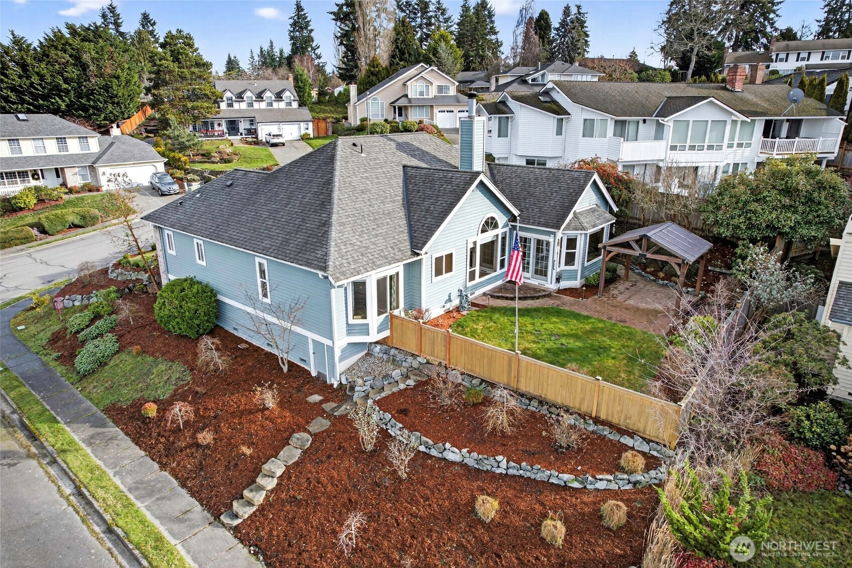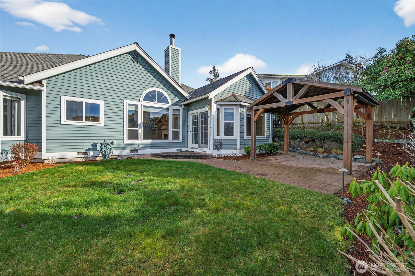 Commanding attention from a spacious corner lot w/ mature tiered gardens & a custom paver driveway, this Blue Ridge home is perfectly positioned to maximize sunlight & views. The functional single-level layout is bright, airy & inviting - an entertainer's dream! Vaulted ceilings, hardwood floors & abundant windows greet you, leading you into living spaces that flow effortlessly together for day-to-day ease or hosting gatherings of any size. Cooking is a joy in the spacious kitchen, equipped w/ granite countertops, newer stainless steel appliances, lots of storage space & bar seats to watch the chef at work. 3 bedrooms include a stately primary & a 5-piece ensuite bath. No shortage of storage here: between the oversized garage & all the smart built-ins throughout the home, everything has its place here. Outside, a large patio basks in sunshine & overlooks the tranquil fenced backyard. Abundant parking & GenTran generator make life easy while an efficient heat pump & A/C keep you comfortable. Quiet, peaceful location moments away from parks, dining & amenities in both Lynnwood & Edmonds!