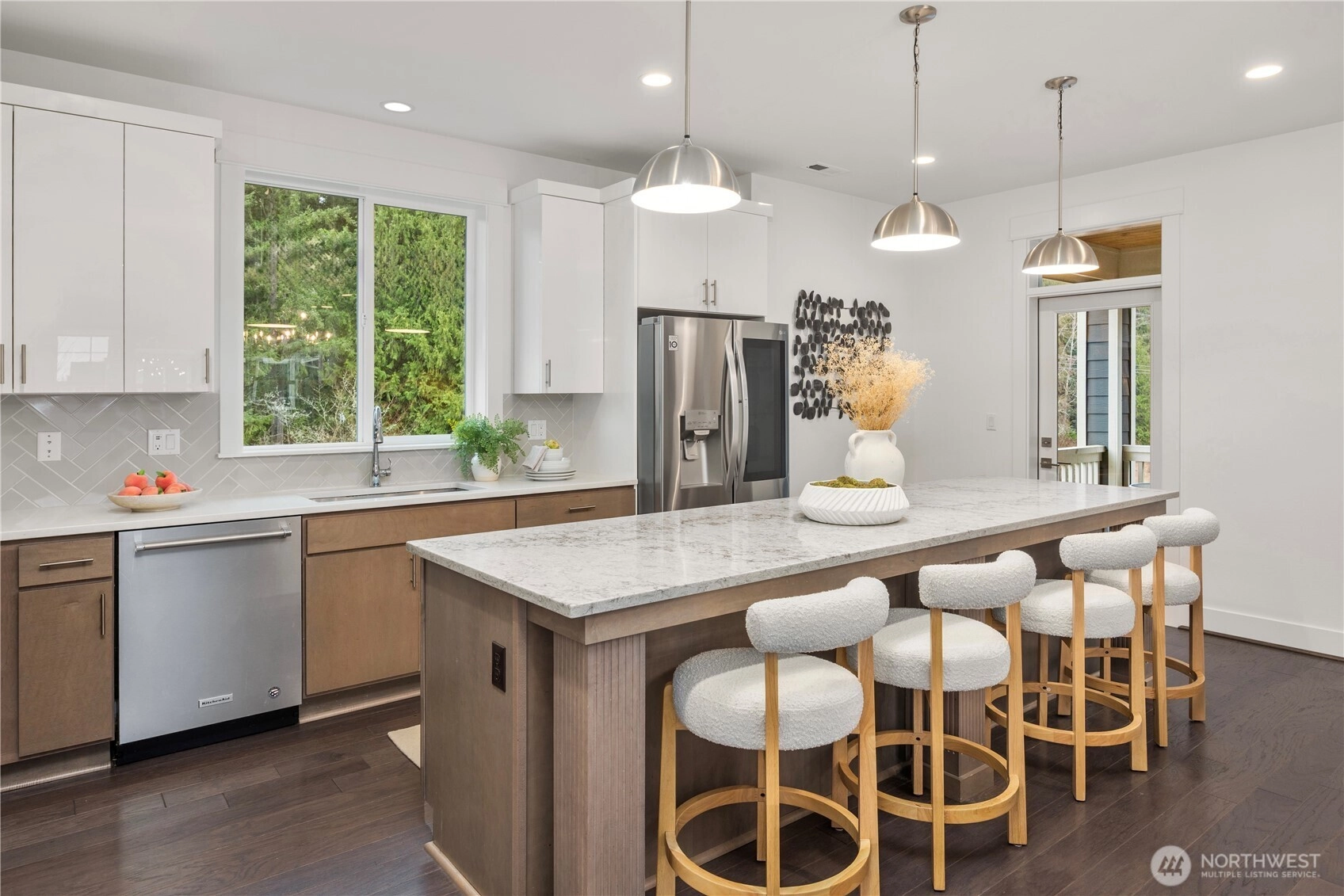 Welcome to TimberCreek and this beautifully maintained 2018-built Toll Brothers home offering 4 bedrooms and 3.5 baths. Situated on a level, generously sized lot backing to a serene 50-acre greenbelt, this home offers exceptional privacy and open views. The thoughtfully designed community features a private playground, clubhouse, community pool, outdoor covered kitchen and seating area, trails, and an athletic court. Enjoy the convenience of walking to top-rated schools and nearby amenities that Woodinville, Mill Creek, and Lynnwood have to offer. There are community carpools, a shuttle just 5 minutes away to all major tech hubs, and two-way routes to major highways for an easy commute. Inside the home, enjoy sun-filled rooms, a builder-upgraded modern kitchen, and an oversized quartz island that no other home has in the community! The flexible floor plan includes a lower-level bedroom with a full bath—ideal for guests, a private home office, or potential rental income. Professionally cleaned, freshly painted, fully serviced, and pre-inspected for your peace of mind, this move-in-ready home is ready to welcome its new owners.