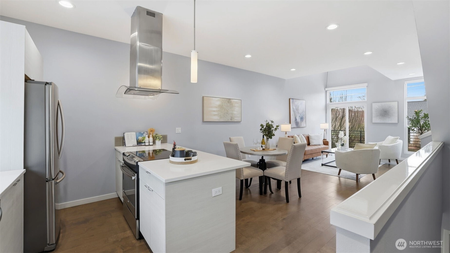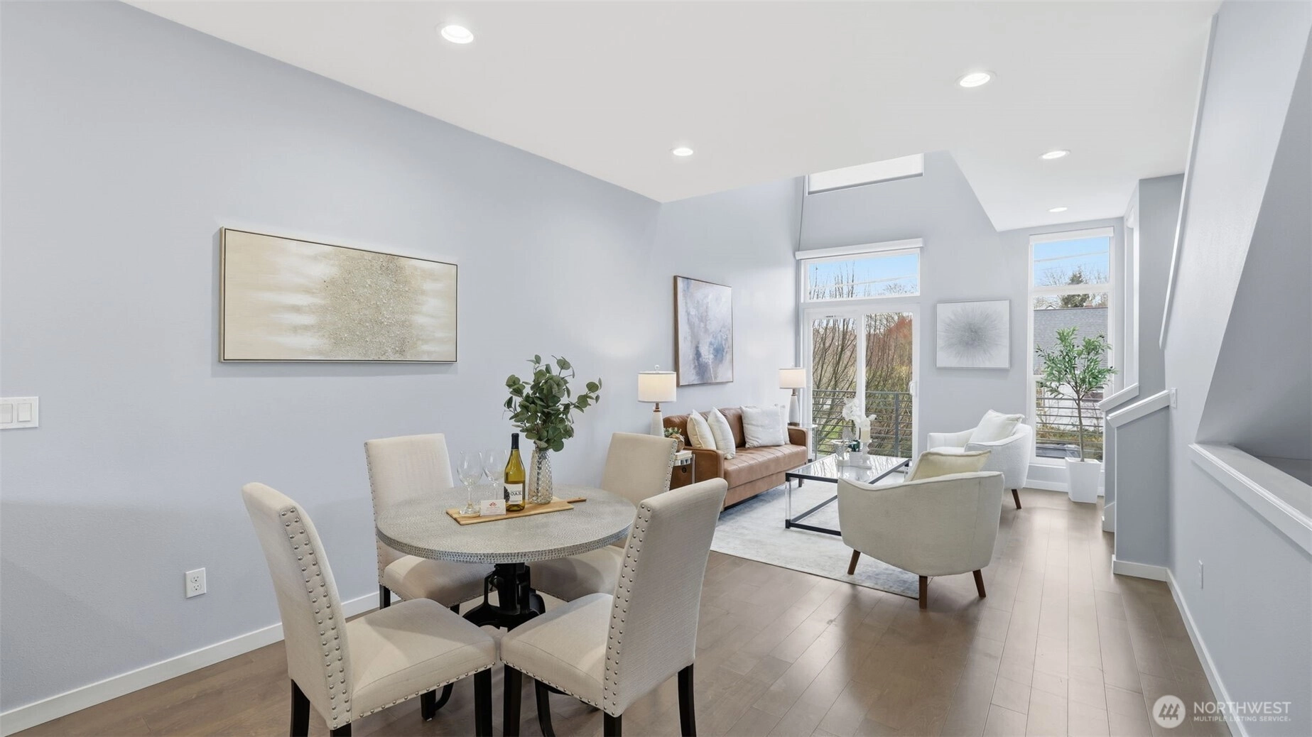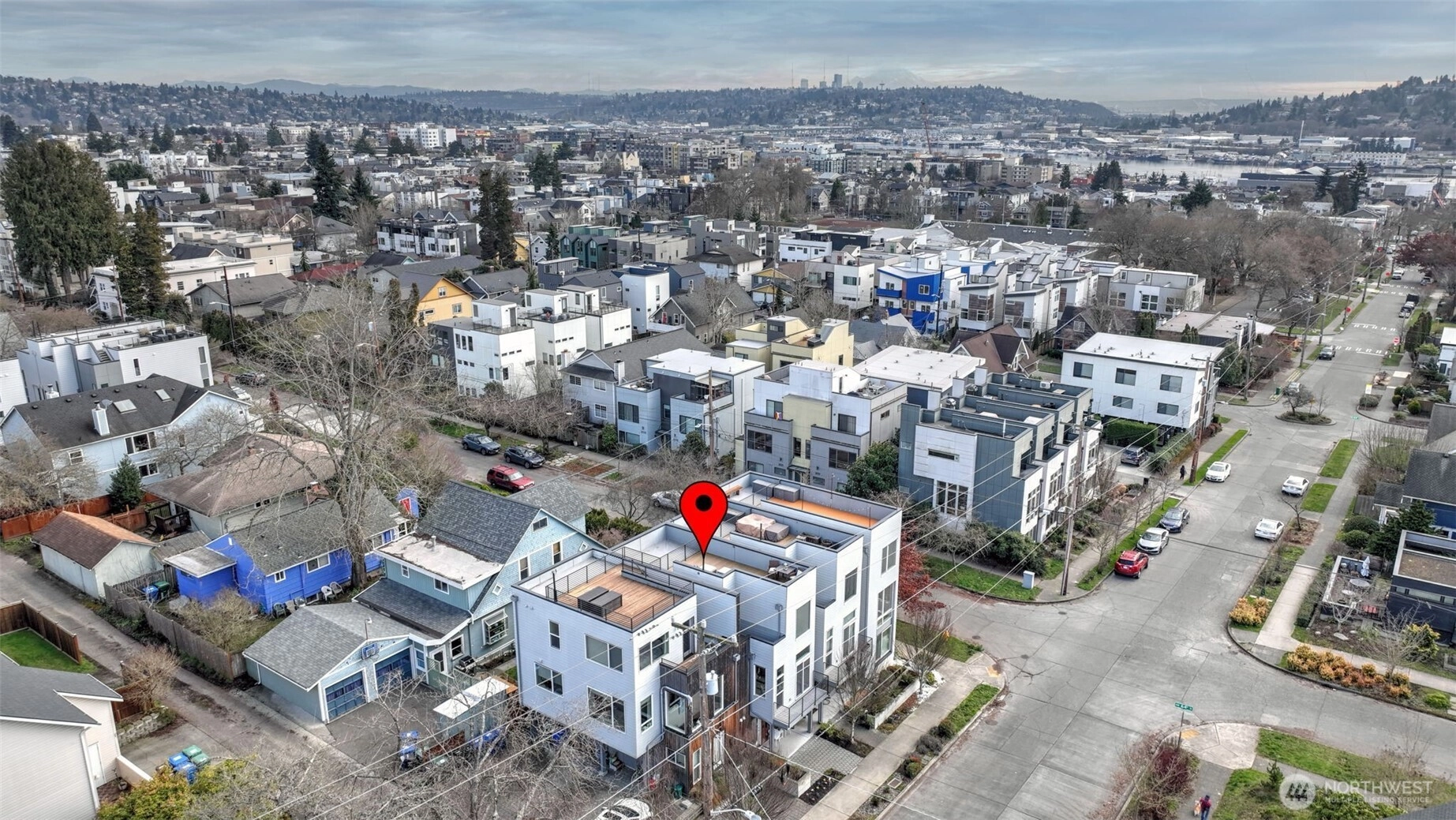 This roomy 3 level townhome is well located between Ballard and Loyal Heights just off 24th Ave NW. The 1440 SF of living space is expanded with an upper level 206 SF deck area providing an area for al fresco dining, entertaining or simply offering a private area with a view of DT SEA, Lk Union and Mt Rainier. The street level entry opens to a roomy den and a large BR with priv. patio. A full BA serves both areas. The 2nd level serves as the main living area with a "great room concept" combining the kitchen with counter seating, a dining area and living room area offering a spacious gathering area. The primary suite is located on the upper level with ensuite BA. One private parking spot with plentiful off street parking available. There is no HOA.