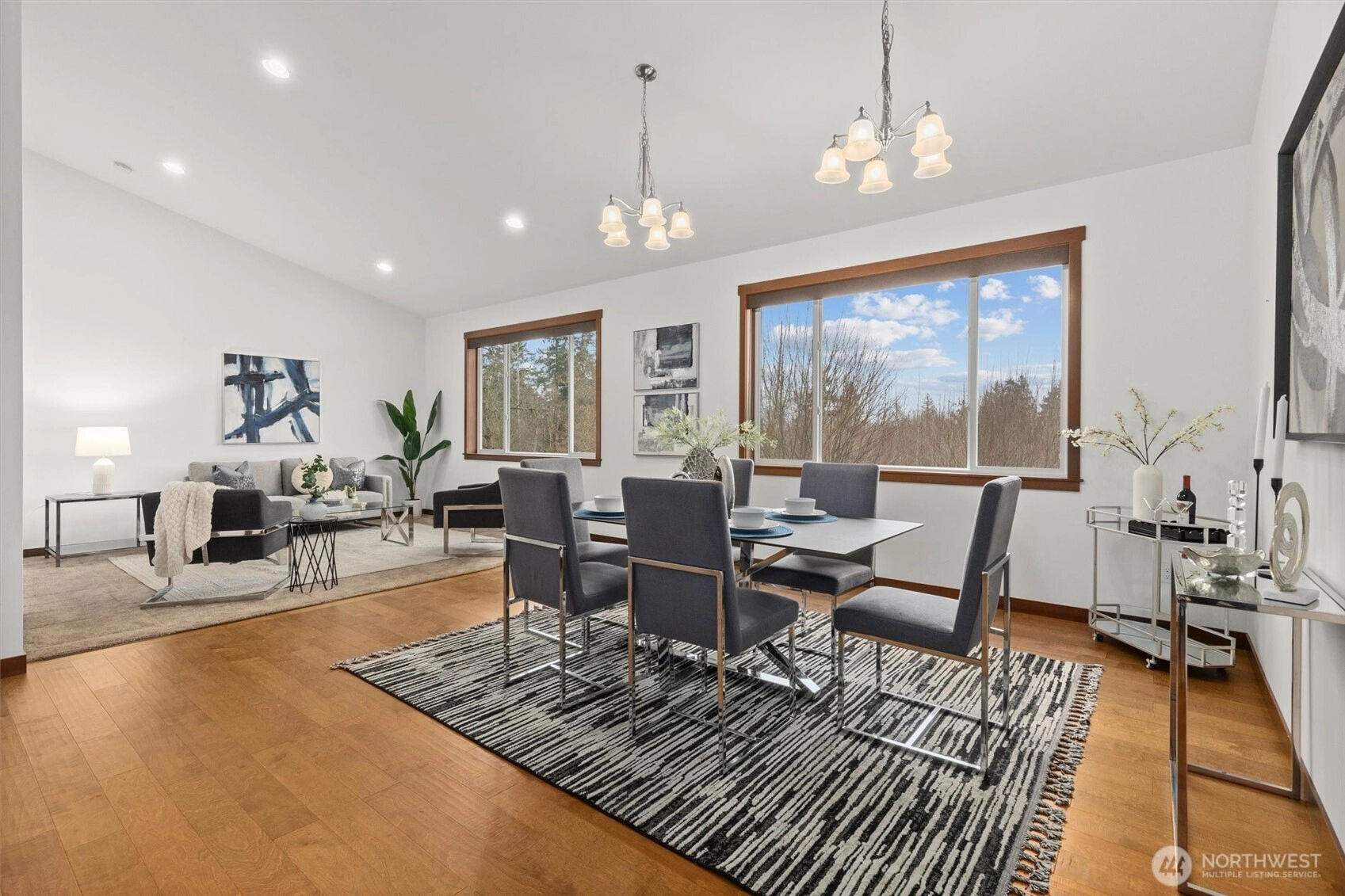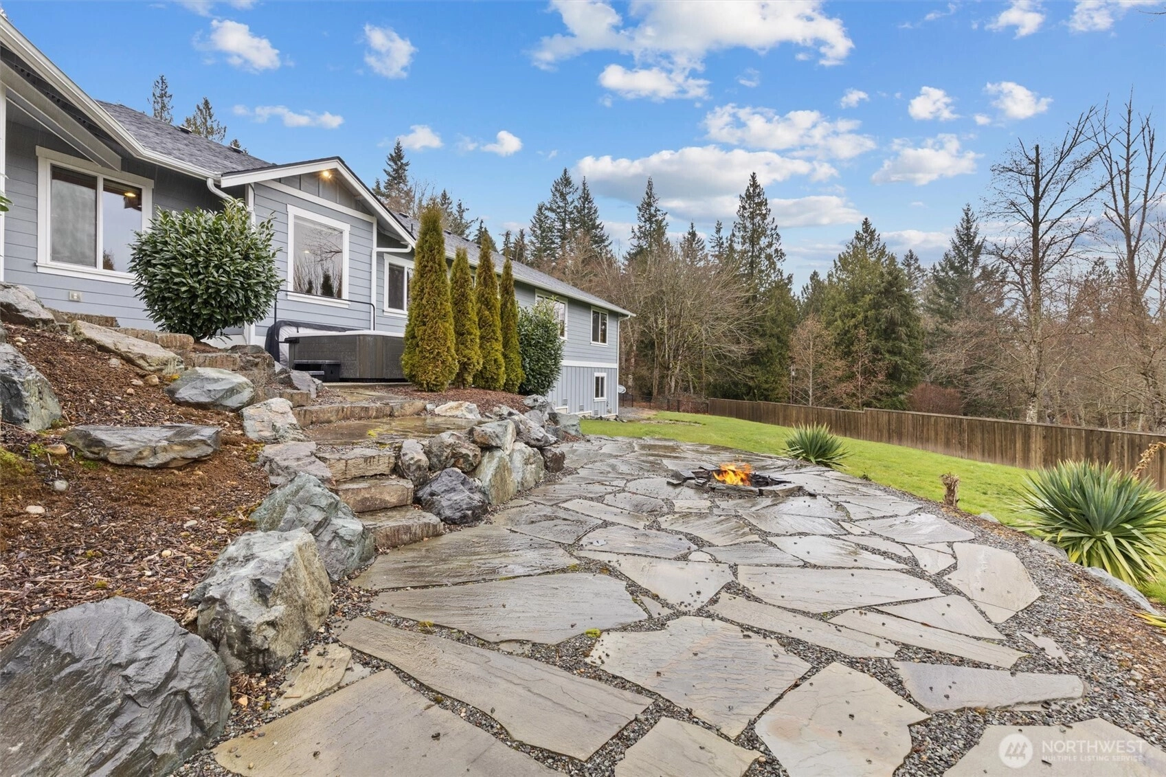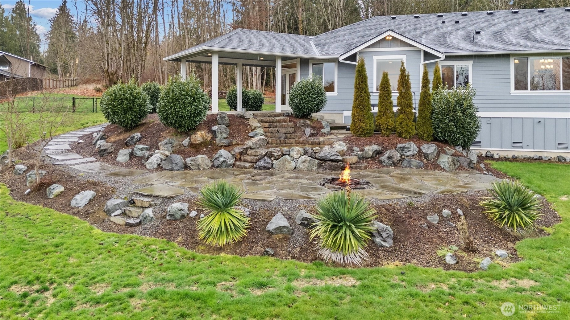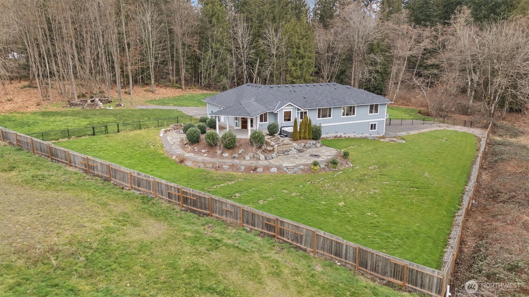 Discover the essence of PNW living in this stunning 2,560 sq ft rambler, privately gated and set on over 2+ acres of serene, park-like grounds. Surrounded by lush, impeccable landscaping and natural beauty, this exceptional property offers the perfect blend of sophistication, comfort, and retreat-style living. Designed for effortless entertaining, the home features formal living and dining spaces, a dedicated den, and an expansive open-concept kitchen and family room—the true heart of the home. Enjoy abundant cabinetry, a walk-in pantry, and a spacious eating area ideal for gathering, all flowing seamlessly into the inviting family room. Double doors extend your living space outdoors to a covered patio and hot tub—perfect for year-round relaxation while taking in tranquil views of the beautifully manicured, private backyard oasis. The expansive primary suite is a true sanctuary, complete with a large walk-in closet and spa-inspired 5-piece ensuite. Enjoy the feeling of a secluded estate retreat while remaining just minutes to I-5, premier shopping, dining, and entertainment. Not leased land. Complete with a spacious 3-car garage, this rare rambler offers timeless Northwest elegance, privacy, and convenience.