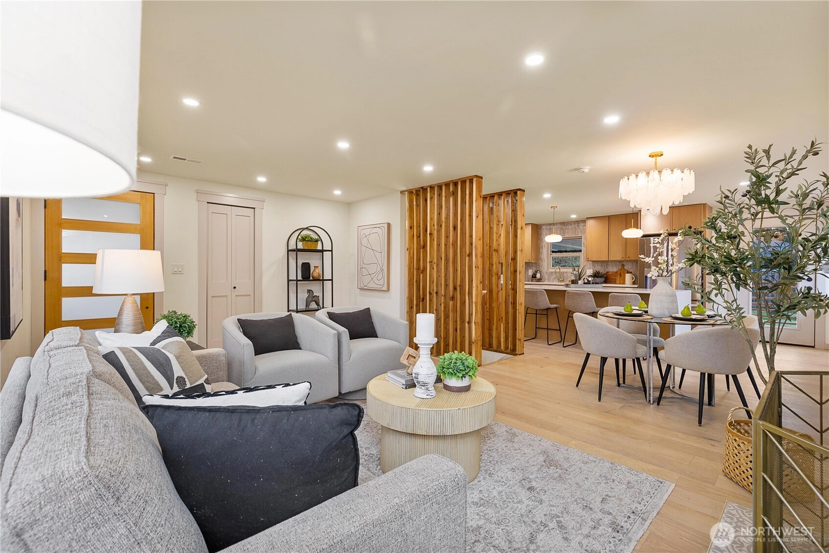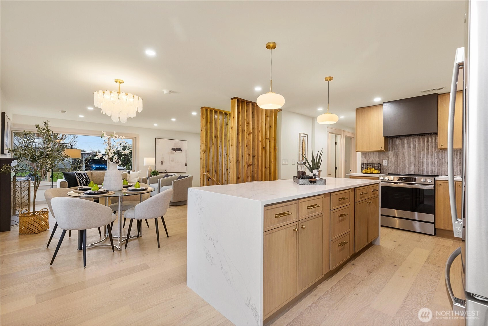 An idyllic setting rarely found in the coveted North Beach community, tucked along a quiet street lined with pristine homes—just moments to parks, schools, Swanson’s Nursery, and Blue Ridge Coffee House. Inside, discover a completely reimagined and fully updated home designed to feel warm, inviting, and effortlessly livable. The sun-filled living room with cozy fireplace flows seamlessly into the dining area and stunning brand-new kitchen, featuring warm oak cabinetry, a textured timeless tile backsplash, stainless steel appliances, and direct access to the new deck overlooking the spacious, level, freshly manicured yard. The primary retreat is thoughtfully tucked away, offering a spa-like ¾ bath that exudes elegance. A secondary bedroom and gorgeous new full bath complete the main level. Downstairs, enjoy exceptional flexibility with a large bonus room featuring a second fireplace and chic new wet bar—perfect for entertaining—plus two generous bedrooms, a full bath, and additional flex space. Extensively updated with new electrical, plumbing, roof, finishes, fixtures, and more. A sweet location paired with a gorgeous home!