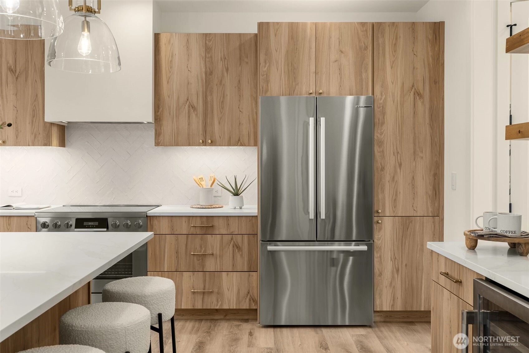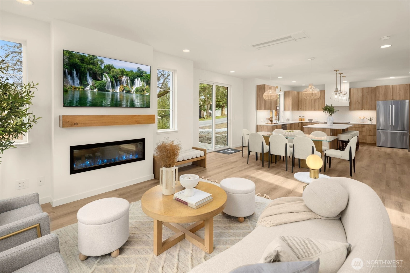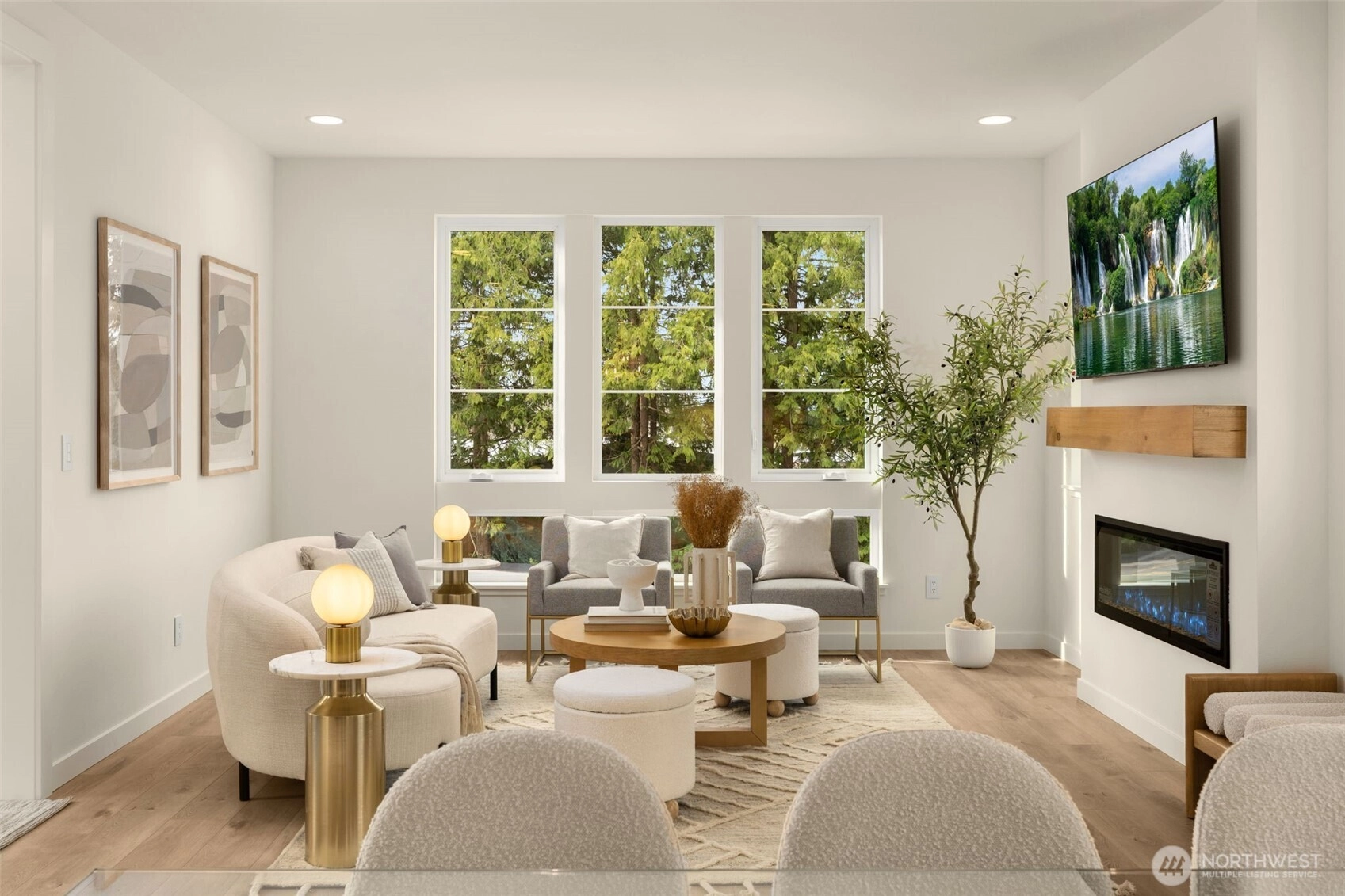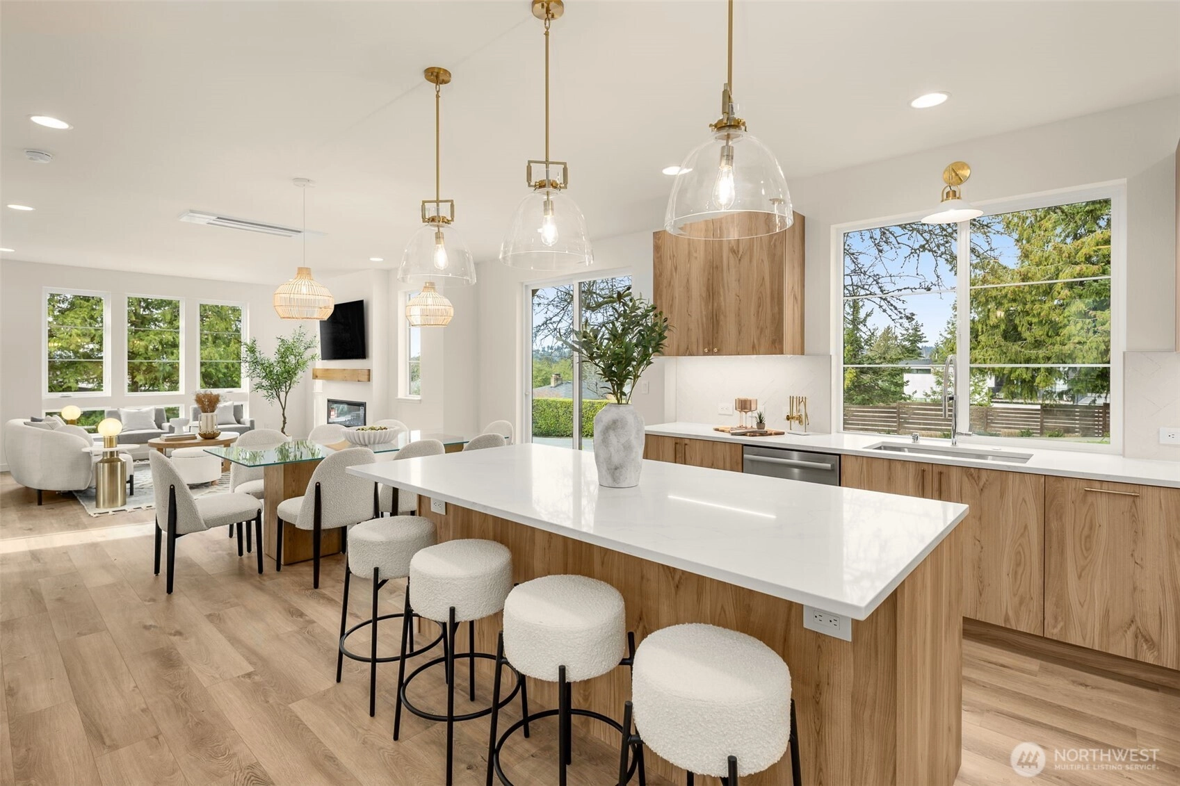 Modern design meets thoughtful craftsmanship in this newly built home by Mirra Homes, offering a bright, open layout designed for both everyday living and entertaining. The main level flows seamlessly from the living and dining areas into a kitchen, creating a space that feels open, functional, and inviting. Wide-plank hardwoods, clean architectural lines, and curated finishes carry throughout the home, reflecting quality construction and attention to detail. The kitchen serves as the heart of the home, featuring a generous island, Calacatta quartz countertops, custom Bellmont cabinetry, and Bosch appliances, including a 36” induction range. A dedicated wine and beverage center adds both style and convenience, making the space ideal for hosting, casual gatherings, or quiet evenings at home. Upstairs the primary suite offers a peaceful retreat with designer finishes, a spacious closet, and a spa-inspired bath with heated floors and thoughtfully selected tile. Two additional bedrooms provide flexibility for guests, a home office, or creative space, while a full bath and upper-level laundry room add everyday ease. Outside, enjoy the outdoor patio area perfect for relaxing or entertaining. Includes a 1-car garage and one designated parking space plus both parking garage/space are EV ready. Located minutes from DT Kirkland, parks, dining, waterfront access, major commuter routes, this home modern living with an established neighborhood feel.