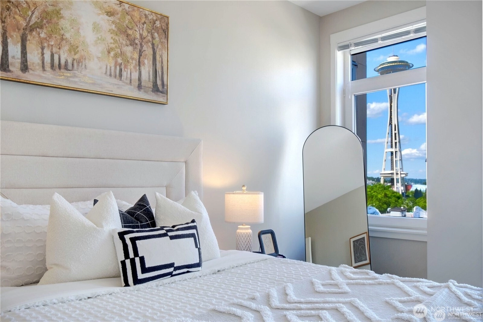 Don't miss this! Set within a premier Seattle building on a tree-lined street, this top-floor condominium offers refined urban living with iconic Space Needle views. The light-filled residence features multiple windows, a spacious bedroom, and a well-appointed layout designed for comfort and functionality. Stainless appliances anchor the kitchen, while in-unit washer and dryer, air conditioning, and a walk-in closet add everyday ease. The oversized bath and generous bedroom enhance the sense of space throughout. Residents enjoy a professionally managed building with concierge services, a beautiful entry, resident lounge, fitness center, guest suite, rooftop deck, and street-level patio. Dedicated parking and storage are included along with community bike storage. Ideally located near Pike Place Market, the Sculpture Park, and Seattle’s renowned arts, dining, and performance venues, this home places the city’s cultural and recreational offerings just moments away—while still providing a serene residential setting. Strong HOA and no rental cap!