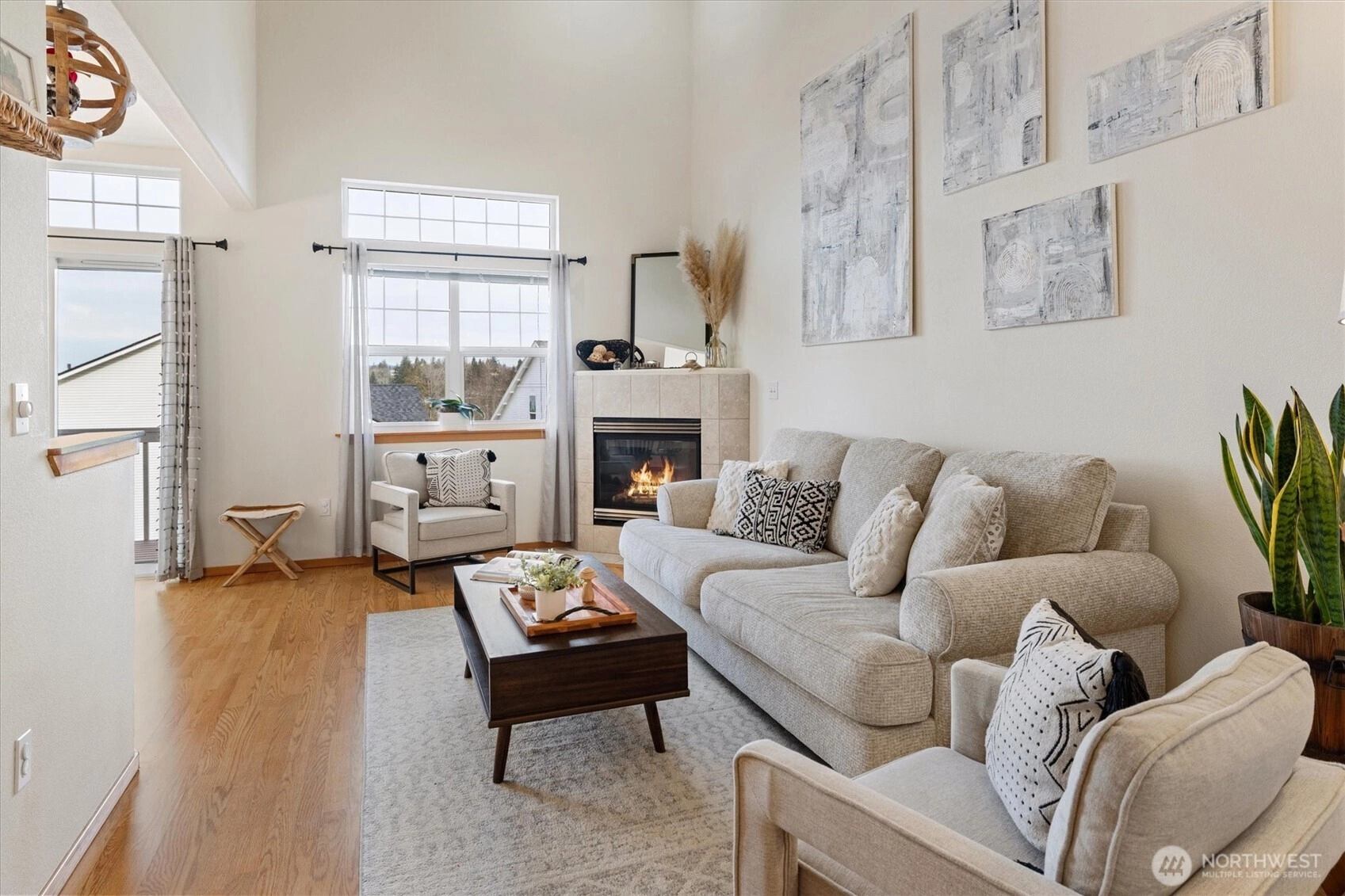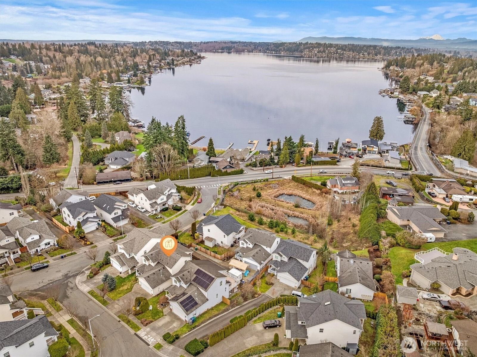 Wake up to shimmering lake views and fall in love with life in Lake Stevens! This inviting 3-bedroom, 2.5-bath air-conditioned home is thoughtfully designed to maximize comfort, space, and connection to its beautiful surroundings. The main floor welcomes you with a light-filled living and dining area centered around a cozy gas fireplace—perfect for everyday living or relaxed entertaining—while expansive windows and the adjoining deck frame tranquil views of Lake Stevens and create a seamless indoor-outdoor experience. The primary bedroom is conveniently located on the main level and offers a private retreat complete with a full ensuite bath. Upstairs, you’ll find two generously sized bedrooms, along with a versatile open loft area ideal for a home office, media room, or gaming space. A full bath and dedicated utility room with washer and dryer complete the upper level, offering both functionality and flexibility. Tucked away on a quiet cul-de-sac, the property also enjoys direct access to a neighborhood park pathway—perfect for evening strolls, playtime, or simply enjoying the outdoors. All of this is set in the heart of Lake Stevens, a community known for its small-town charm, top-rated schools, scenic beauty, and easy access to parks, trails, shopping, and dining. Whether you’re drawn to the lake lifestyle, the peaceful neighborhood setting, or the thoughtful layout of the home itself, this is a place where you can truly settle in and enjoy.