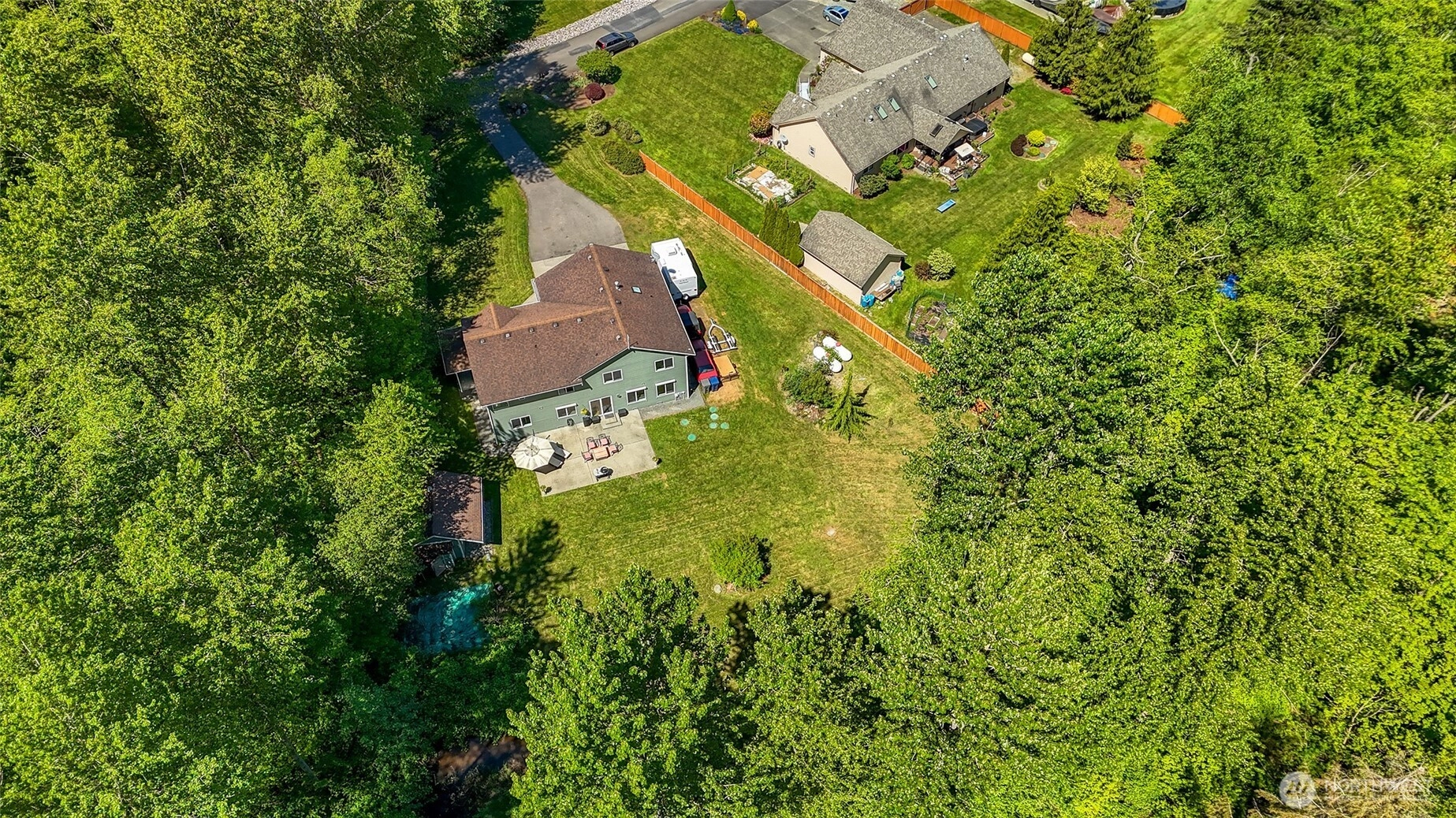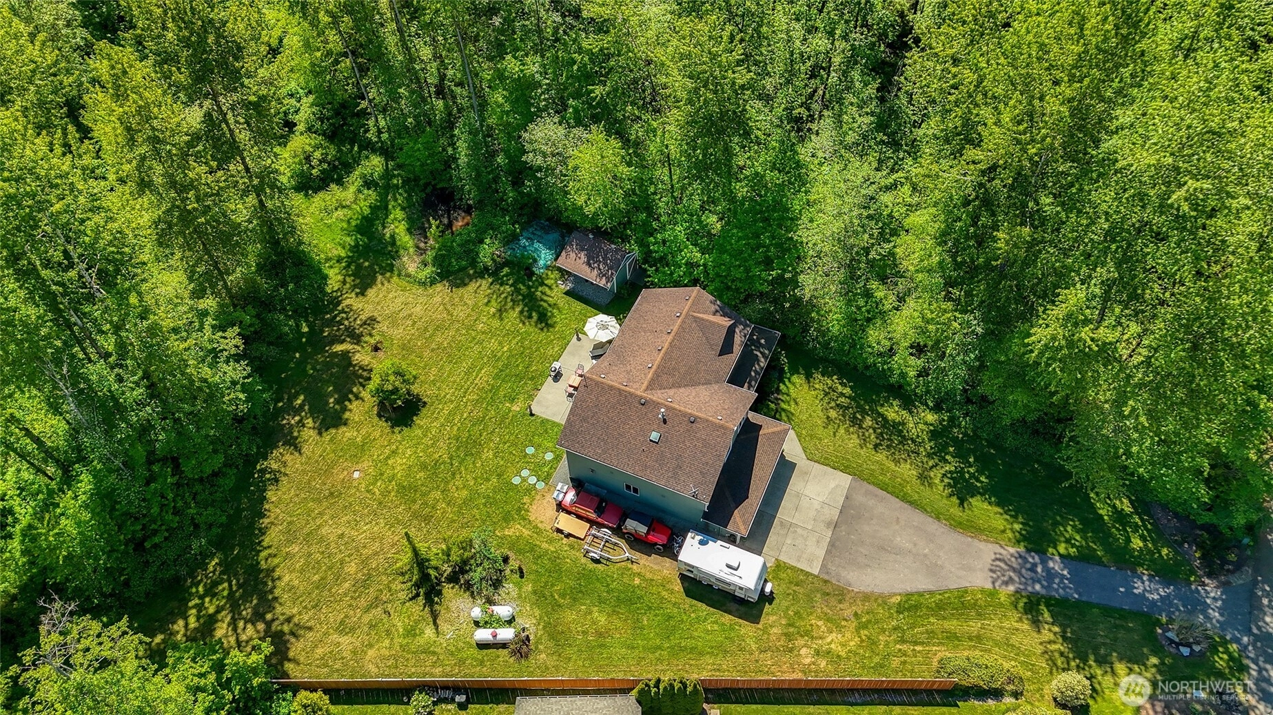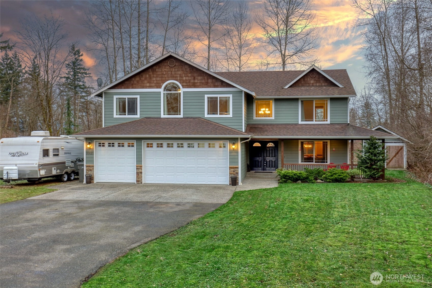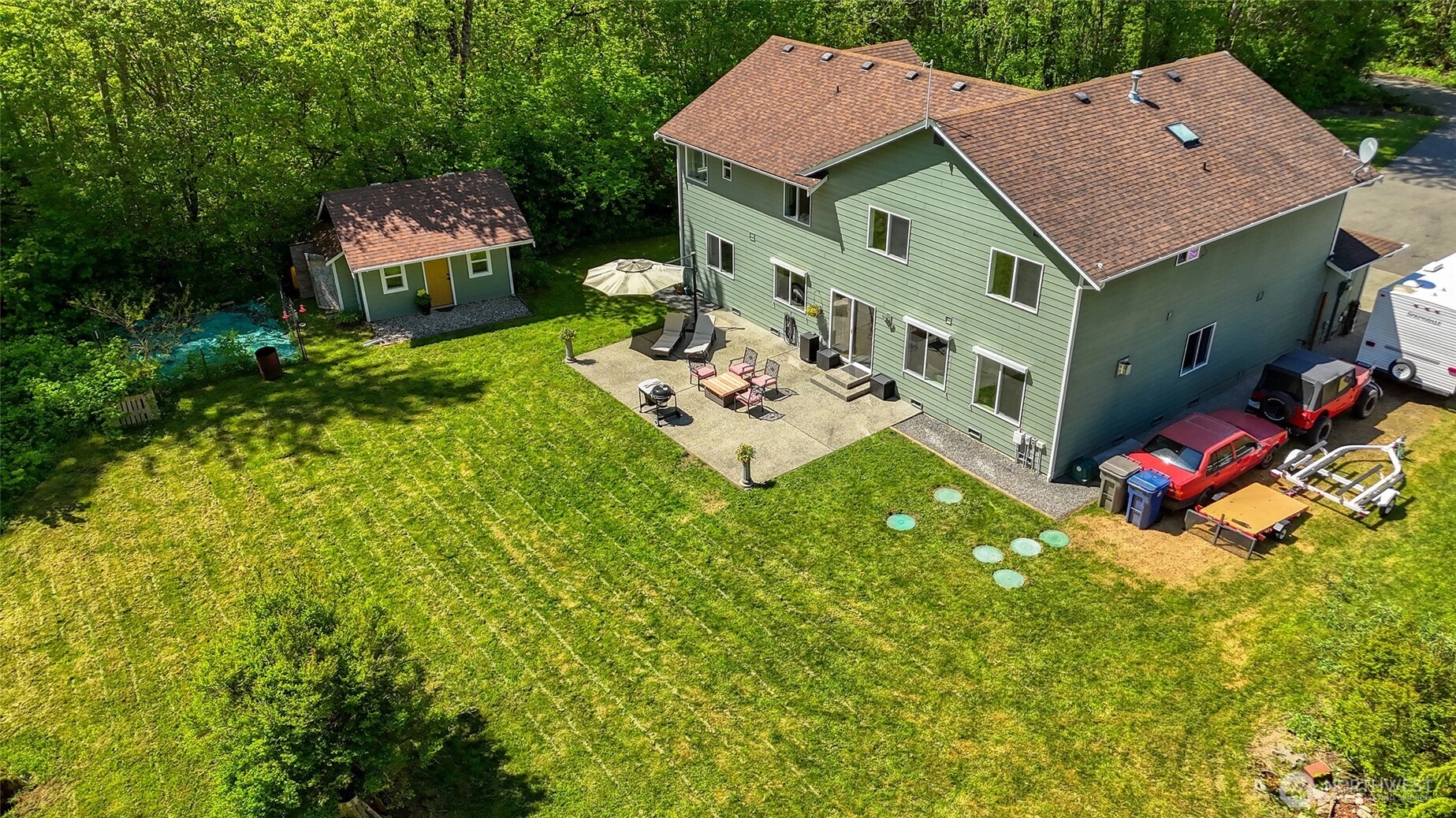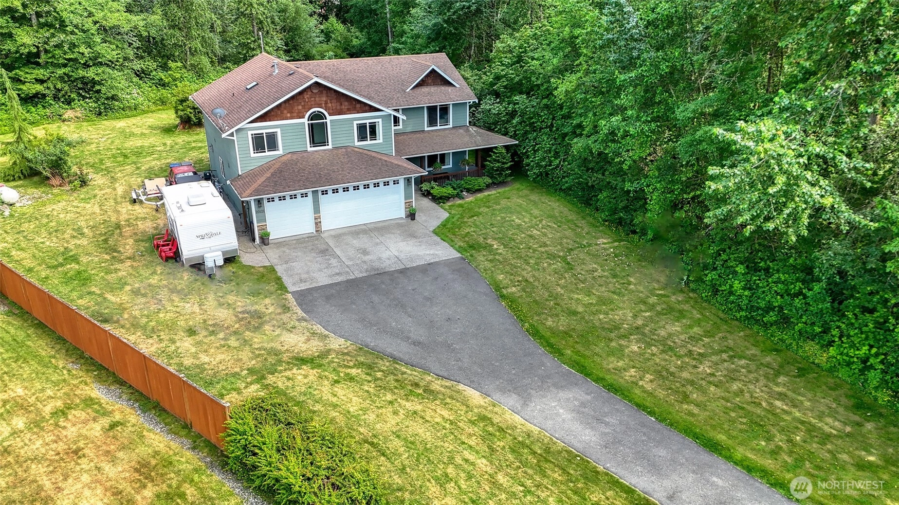 Set on a full, level acre backing to peaceful woods, this beautifully maintained Craftsman offers the perfect blend of privacy, space & everyday luxury. A welcoming covered front porch captures northwest sunsets, while vaulted ceilings & abundant natural light create an inviting first impression. The thoughtfully designed main level features formal living room & dining room, a comfortable family room & a kitchen positioned at the heart of the home, ideal for both daily living & entertaining. The updated kitchen showcases quartz countertops, stainless steel appliances, classic subway tile backsplash & easy access to the backyard patio for seamless indoor-outdoor gatherings. An oversized 3-car garage with room for a workshop, while a main-level powder room adds functionality. Upstairs, the expansive primary suite offers vaulted ceilings, a walk-in closet & a spa-like 5-piece bath with a multi-head walk-in shower designed for relaxation. Three additional bedrooms, a full bath & a generous bonus room provide flexible space for guests, work or play. Outdoors, enjoy a wide open acre with room to roam, a large outbuilding for tools or toys & RV parking with power & water hookups. Located just minutes from shopping, everyday amenities & quick freeway access, this property delivers serene country living without sacrificing convenience.