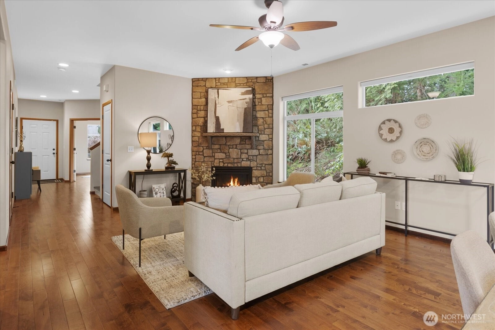 Enjoy mountain and valley views from this beautiful 5 bedroom home! The expansive kitchen features an eating bar, dining nook, walk-in pantry, granite tile counters, and a striking hammered copper sink - perfect for everyday living and entertaining. The light-filled living room offers a gas fireplace, high ceilings, and an abundance of windows, with an adjoining formal dining area for special gatherings. Hardwood floors span the main level, complemented by double doors leading to a private office. The oversized primary suite provides a peaceful retreat with a double vanity, soaking tub, separate shower, and a spacious walk-in closet. The upper level also includes durable vinyl plank flooring, a full bath with double vanity, huge laundry room, a little flex space and tons of storage. Step outside to a large covered patio and gazebo with hot tub, creating a private outdoor oasis, surrounded by a lush green-belt... ideal for relaxing or entertaining. Additional highlights include air conditioning, newer exterior paint, and featuring a maintenance free lawn with Dream Turf. In a prime location near parks, schools, shopping, dining, and entertainment. This exceptional home offers comfort, style and privacy... welcome home!