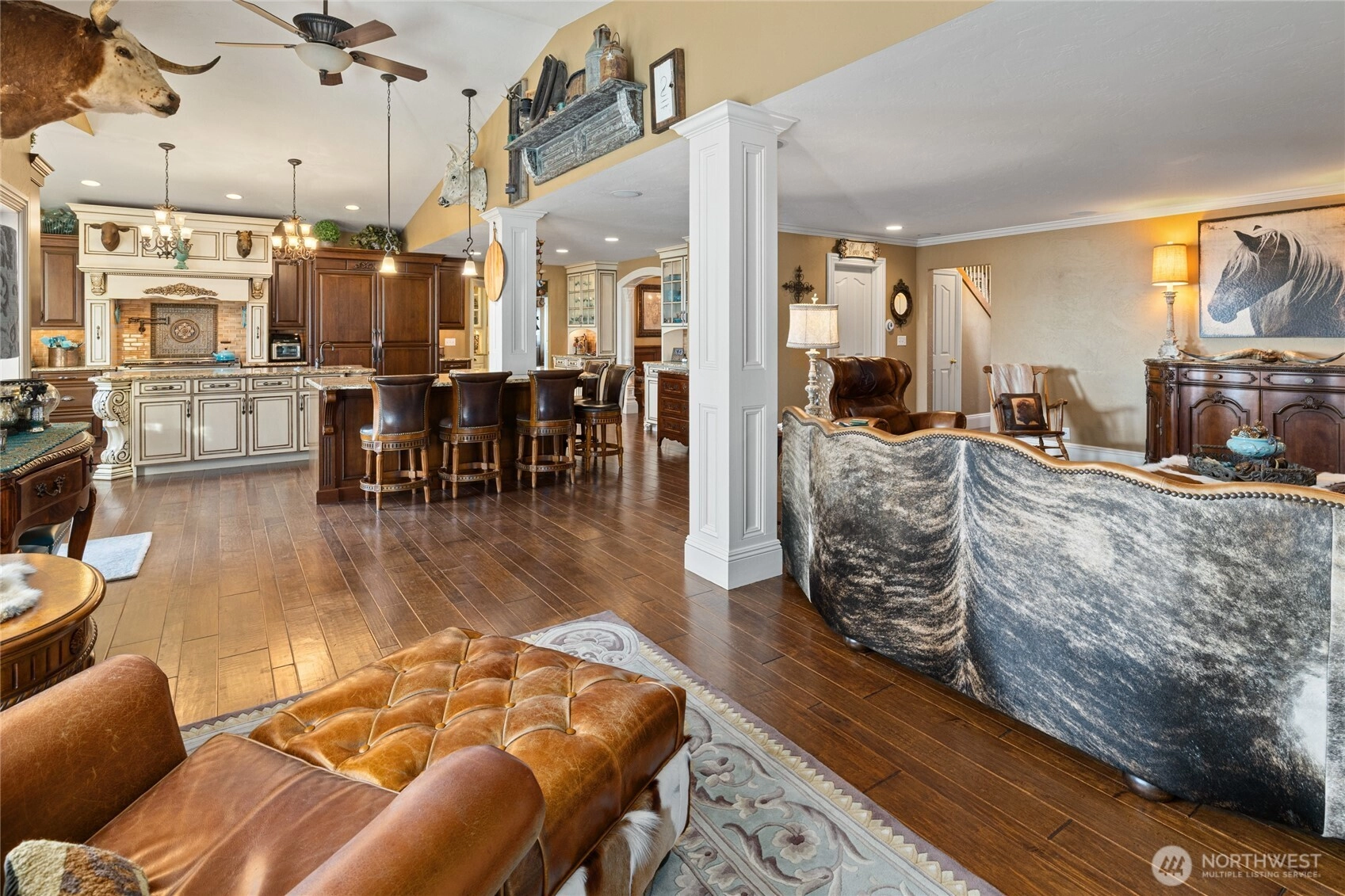 Custom legacy home on 5 irrigated acres in Manastash Ridge, just outside Ellensburg. This 4,157 sq ft high-end residence offers freedom with no HOA or CCRs, KRD irrigation, and room to live, work, and grow. The home features 4 bedrooms and 2.75 bathrooms, with custom millwork, hand-scraped hardwoods, vaulted ceilings, and abundant natural light. The chef’s kitchen includes a 6-burner gas range, commercial fridge, double ovens, granite countertops, oversized island, butler’s pantry, and custom cabinetry. Living spaces include a great room with gas fireplace and an office with electric fireplace. A large bonus room with built-ins can serve as a recreation room, home business, or educational space. The primary suite features a spa-like bath with heated tile floors and walk-in shower. 13 custom California Closets provide exceptional organization. The two-story detached garage/shop offers 1,500 sq ft with epoxy floors and built-in cabinetry, plus 890 finished sq ft upstairs. A 70-panel, 15kW solar array adds efficiency. The fenced yard features underground sprinklers, mature landscaping, greenhouse, wrap-around porch, covered patios, multiple outbuildings, and a brand-new Bullfrog hot tub/spa, all with privacy and mountain views.