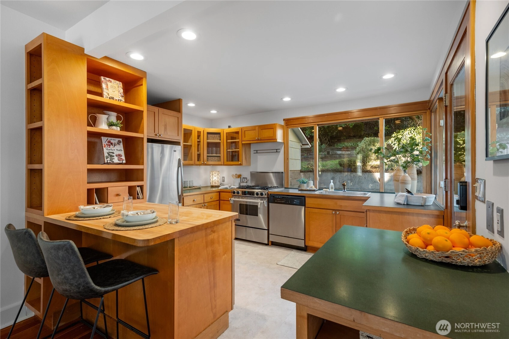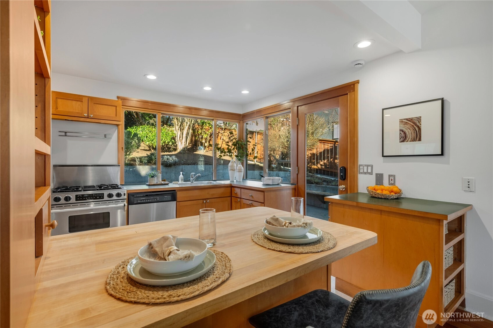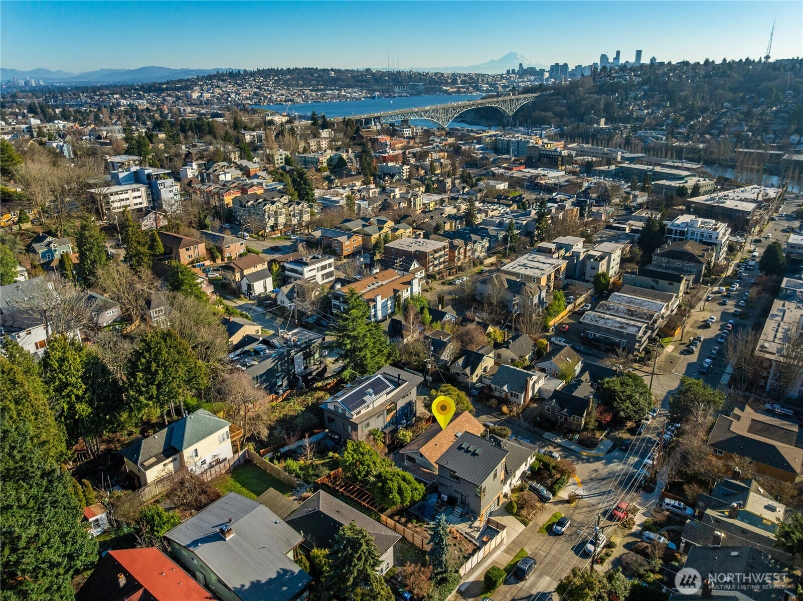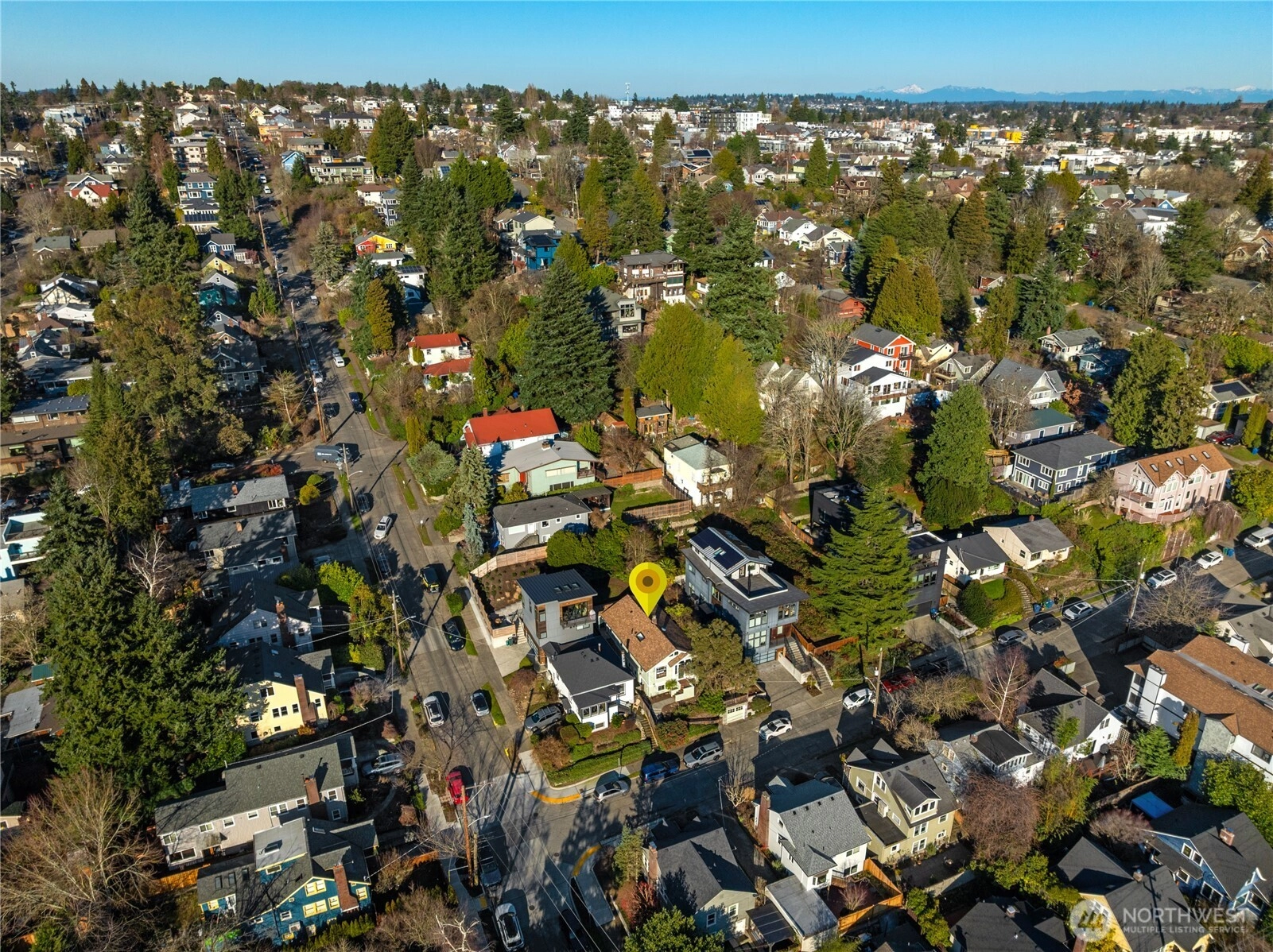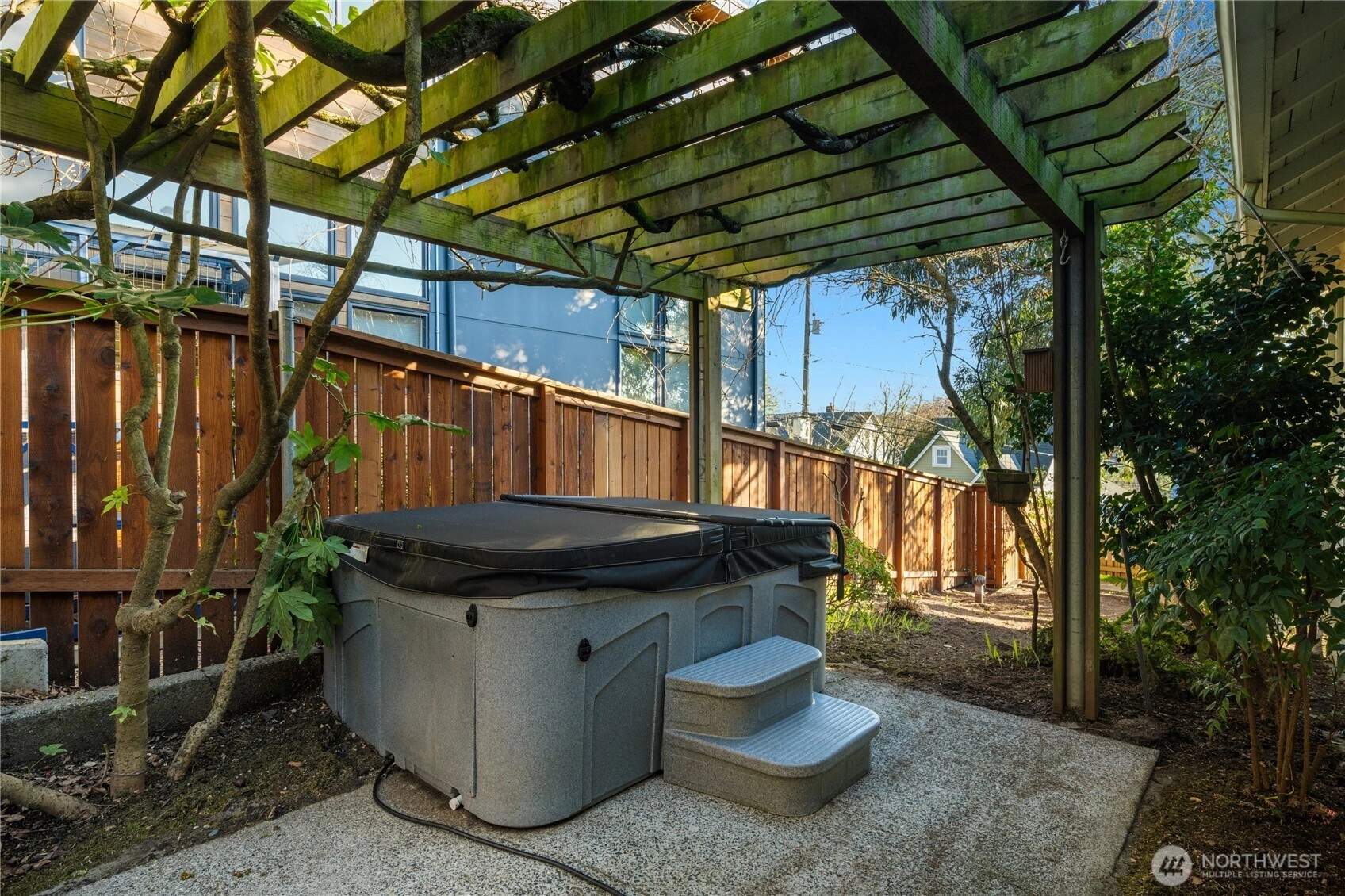 When a home has been loved, it is very obvious as it stands out from the crowd. 406 N Bowdoin Pl is no exception as it stands out in many ways! Sitting above the street and facing south provides privacy, and more, abundant natural light. Views of Mt. Rainier and New Years Eve’s Space Needle fireworks seen from the front bedroom never disappoint. Take a deep breath and enjoy not having to worry about the roof over your head, literally because it’s brand new (as is the hot water heater, carpet, vanity and flooring in the main bathroom, and paint throughout the entire home). The warmth of fir floors greets you at the enclosed porch, where you can sit down to take off your shoes, put on your slippers, and hang up your coat. I love this porch! Windows line the side of the home, looking over the large side and back yard, where a soak in the hot tub under the wisteria arbor beckons you nightly. The open, spacious, and highly functional kitchen has a door leading to the side and back patio, where garden parties flourish. There’s even a little shed for your garden tools! Two bedrooms on the main level make a lot of sense, and if you need some privacy, head downstairs where the 3rd bedroom and family room provide quiet spaces, perfect for a home office or a movie night. And don’t miss the oversized wine cellar! Located on one of Fremont’s best streets, you’ll be surprised to learn just how walk-able you are to all things Fremont. SO close, yet just far enough away to still be quiet.
