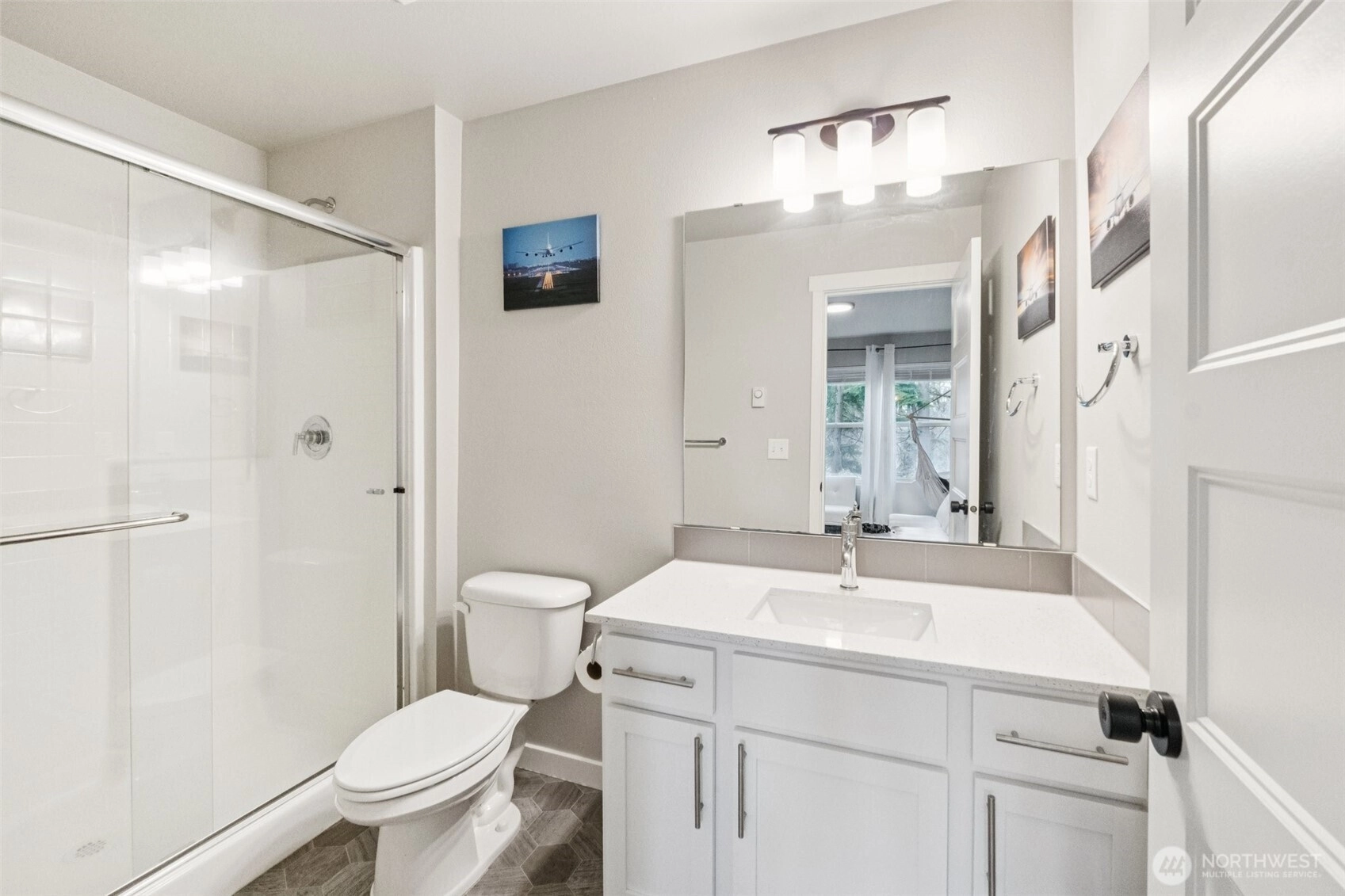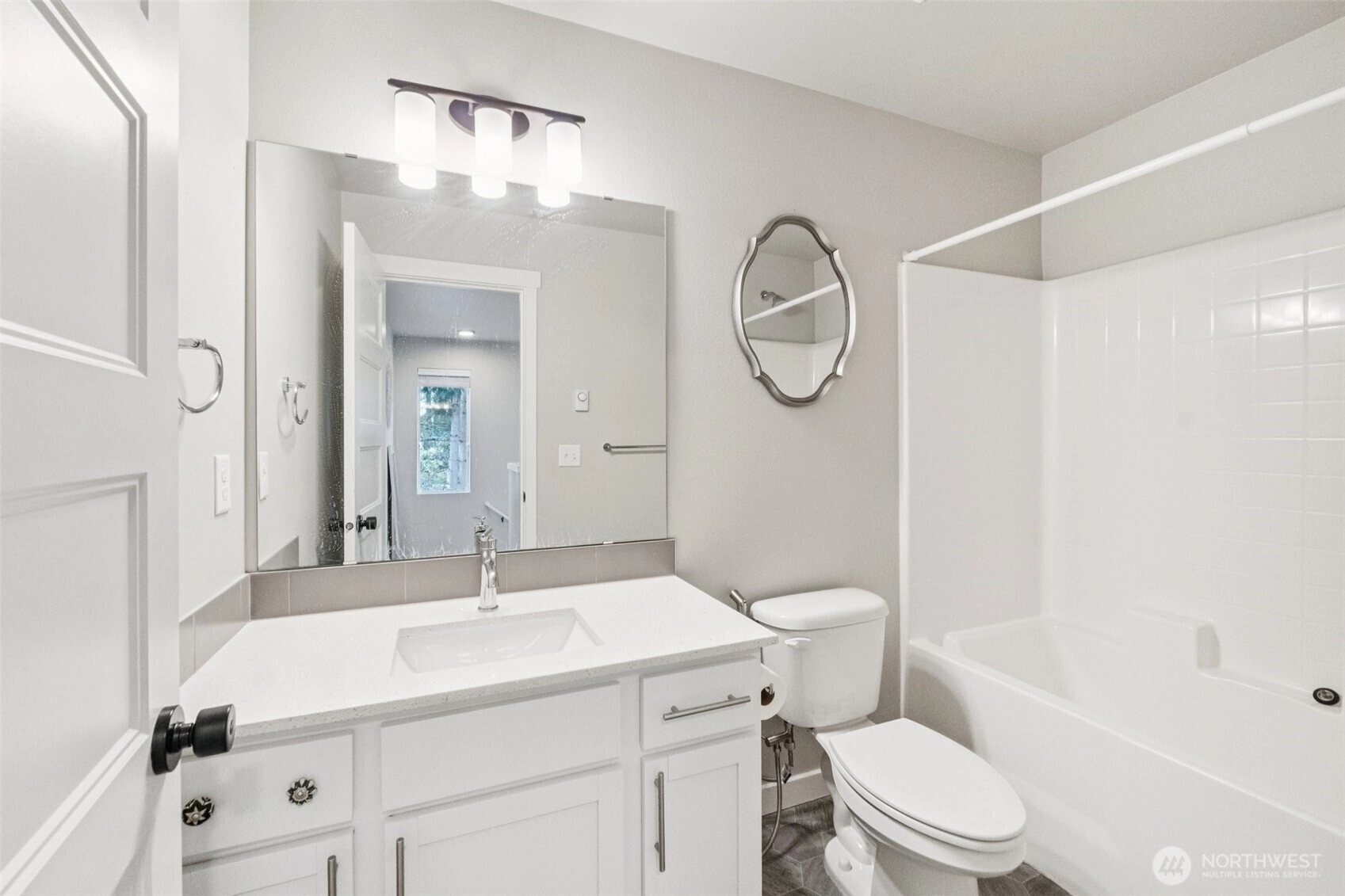 Welcome to Ladera! Built in 2021, this desirable end-unit townhome offers privacy and tranquility, backing to a protected greenbelt at the edge of the community. The 2,061 sq ft Allyn plan features 4 bedrooms, 3 bathrooms, and a 1-car garage, combining modern design with functional living. Premium interior finishes include laminate hardwood flooring, white millwork and doors, contemporary iron railings, and quartz countertops. The lower level features a private bedroom with an attached bathroom—ideal for guests, a home office, or multigenerational living. The main level showcases a spacious open-concept layout connecting the kitchen, dining nook, and great room, with access to a private deck overlooking the greenbelt. Upstairs, the primary suite offers a walk-in closet and a beautifully tiled shower with a dual showerhead system, along with two additional bedrooms, a full bath, and convenient laundry. Centrally located in Lynnwood with easy access to highways, shopping, dining, and amenities. Extremely energy-efficient with low-maintenance living, modern safety features, and EV-charging-ready garage—designed for today’s lifestyle!