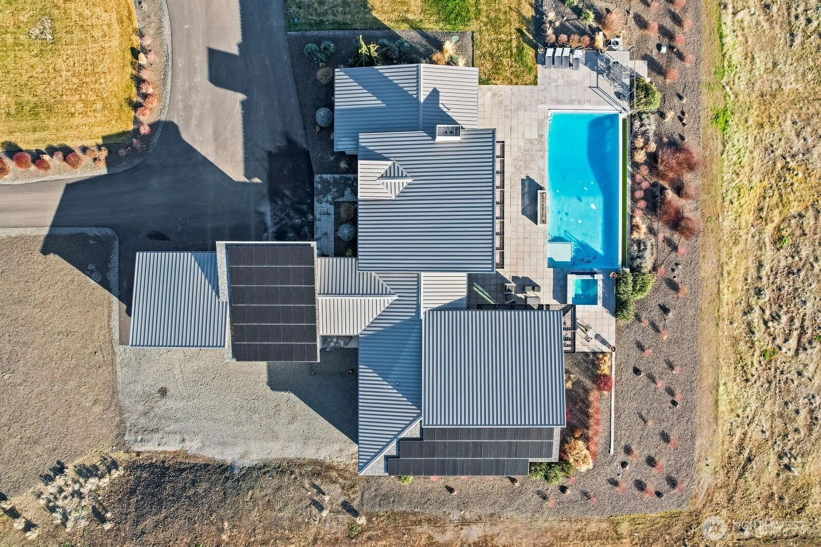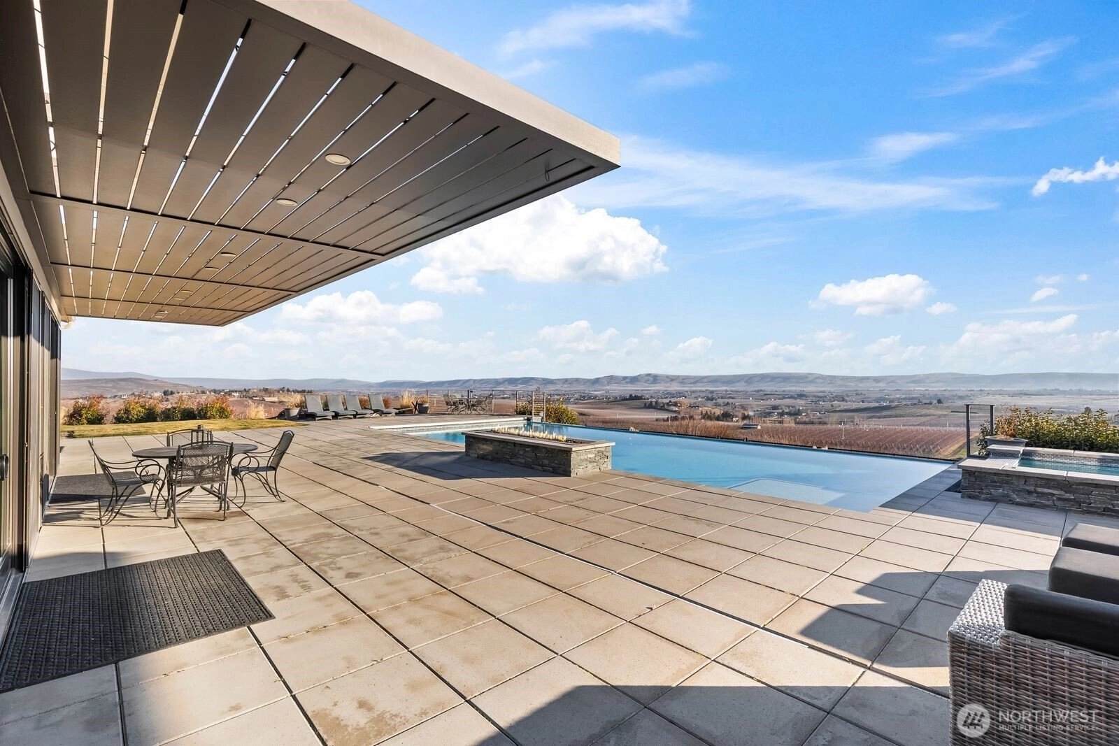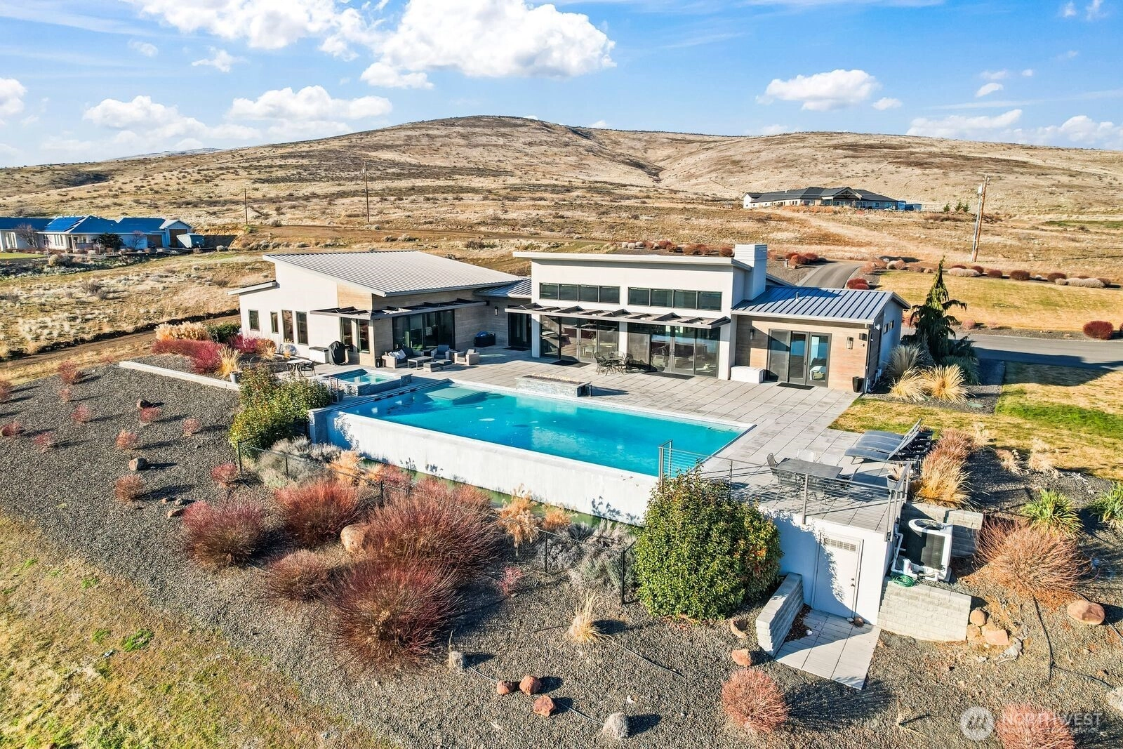 Perched above the valley, this custom modern residence is where architecture meets atmosphere. Designed to frame sweeping panoramic views, the home offers four bedrooms, three and a half baths, and an effortless indoor-outdoor flow that elevates everyday living. Set on 3.8 acres, the property unfolds like a private retreat, complete with a striking infinity pool, spa, and expansive shop for hobbies, storage, or creative pursuits. Clean lines, intentional design, and curated finishes define the interiors, complemented by thoughtful amenities such as an indoor steam sauna and integrated solar panels that support both comfort and efficiency. Walls of glass invite the valley below to become part of the experience. This is more than a home. It is a vantage point, a lifestyle, and a statement.
