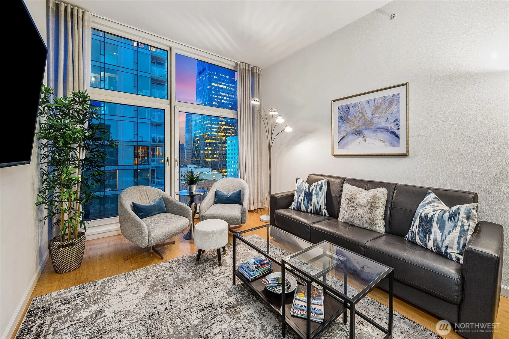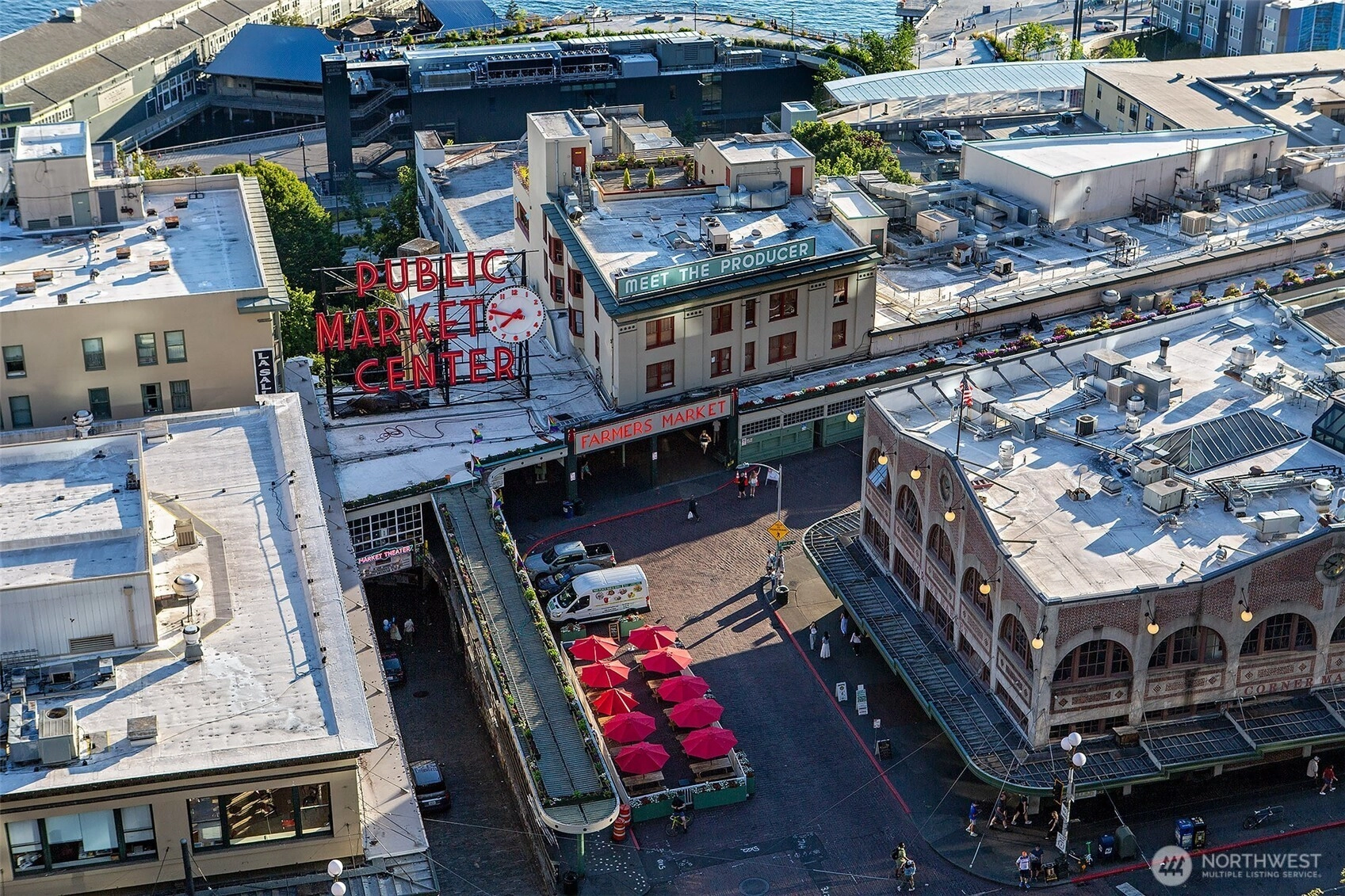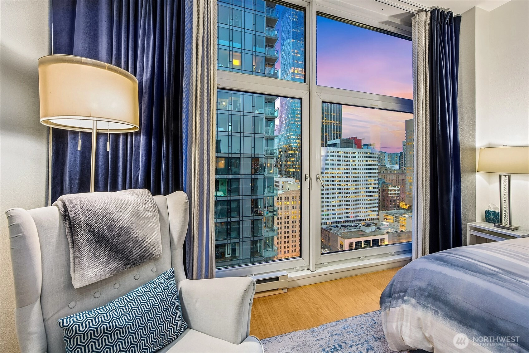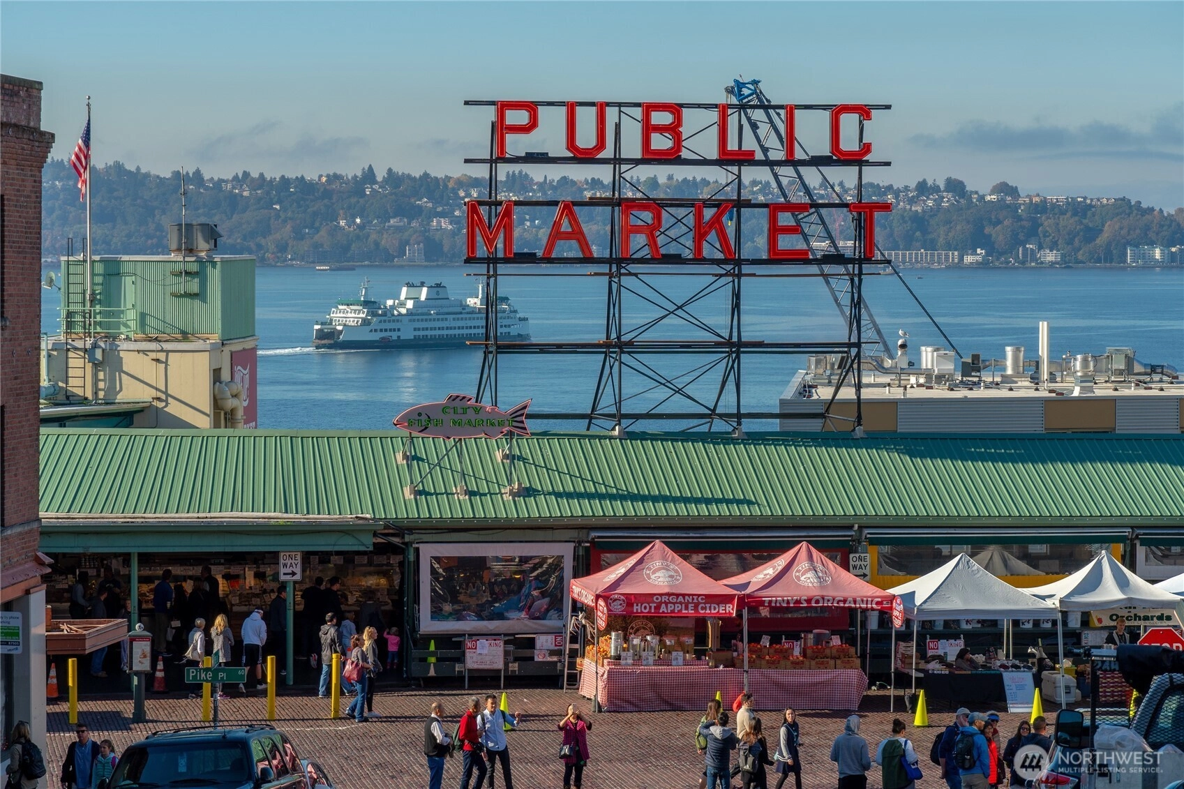 Penthouse Perfect Vacation Getaway with Spectacular City Views at Newmark Tower. Welcome to your dream home/vacation retreat in the heart of downtown Seattle. 25th floor jewel box, Best location, 100 walk & transit score, just a block from Pike Place Market, SAM, Symphony & Light Rail. Spacious open floor plan ~ near 800 sqft, 11 ft floor to ceiling windows, modern remodel, new appliances, paint & lighting. Marble en-suite, full-sized laundry, abundant storage and huge closet, massive bedroom with glorious city views from floor to ceiling windows, hardwood throughout. Ideal as a primary, second home, weekend escape, or for hosting visitors for 2026 World Cup! 24/7 concierge, Indoor pool, hot tub, sauna, owners lounge, gym, biz ctr. 1 parking, 1 storage. No Rental Cap, AirBnB friendly -5* host rated.