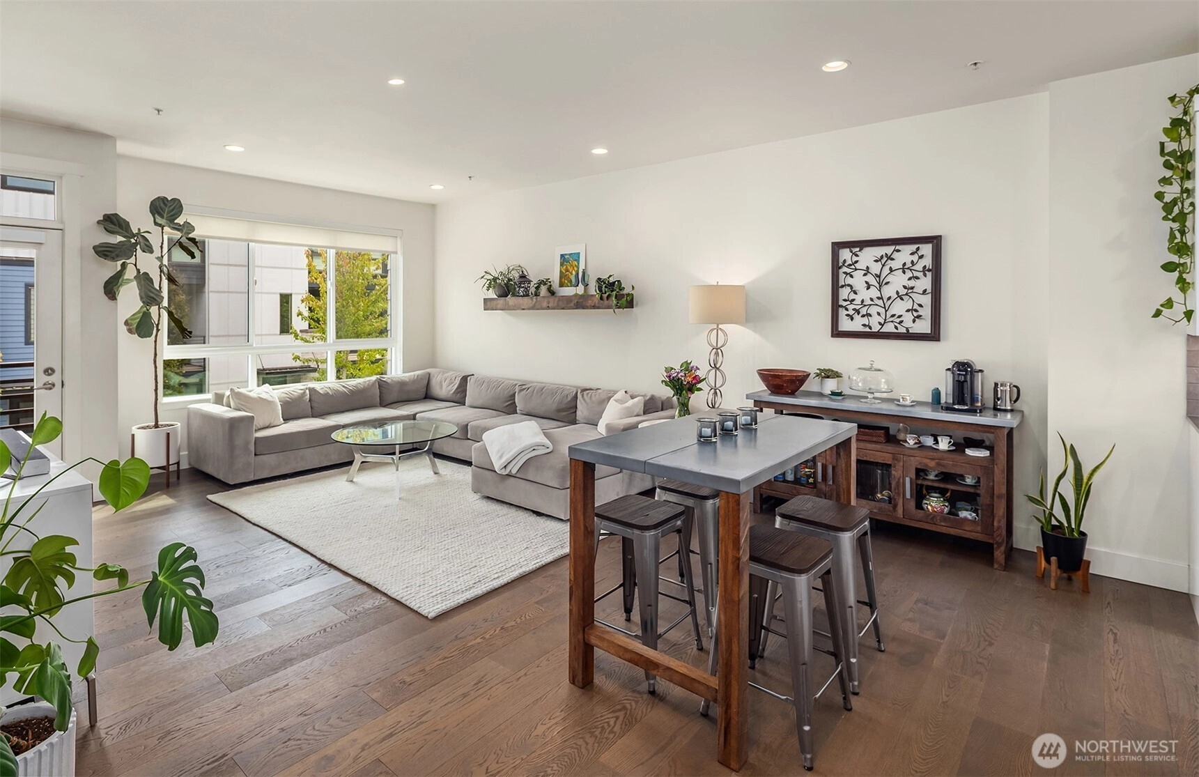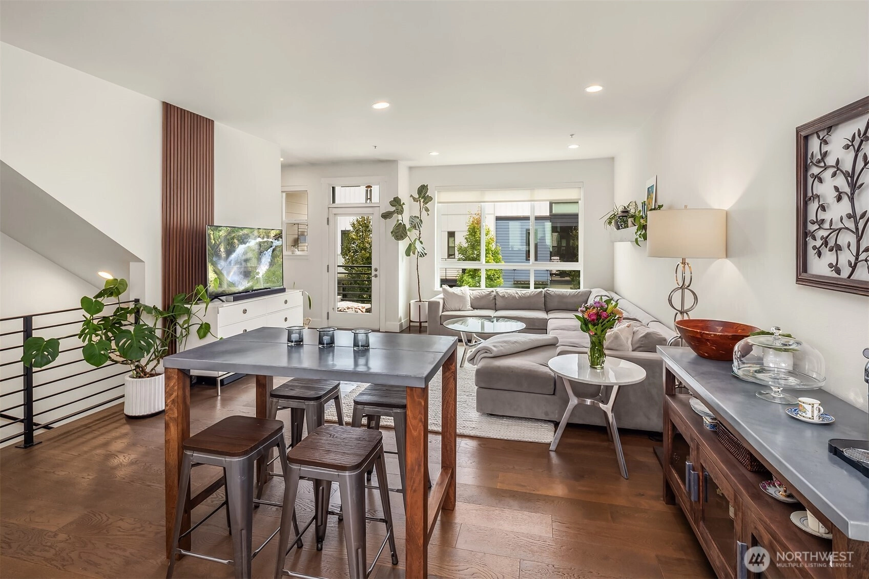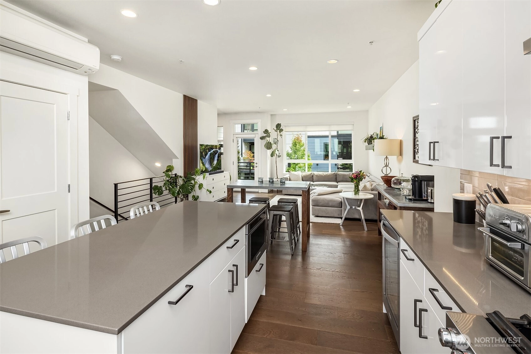 Spacious three-level townhome located in the highly sought-after Northshore School District, offering 1,537 square feet with 3 bedrooms and 3 bathrooms. South-facing, floor-to-ceiling windows fill the home with natural light, highlighting the open and flexible floor plan. The main level includes a convenient 3/4 bath, while the lower level offers a private guest bedroom or home office. The kitchen is thoughtfully designed with slab quartz countertops, an oversized island, stainless steel appliances, under-cabinet lighting, and a built-in beverage fridge. Hardwood floors, wrought-iron railings, split air conditioning units, and an EV-charger-equipped two-car garage enhance both comfort and functionality. Enjoy a private balcony and a prime Bothell location with easy access to downtown, shopping, dining, and transit.