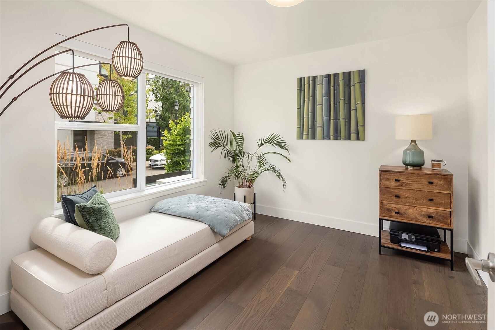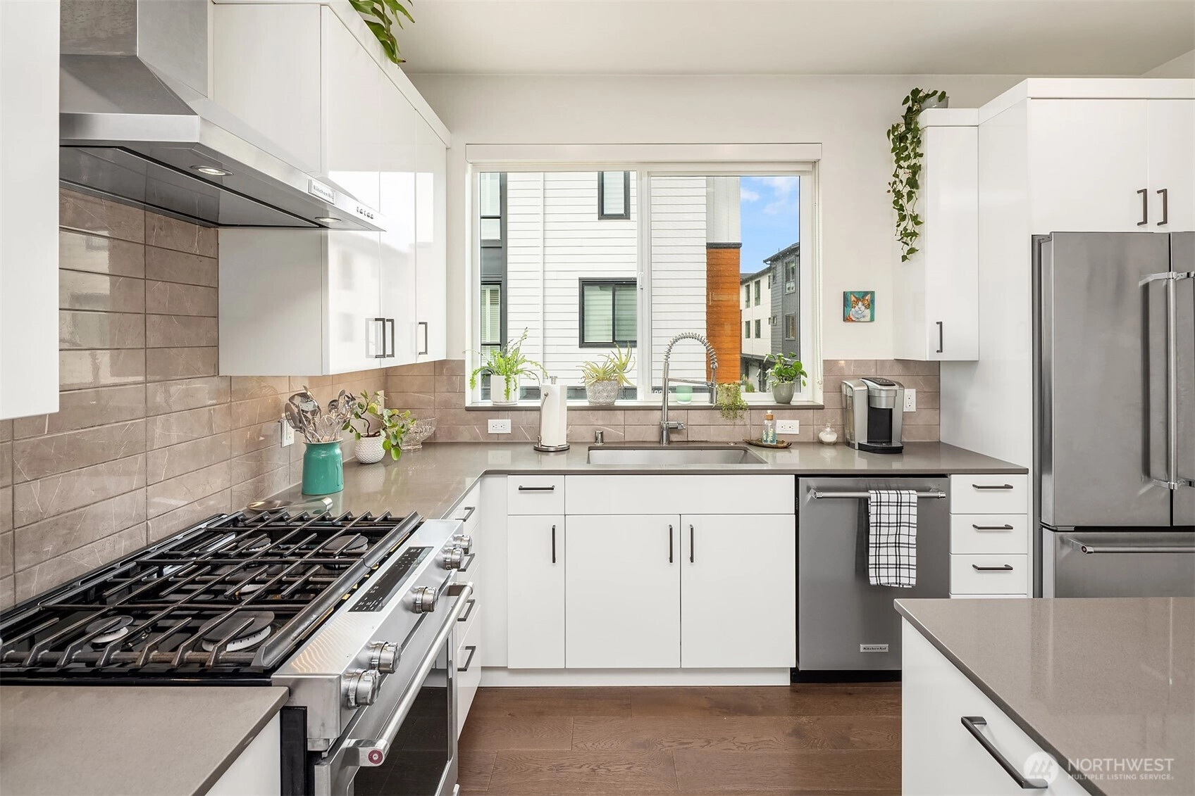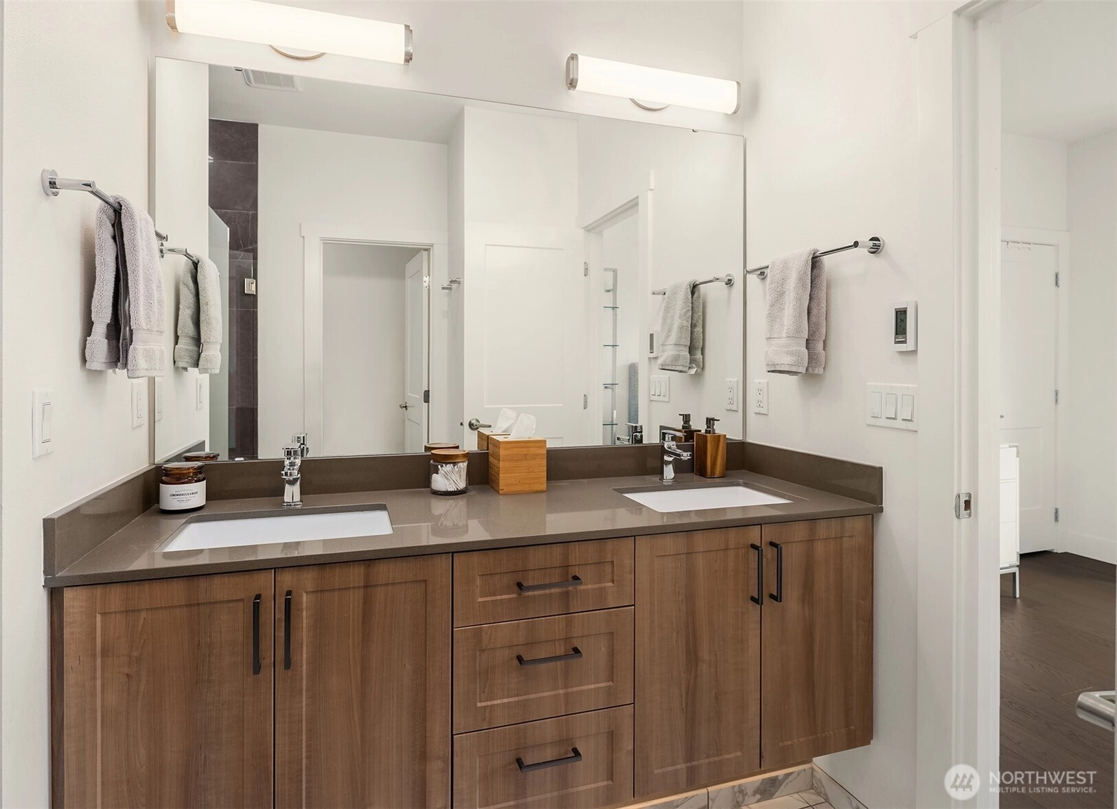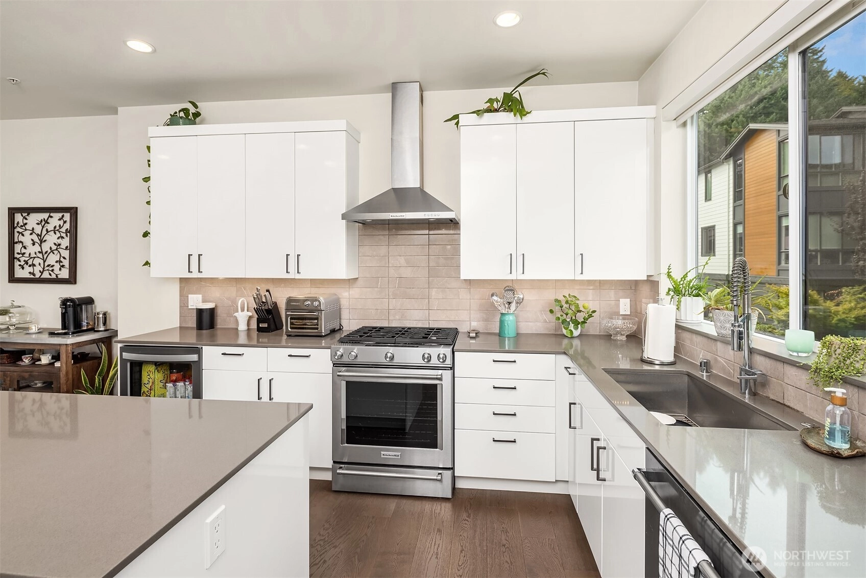 Spacious three-level townhome located in the highly sought-after Northshore School District, offering 1,537 square feet with 3 bedrooms and 3 bathrooms. South-facing, floor-to-ceiling windows fill the home with natural light, highlighting the open and flexible floor plan. The main level includes a convenient 3/4 bath, while the lower level offers a private guest bedroom or home office. The kitchen is thoughtfully designed with slab quartz countertops, an oversized island, stainless steel appliances, under-cabinet lighting, and a built-in beverage fridge. Hardwood floors, wrought-iron railings, split air conditioning units, and an EV-charger-equipped two-car garage enhance both comfort and functionality. Enjoy a private balcony and a prime Bothell location with easy access to downtown, shopping, dining, and transit.