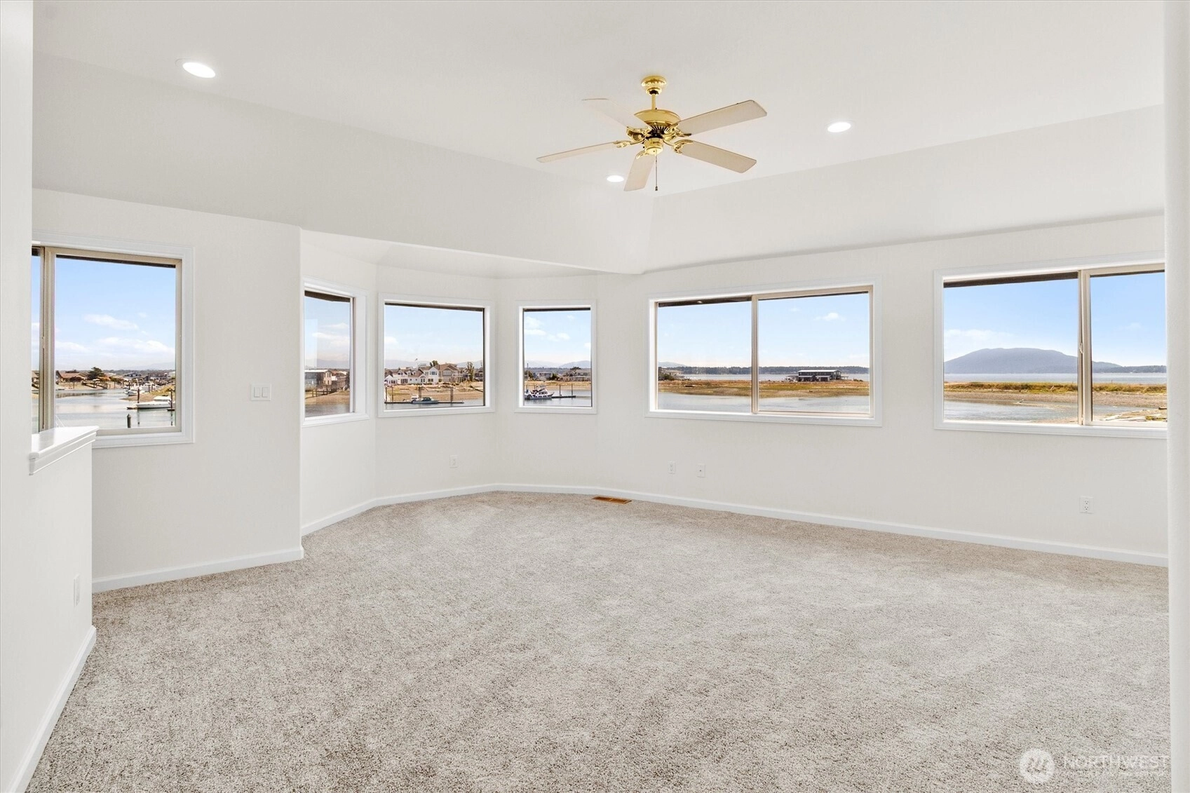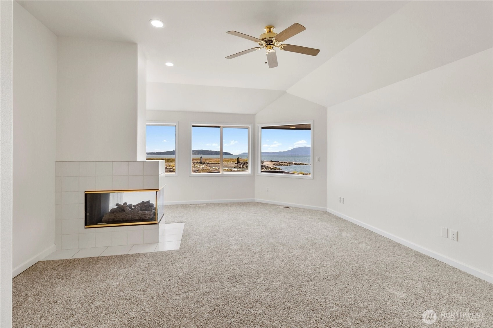 Sandy Point waterfront living with jaw-dropping panoramic views of the San Juan Islands and Mt. Baker. 103’ of low-bank frontage along the peninsula and a 26' private dock in marina. Designed to capitalize on the stunning Mt. Baker sunrises and San Juan sunsets, whether from your expansive deck or the comfort of your primary suite with 180° views. Situated at the end of quiet North Point, this 3,332 sqft home features fresh interior/exterior paint, refinished oak floors, vaulted ceilings, a gourmet kitchen, grand fireplaces, and a newer roof. Spacious 3-car garage with potential room for RV or boat parking. This rare PNW waterfront home is move-in ready and awaits your final touches. Community amenities include pool, parks, golf, and more.
