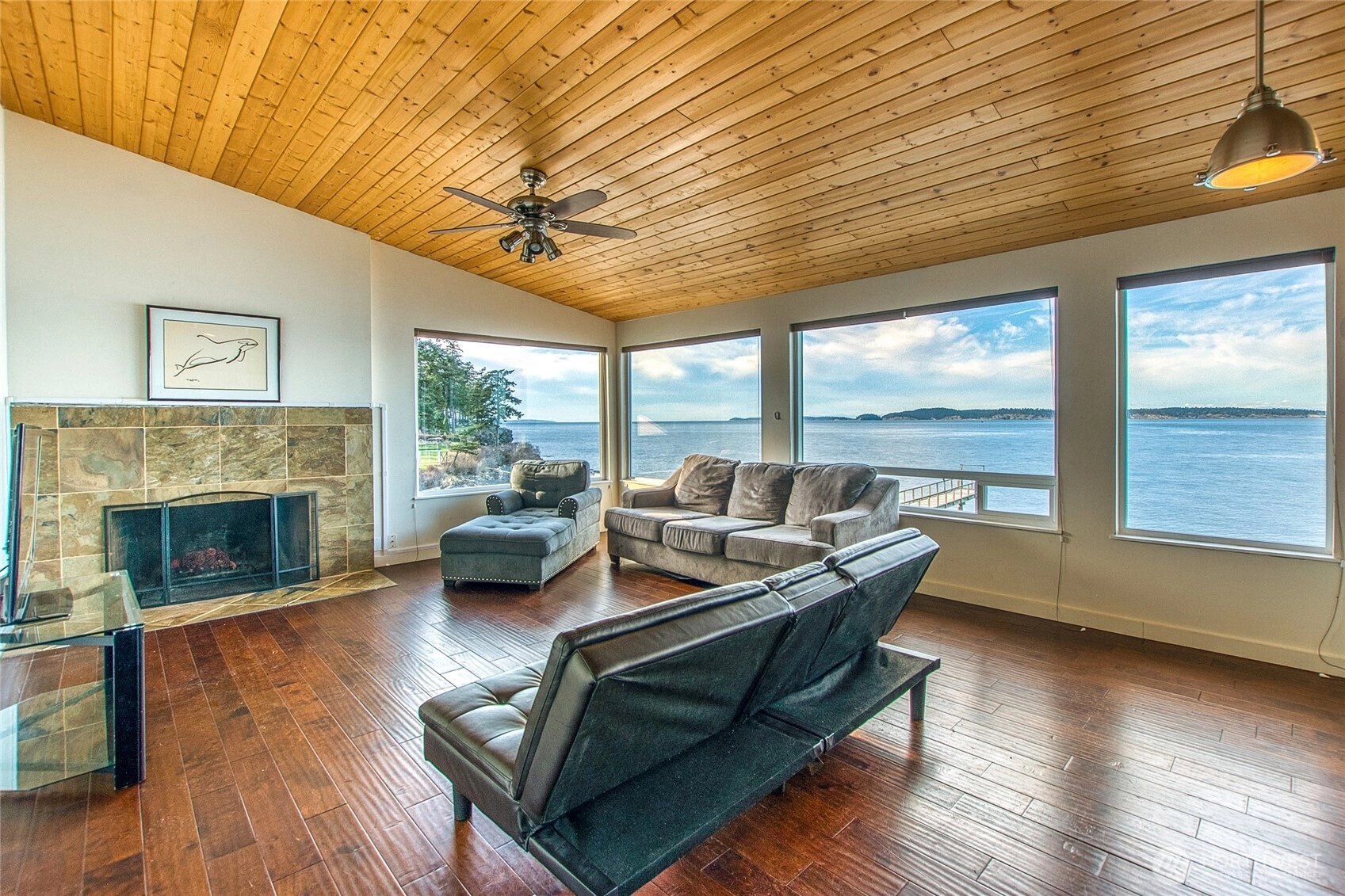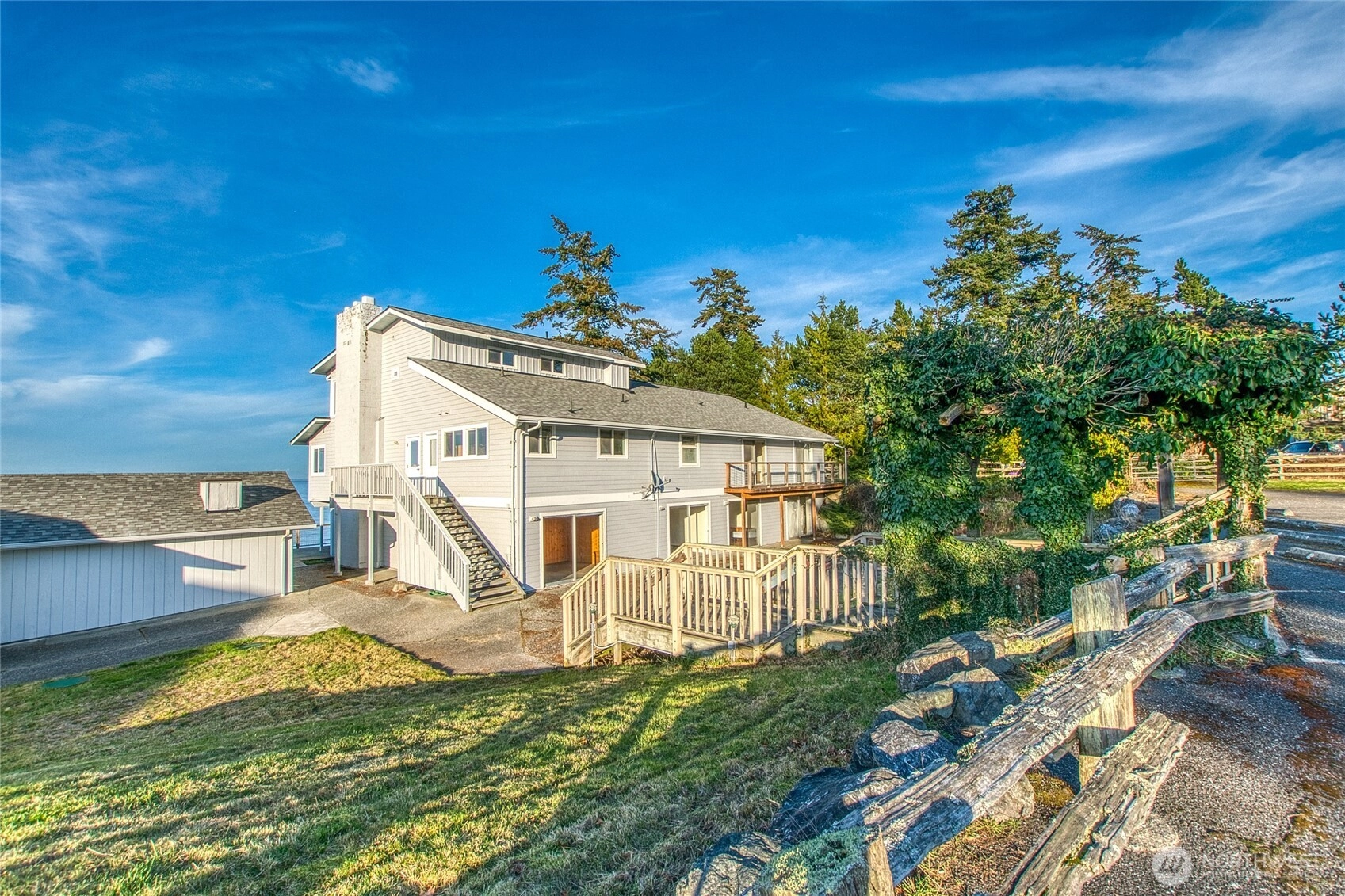 Bartwood Lodge presents a rare Orcas Island waterfront opportunity with sweeping panoramic views and exceptional development potential. Located on the quiet North Shore in the residential Bartwood neighborhood, this unique property offers flexibility for a single or multi-family estate, condo remodel for resale, apartment renovation for long-term income, or immediate use as employee housing. The property features two separate buildings. The main three-story lodge includes 15 guest rooms with private baths, plus a top-floor one-bedroom apartment with kitchen. A second building provides a spacious common living and dining area with large kitchen—ideal for gatherings or shared use. Installed Rock Island Fiber-Optic internet. Enjoy 180° vistas stretching north to the Canadian Coastal Range, east to Mount Baker, and west to stunning summer sunsets. A large waterfront deck leads to the community dock, beach, and boat ramp. Additional amenities include parking for 40+ vehicles and access to a HOA tennis, pickleball, and basketball court. Centrally located near the Orcas Island Airport, marina, and Eastsound Village shops and dining, Bartwood Lodge offers an exceptional combination of waterfront living, convenience, and income or redevelopment potential.