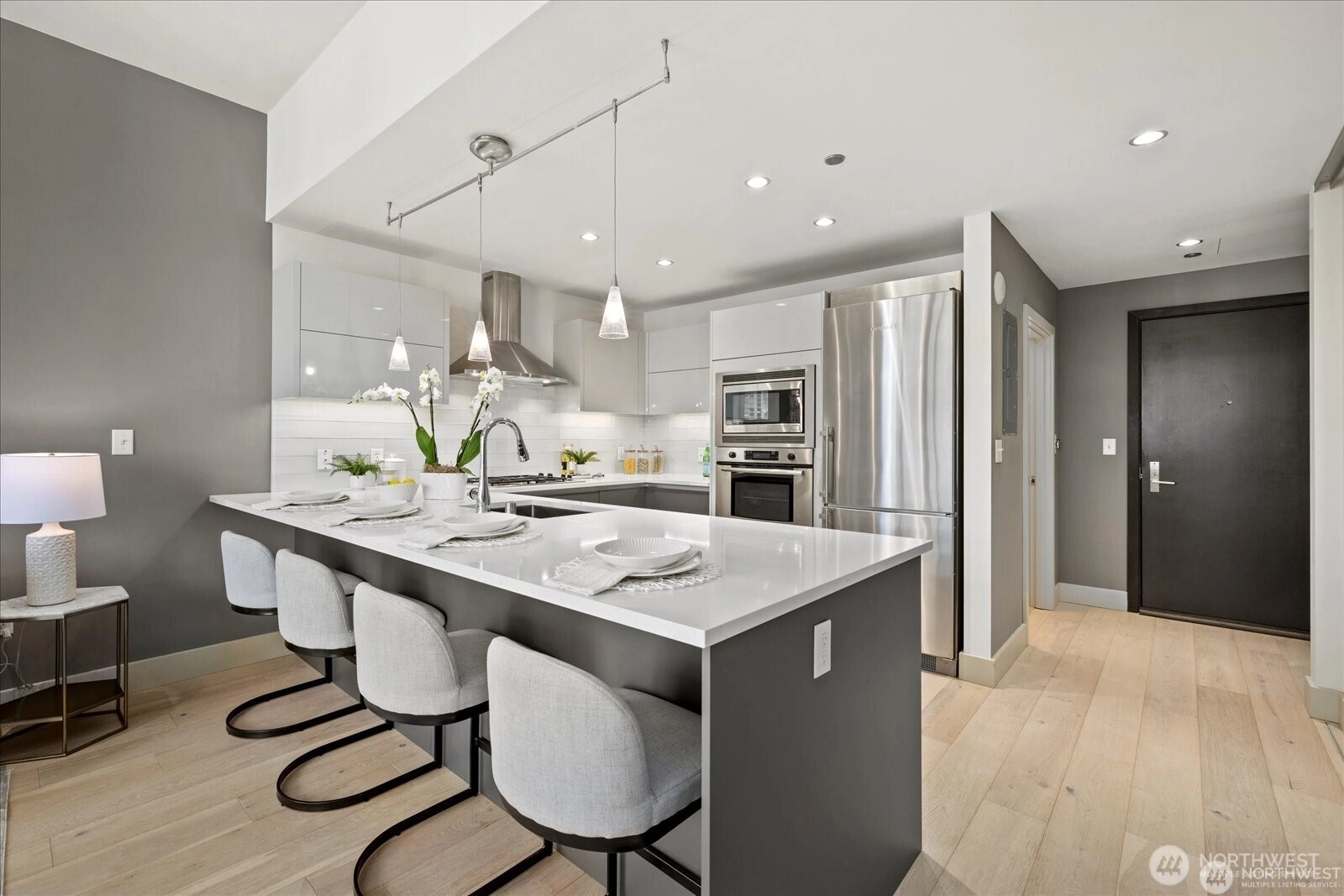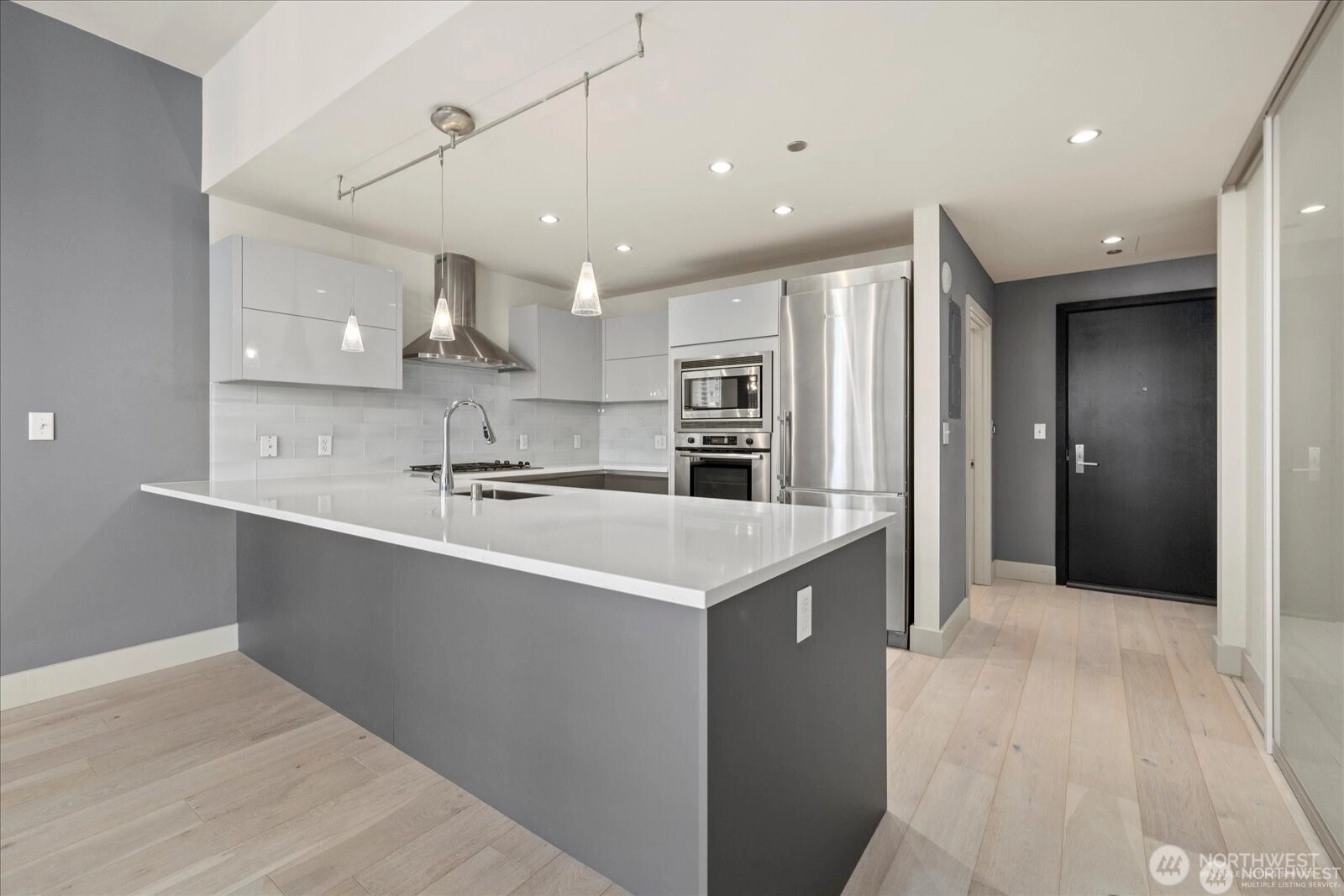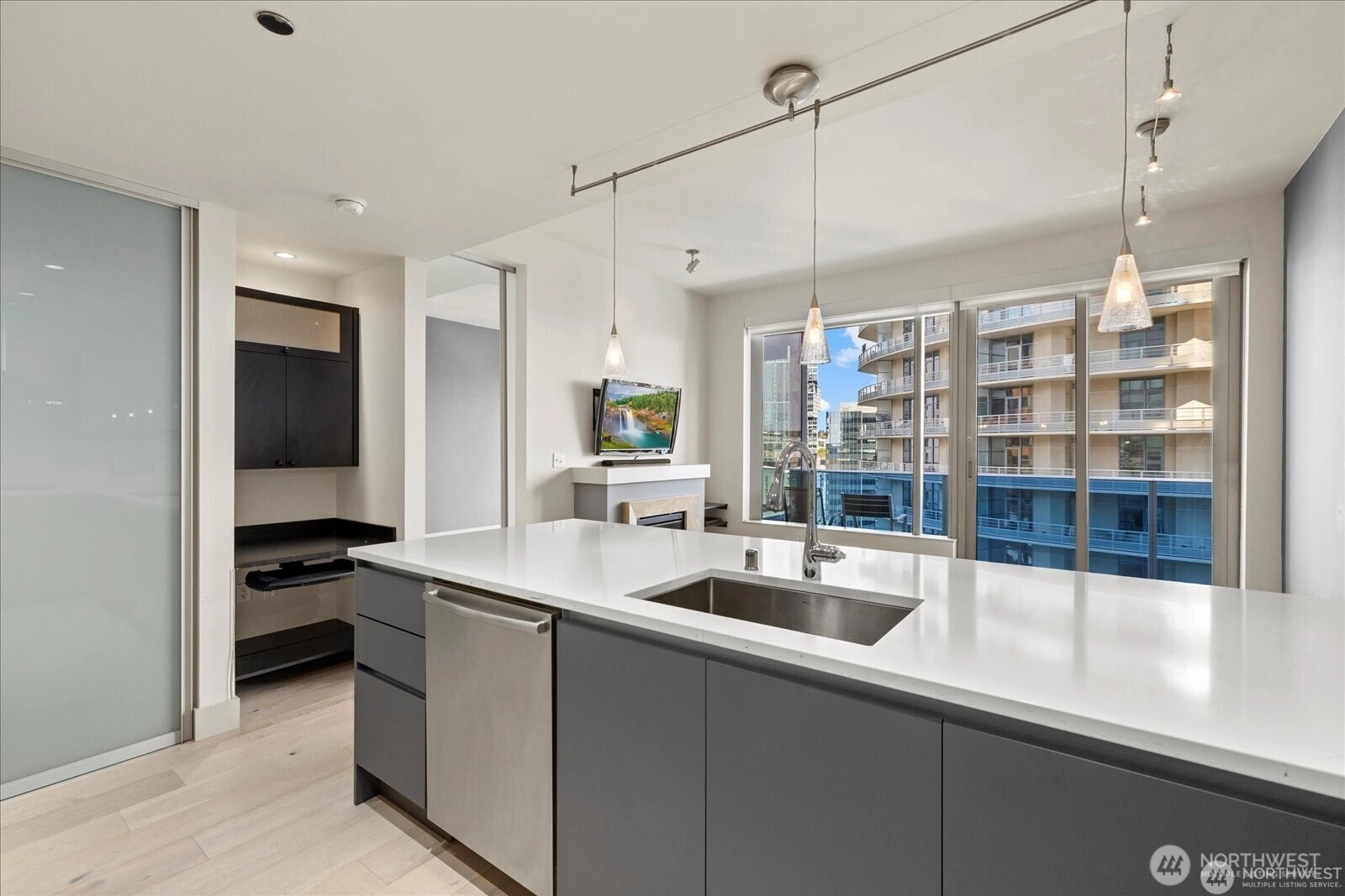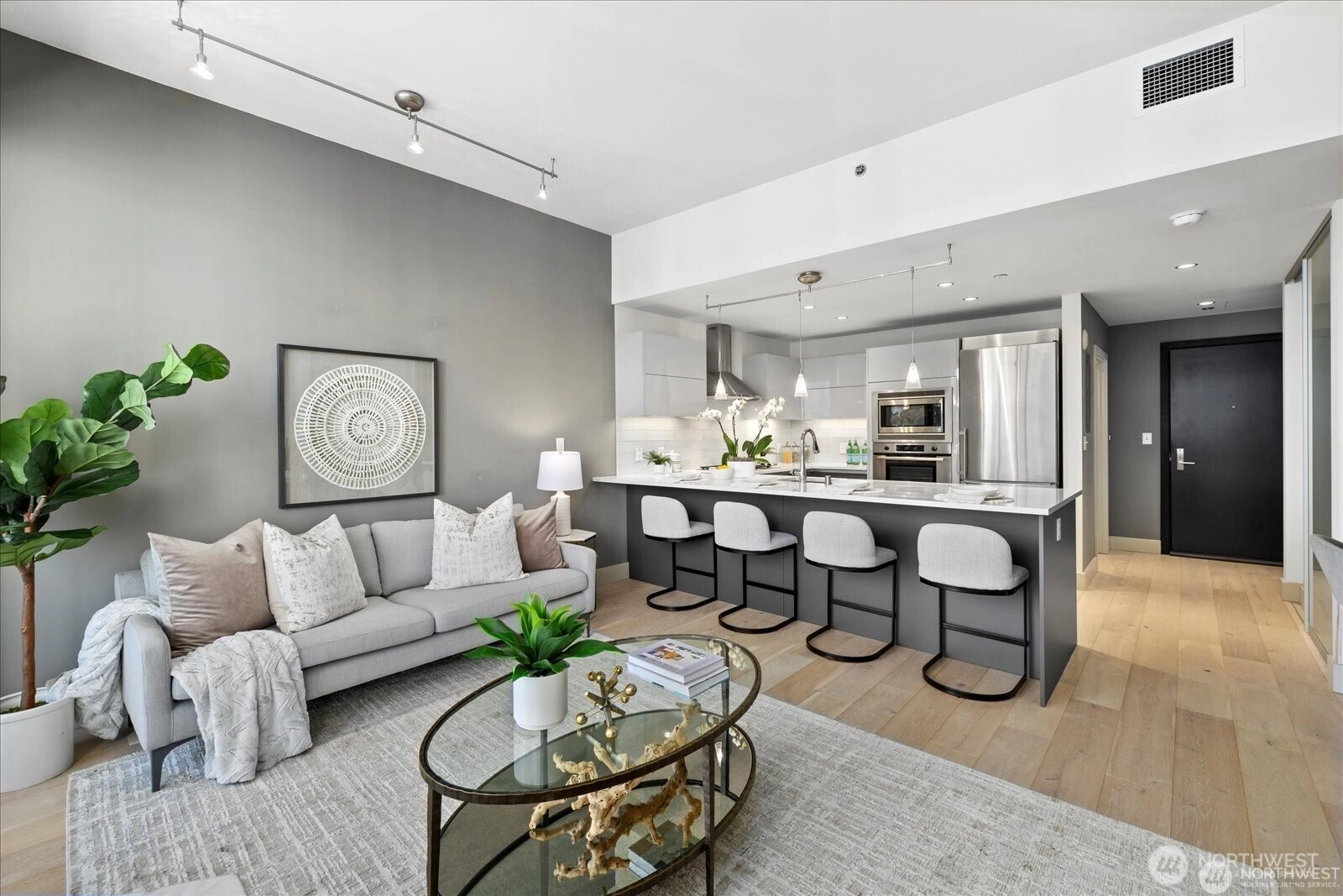 NEW Price, incredible value near 850 sqft east facing 1bd 1.5 bath luxury condo featuring expansive city views, abundant light, floor-to-ceiling windows, 10ft ceilings. New 2023 finishes: wide plank oak hardwoods spanning living & bedroom- New Pedinin kitchen cabinets, new SS appliances, new Kitchen island with white quartz, new glass tile back splash,new faucet, sink & garbage disposal. Brilliant design with fireplace & spacious balcony. 5 star amenities! hotel access floor 2-Saline pool, Jacuzzi, steam & sauna, fitness center & yoga studio. 18th fl- Private owners lounge- roof deck & dog run. Ez access to light rail, I-5, mins to Amazon, vibrant location. Hotel discounts for family friends. 1pk p-3 #80,1stg A/C,No rent Cap.