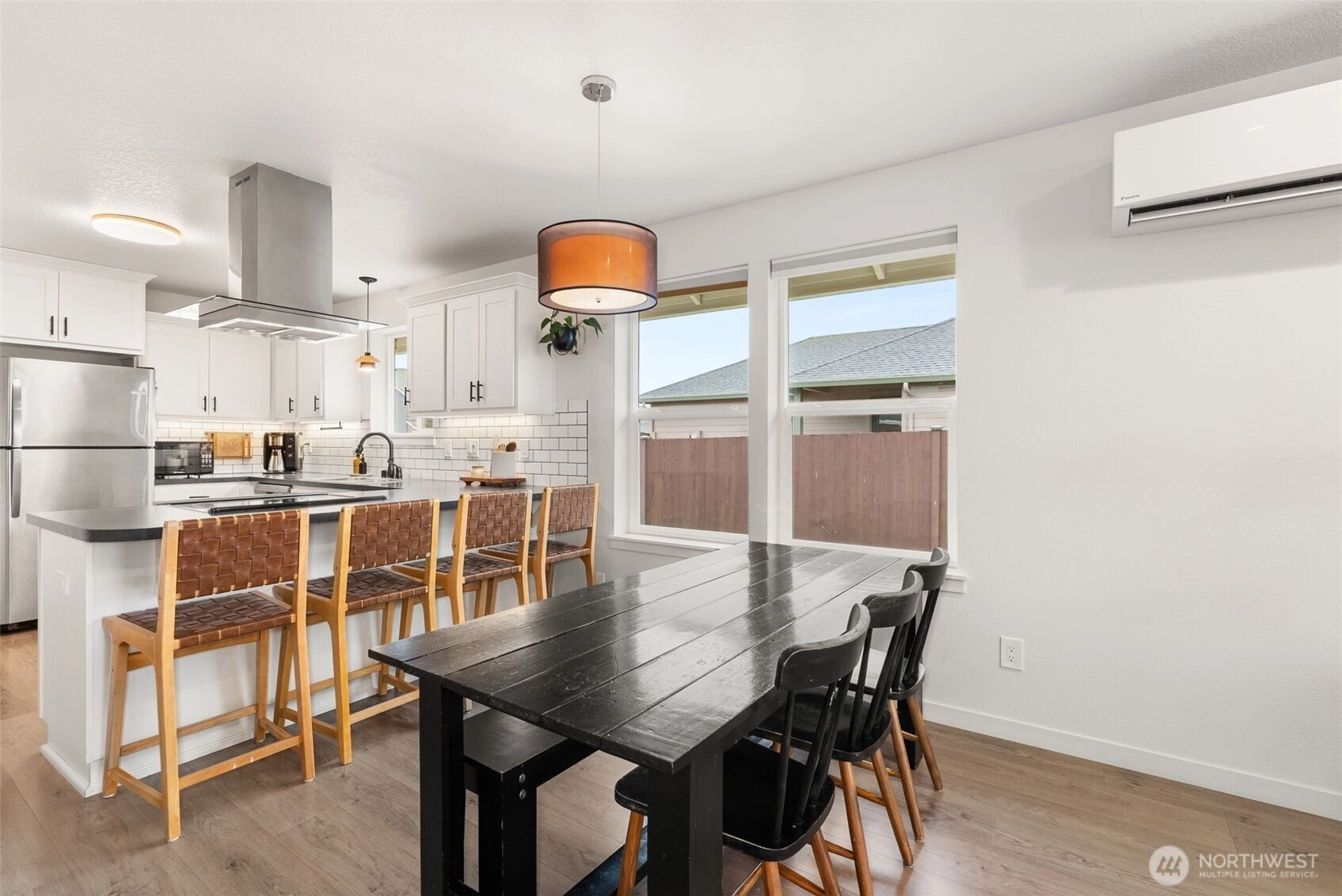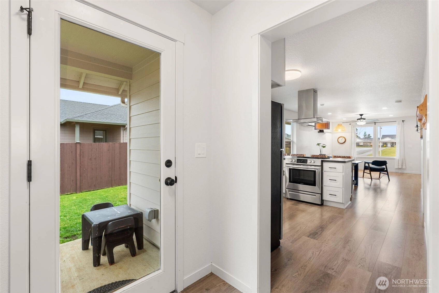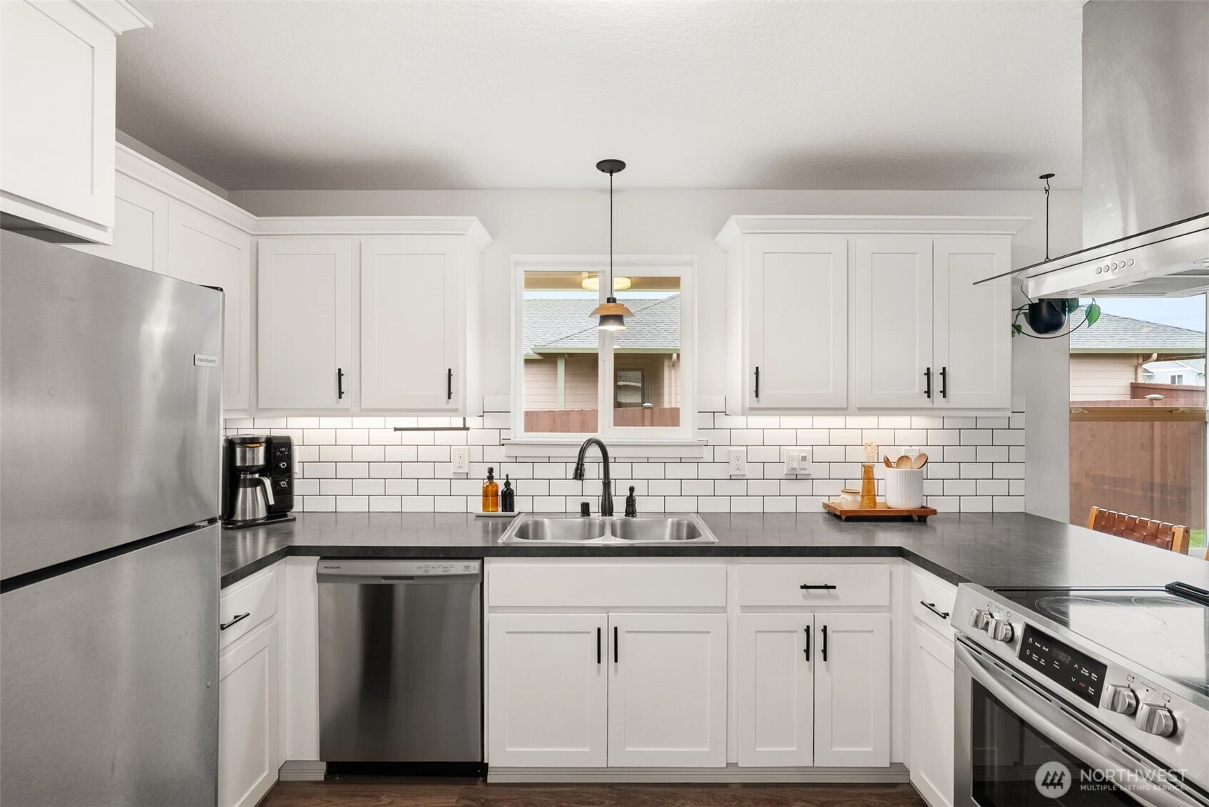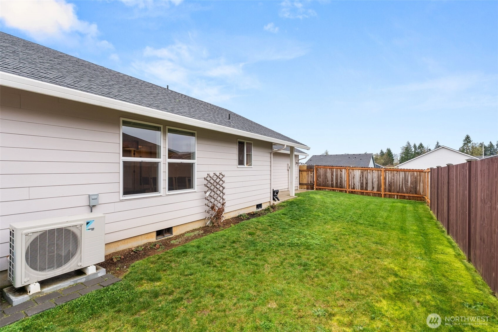Welcome to this well-maintained 3-bedroom, 2-bath home in desirable Grand Prairie Estates! Offering over 1,200 sq ft of comfortable living space, this home features an open floor plan that feels bright and welcoming. The kitchen is thoughtfully designed with stainless steel appliances, tile backsplash, ample cabinet space, and an eat-at bar—perfect for casual meals or entertaining. Stay comfortable year-round with an energy-efficient heat pump mini-split system providing both heating and cooling. Step outside to a fully fenced yard, ideal for pets, play, or relaxing outdoors. Enjoy the convenience of being directly across the street from a park and just 5 minutes from I-5, making commuting a breeze. A great blend of comfort, efficiency, and location—this home is move-in ready and waiting for you!