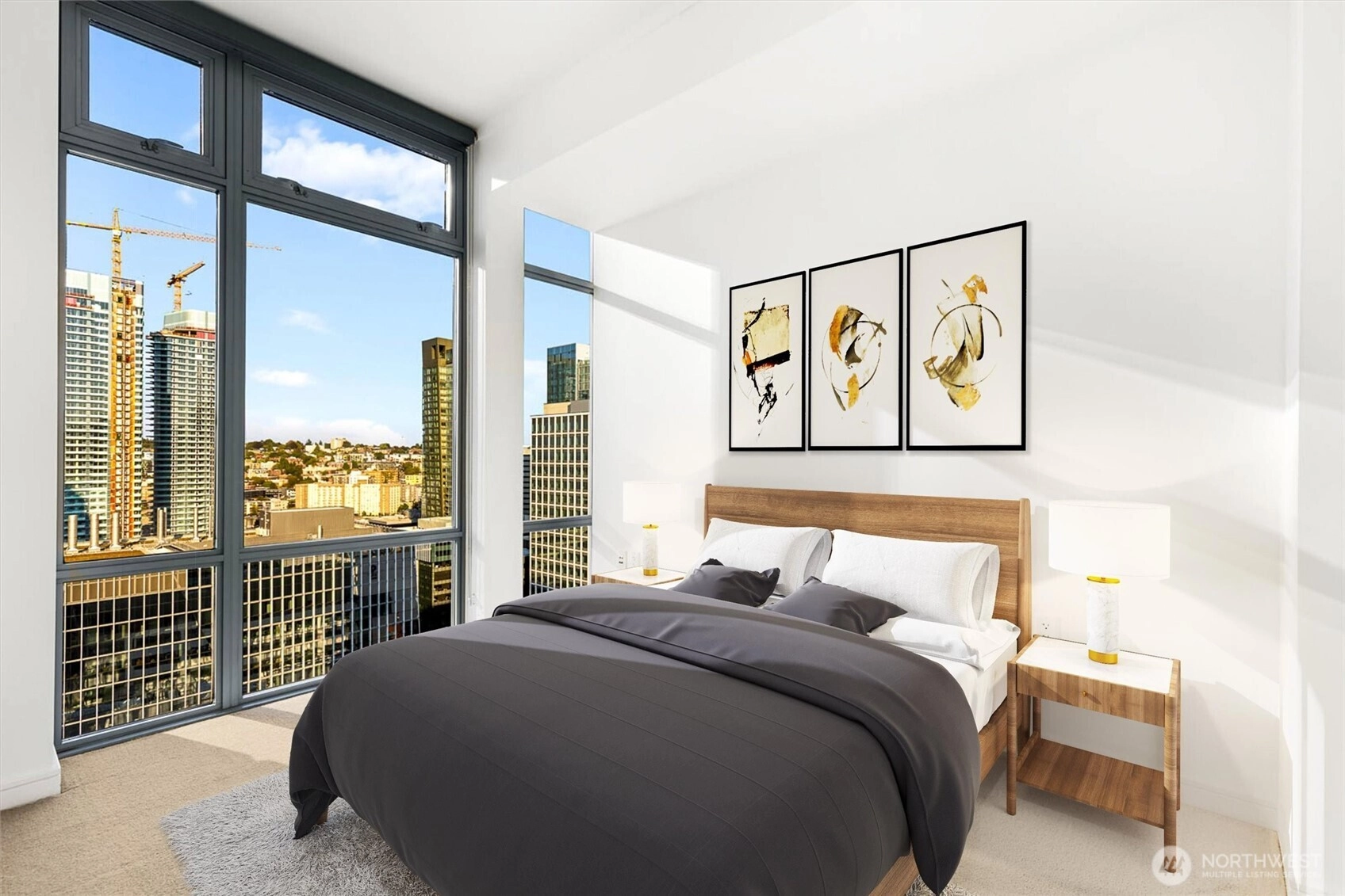 Discover this breathtaking end-unit penthouse on the 33rd floor of The Cosmopolitan with breathtaking vistas. This urban retreat features hardwood floors, a gas fireplace, and a gourmet kitchen with granite counters, Wolf appliances and Sub-Zero fridge. Each bedroom offers plush carpeting and walk-in closets; the primary suite includes a modern en-suite bath with a rain shower and dual vanities. Enjoy in-unit washer/dryer and built-in storage. Relax on your private balcony with breathtaking vistas. Amenities include 24-hour concierge, fitness center, spa with sauna, and a rooftop deck showcasing the Space Needle, Lake Union, and Puget Sound. Perfectly situated in Denny Triangle, near Amazon, Whole Foods, and light rail. Don't miss this gem!