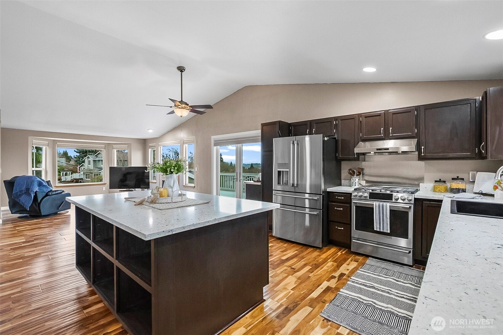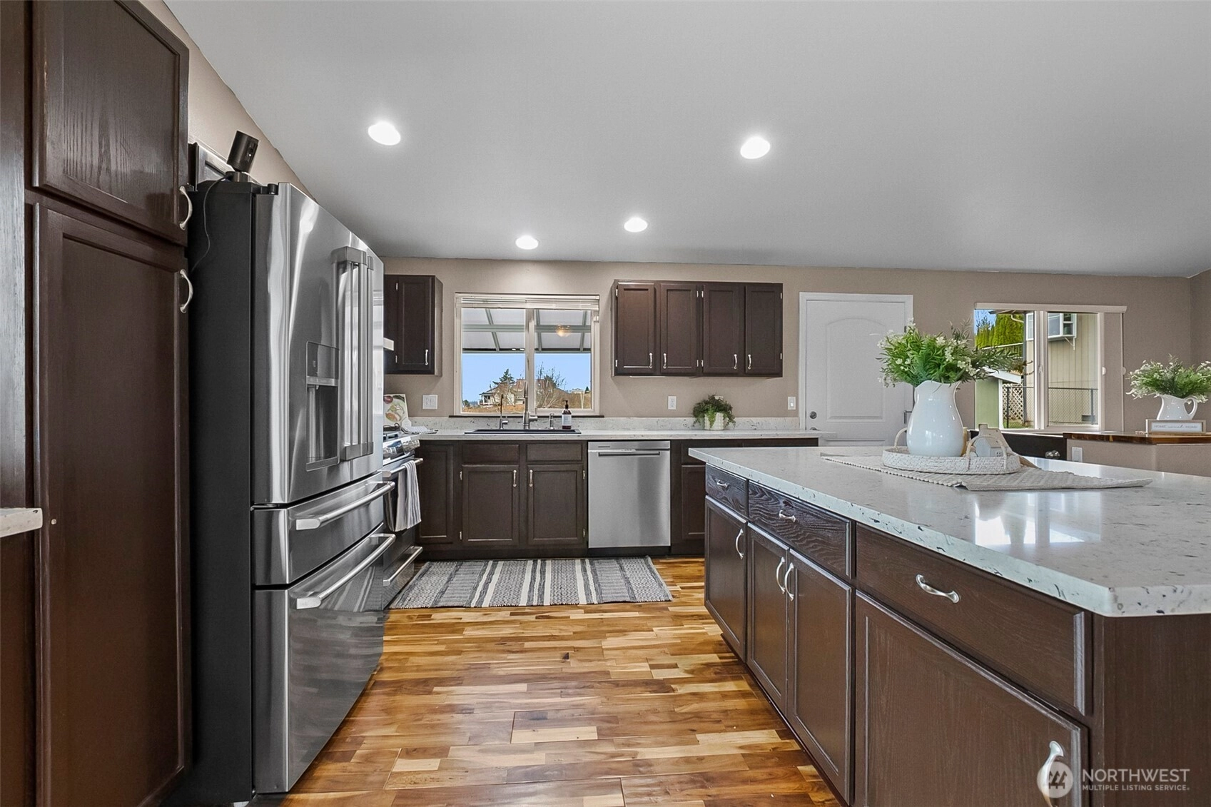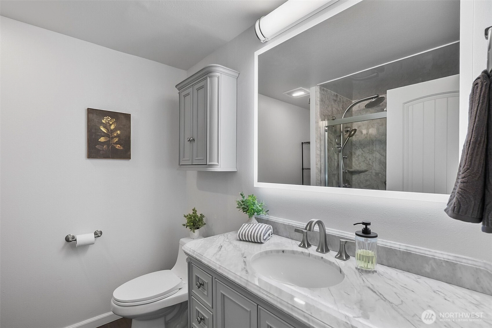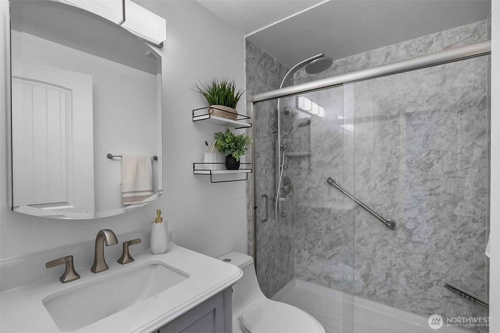 Beautifully updated 3-bedroom, 2.75-bath rambler with daylight basement offering flexibility, space, & incredible views! The daylight basement features it's own separate entry, private bath, & plumbing for a future 2nd kitchen — ideal for multi-generational living or potential rental income. The main living space showcases quartz countertops, abundant storage, & numerous upgrades throughout, making this home truly move-in ready. Enjoy a refreshed primary bath complete with a walk-in shower, sleek LED lighting, fresh paint, & gorgeous new cabinetry. Recent fresh paint, brand-new carpet, & bright white trim & solid doors throughout. Enjoy stunning Olympic Mountain & Sound views, perfectly situated at the end of a quiet dead-end cul-de-sac on a generous lot with ample parking & convenient access to a fully fenced backyard. Outdoor living features low-maintenance composite decking ideal for entertaining, along with raised garden beds & established fruit trees. A standout feature is the fully insulated 10 x 24 shed with Rockwool insulation, offering excellent workspace or storage potential. Located just minutes from Highway 9 & I-5, this property combines peaceful surroundings with commuter convenience. A truly unique and versatile home you won’t want to miss!