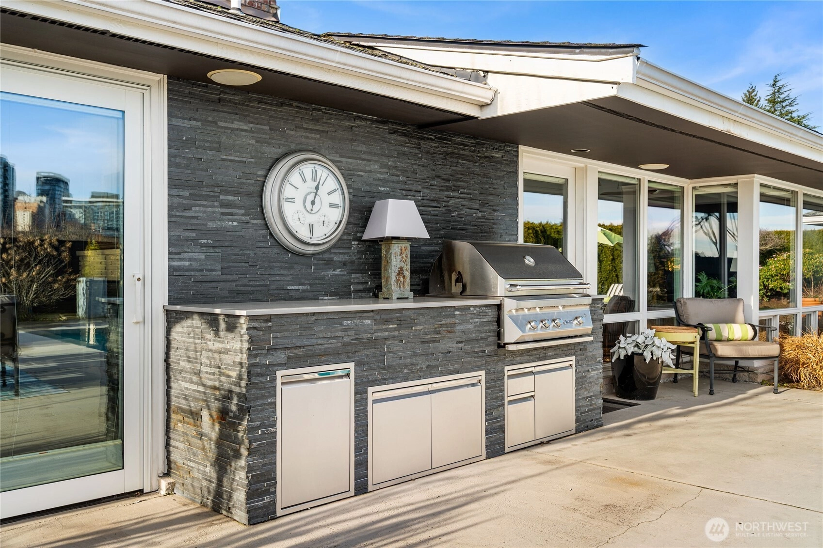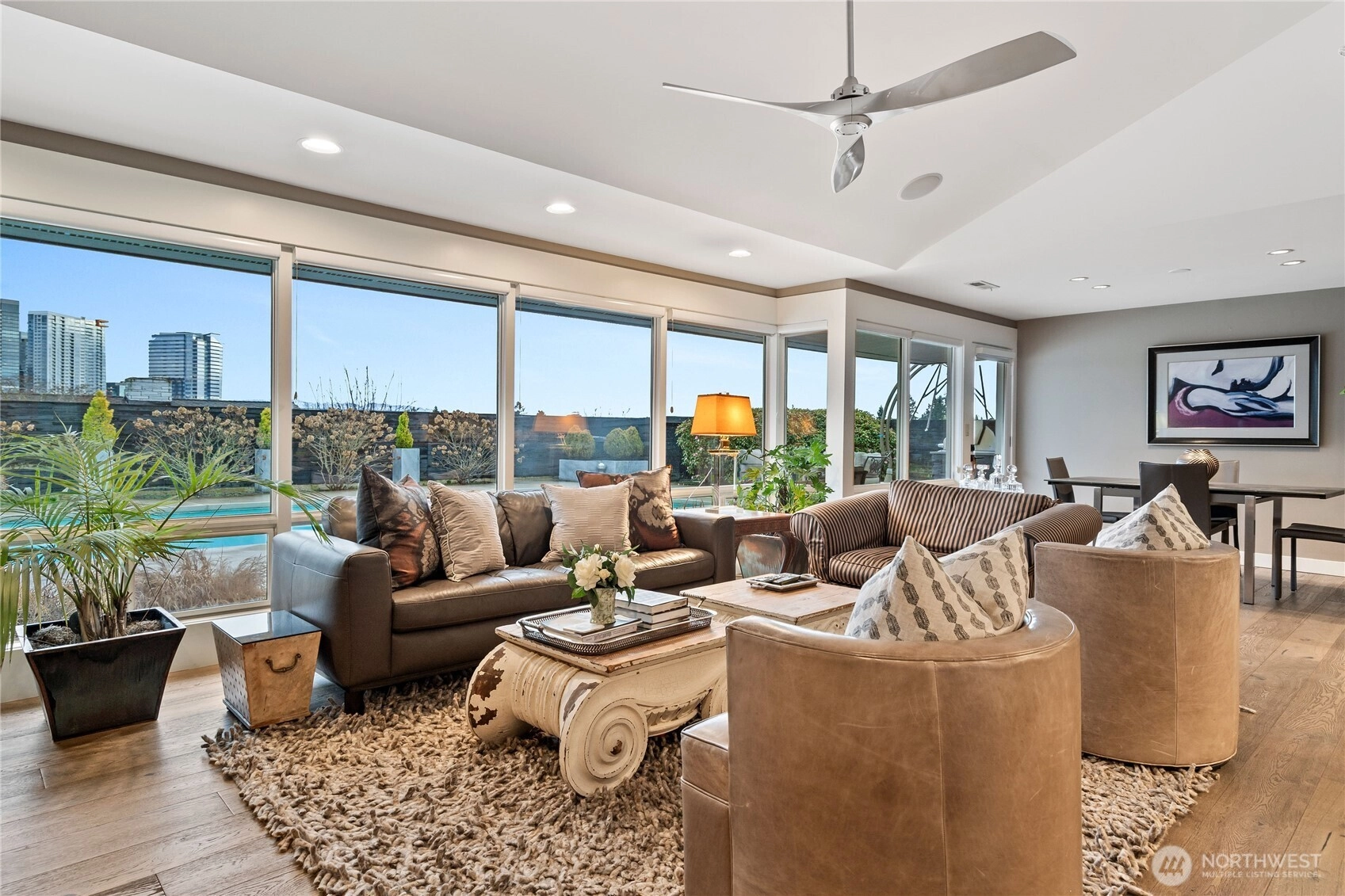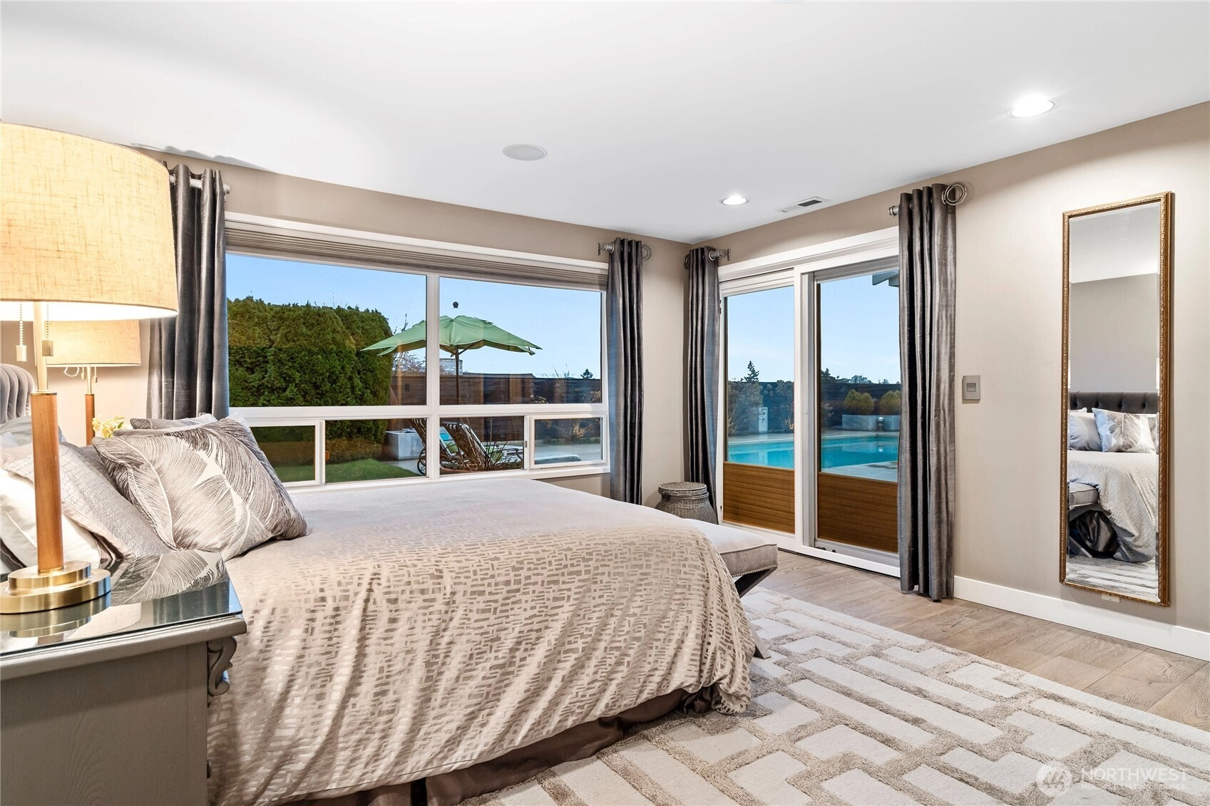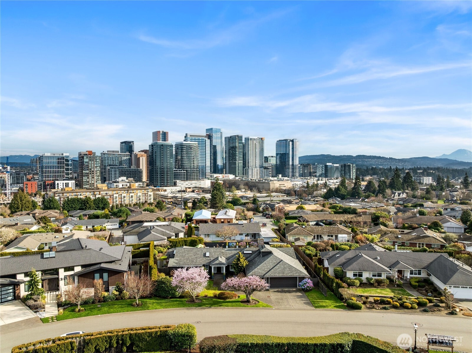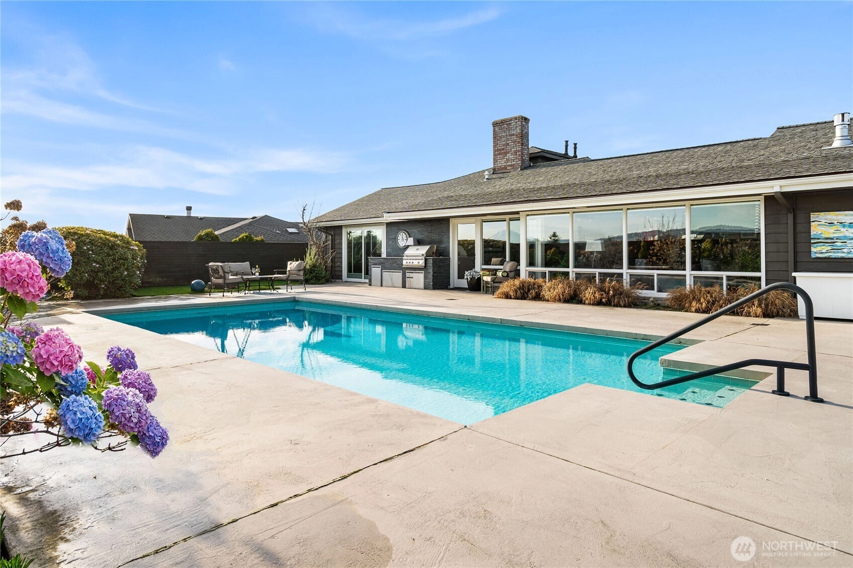Located in Bellevue’s highly desirable Vuecrest neighborhood, this beautifully reimagined one level home offers sweeping views of Downtown Bellevue and Mount Rainier. Oversized windows fill the living room with natural light, showcasing 5-inch-stained oak hardwood floors, a gas fireplace, custom built-ins, and surround sound, with views extending to the pool and skyline beyond. The kitchen features granite countertops and high-end appliances including a Thermador double oven, Miele dishwasher, and Wolf 5-burner induction cooktop. Three oversized bedrooms include a primary suite with ensuite bath, tiled shower, and soaking tub. Enjoy a landscaped backyard with a large in-ground pool and outdoor BBQ kitchen. Spacious garage with custom walnut cabinets, clear light infrared sauna, and Liebherr Vinidor wine refrigerator (200+ bottle capacity). Private and peaceful, yet close to Downtown Bellevue with easy access to I-405. Highly Rated Bellevue School District!