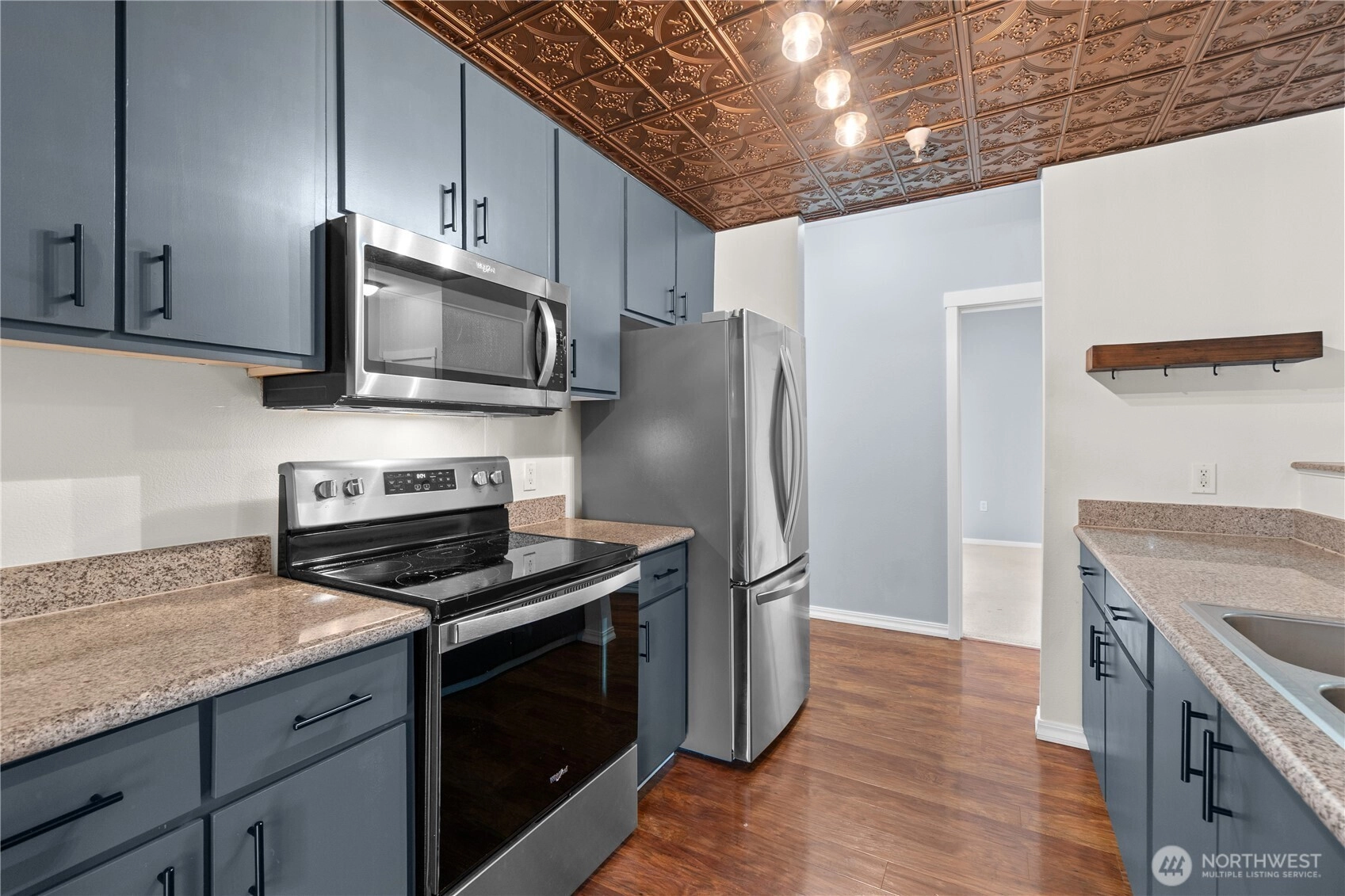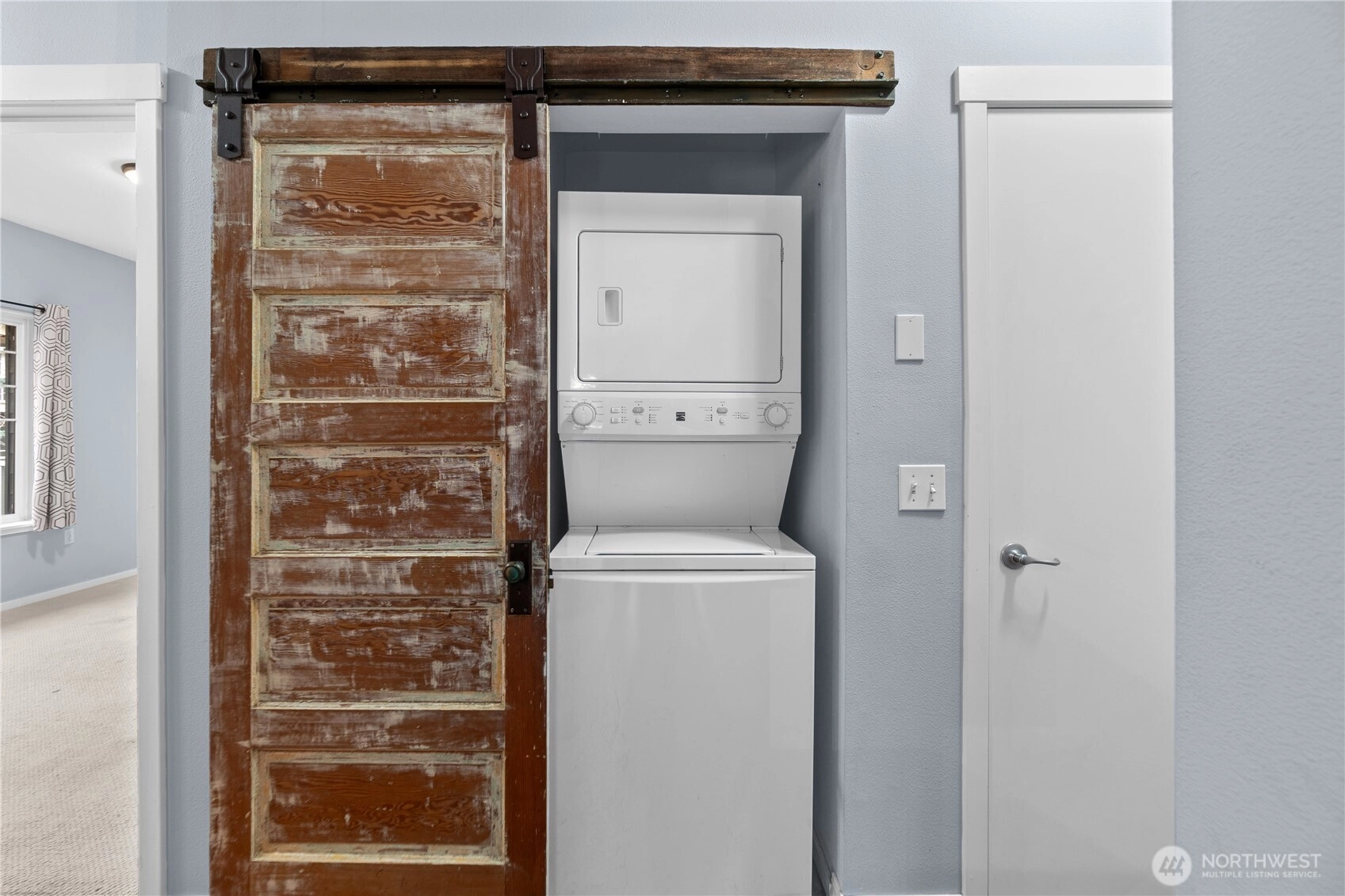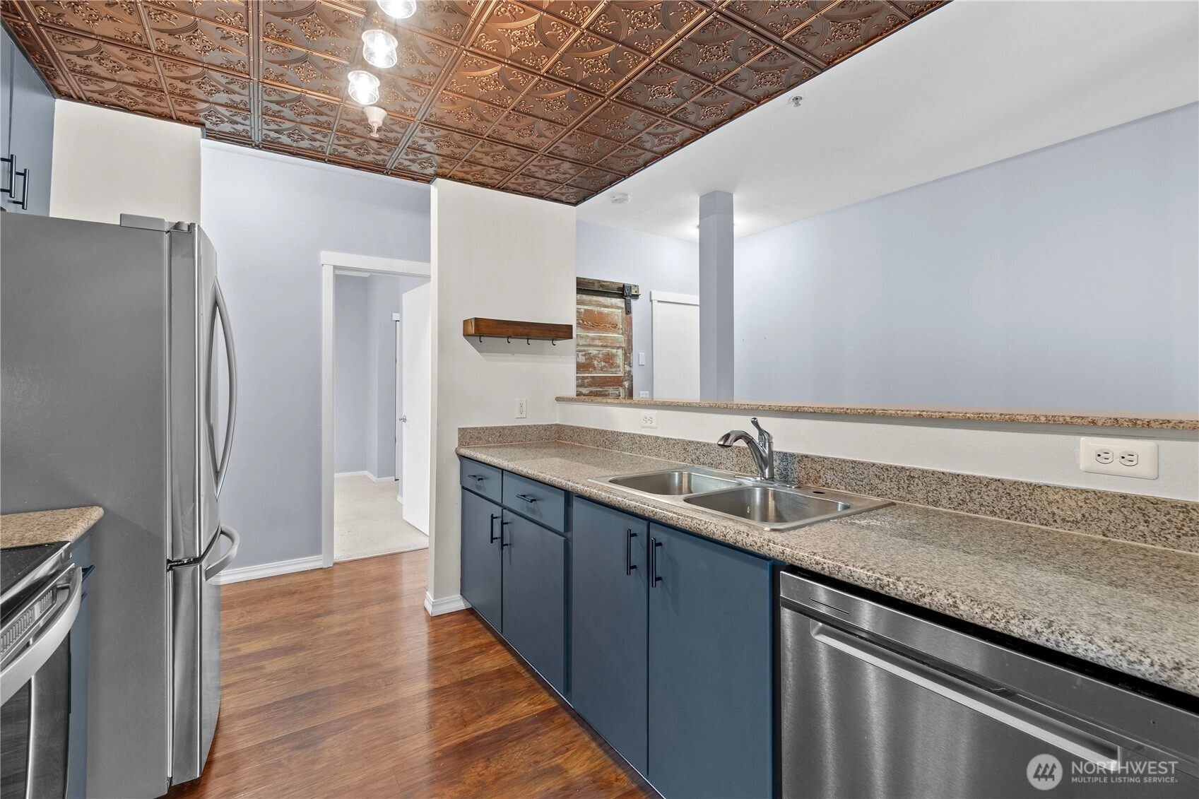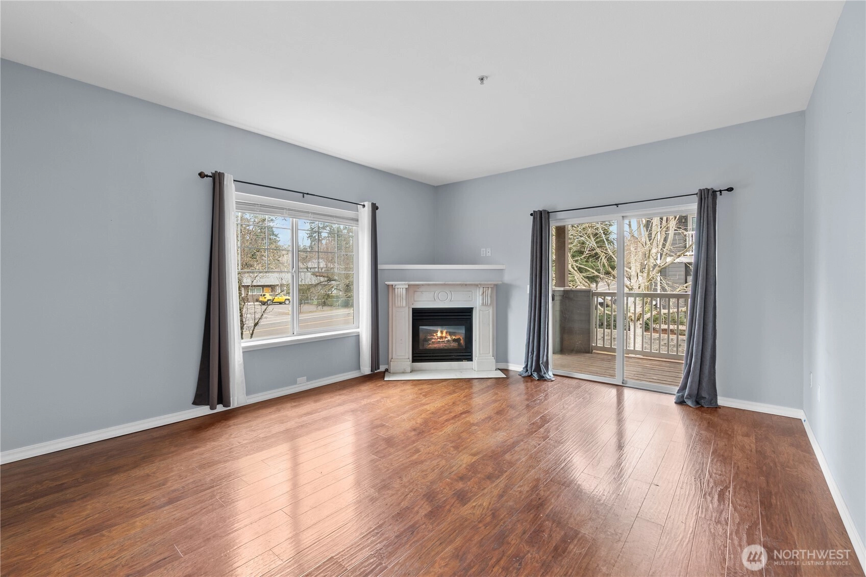 Bright upper-level 2-bedroom condo in Ellsworth on the Park! Spacious unit with tall ceilings and direct access to private garage below. A charming entry with designer mosaic tile leads upstairs to a warm, open layout accented by wood style floors. The kitchen features granite counters and a distinctive copper tiled ceiling. The living room’s gas fireplace creates a cozy atmosphere, and the covered deck is perfect for extended seasons. A rustic barn door adds a touch of personality and style while conveniently hiding the in-unit washer/dryer. The community clubhouse and pool sit conveniently just across from the building. Quick connections to both I-5 and I-205 from this stellar location.