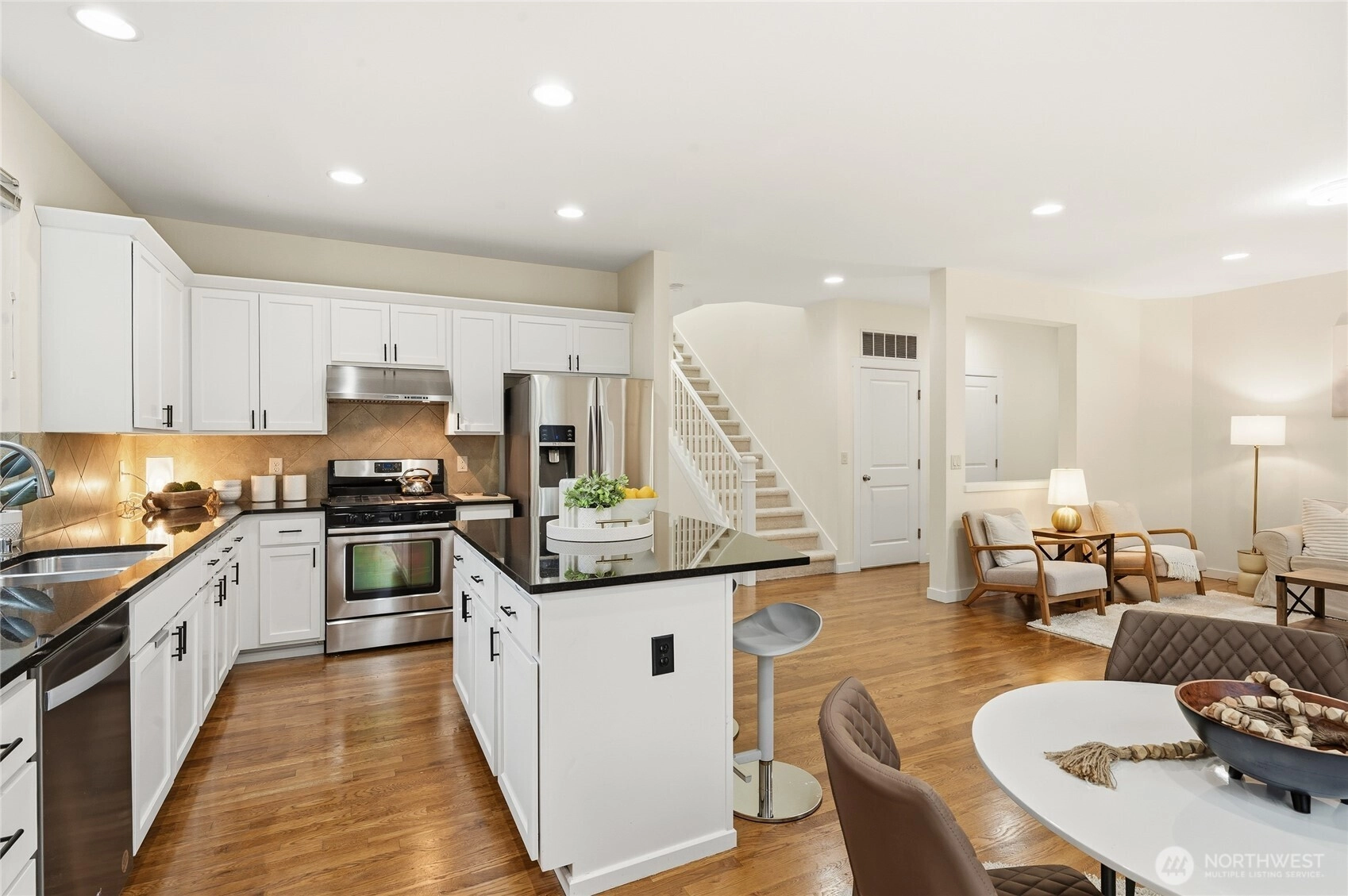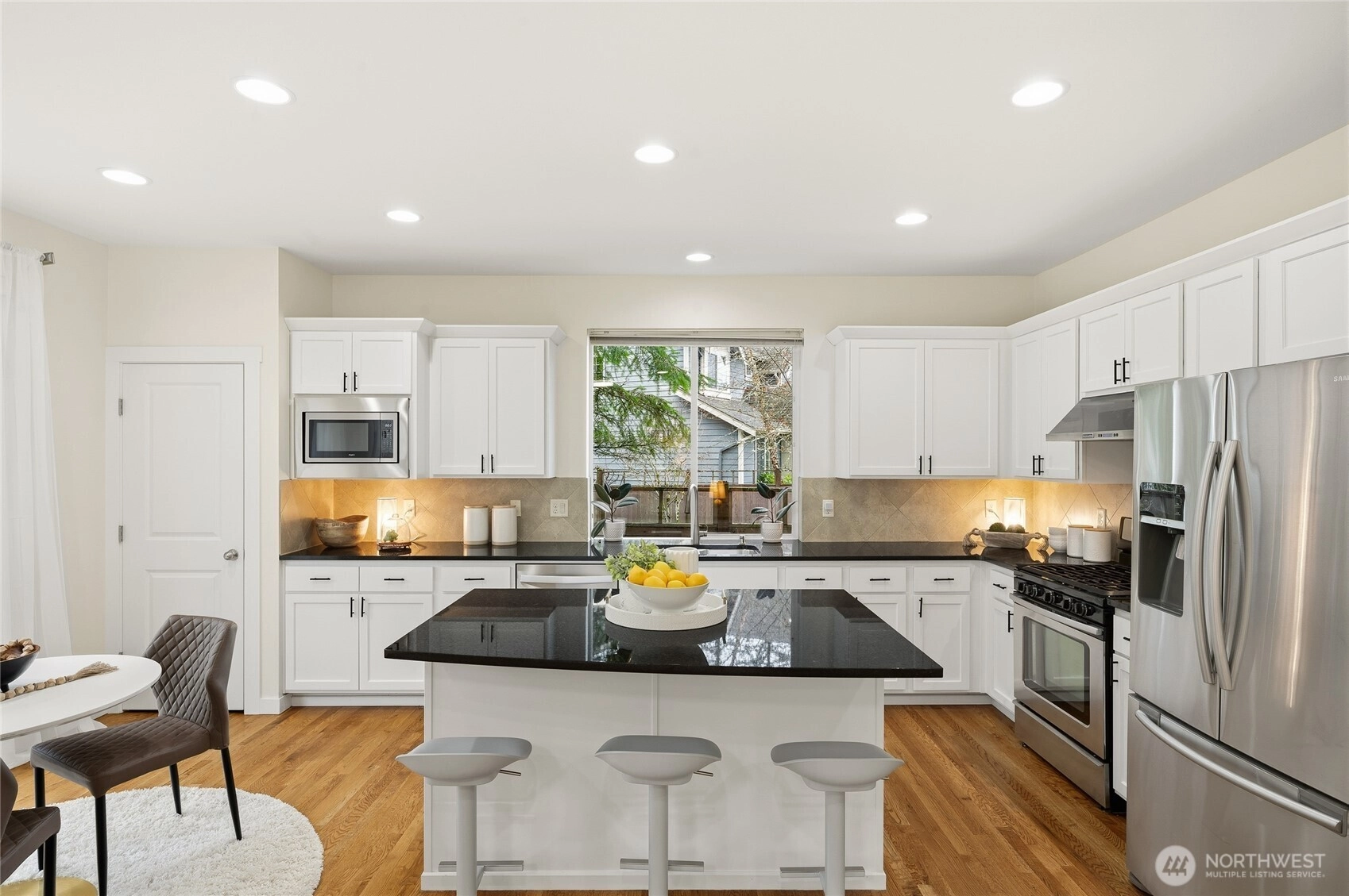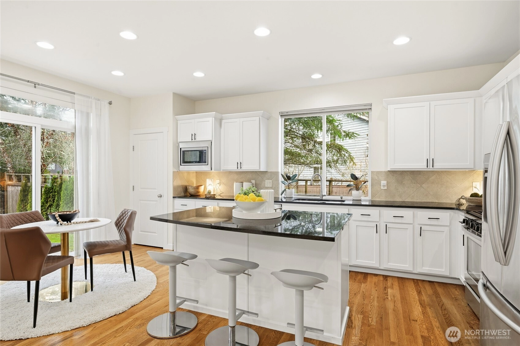 Space, Style & Community in Redmond Ridge East! Experience elevated living in this beautifully curated Murray Franklyn home, where timeless design meets modern comfort. With 5 bedrooms, 2.75 baths, and 2,856 sq ft, the thoughtful layout offers flexibility, including a desirable main-level bedroom with adjacent ¾ bath that is ideal for guests or multi-generational living. Rich hardwoods set the tone on the main floor, complemented by elegant formal living and dining rooms. The remodeled kitchen features a large center island, crisp white cabinetry, stainless steel appliances, a 5-burner gas range, and full-height backsplash, all flowing seamlessly into the inviting family room with a cozy gas fireplace. A generous covered wrap-around porch creates the perfect backdrop for morning coffee, or entertaining year-round. Upstairs, retreat to the oversized primary suite with spa-inspired bath, dual vanities, soaking tub, step-in shower, and huge walk-in closet. Additional bedrooms, each with walk-in closets, plus a spacious laundry room and versatile rec or media room complete the upper level. Enjoy modern conveniences and upgrades including brand new carpet, central A/C, EV charger, and a rare 3-car side-by-side garage. Step outside to a low maintenance fully fenced yard. Set within the Lake Washington School District and surrounded by parks, trails, sport courts, dog park, and vibrant community events, this home offers a truly polished Redmond Ridge lifestyle.