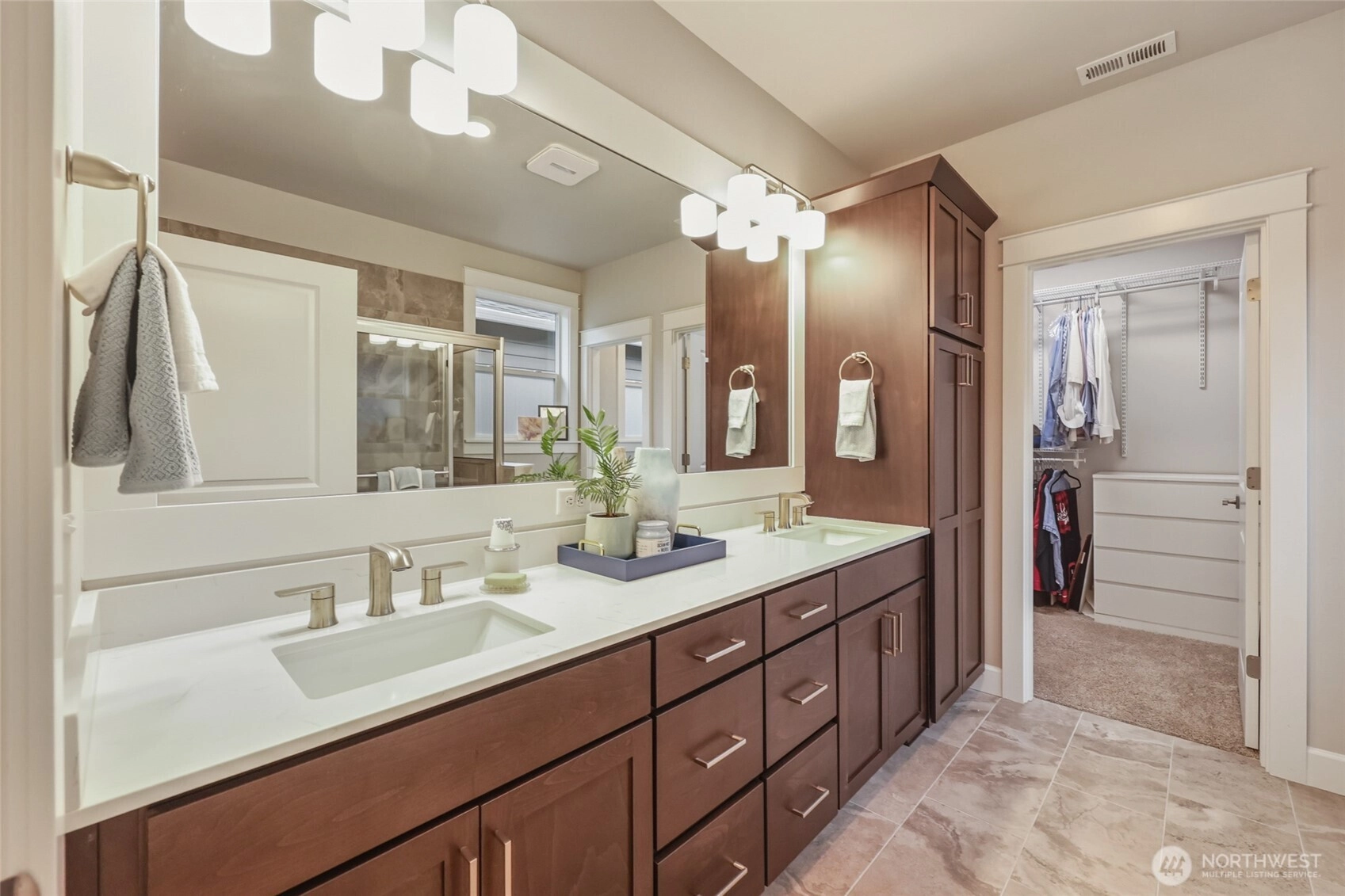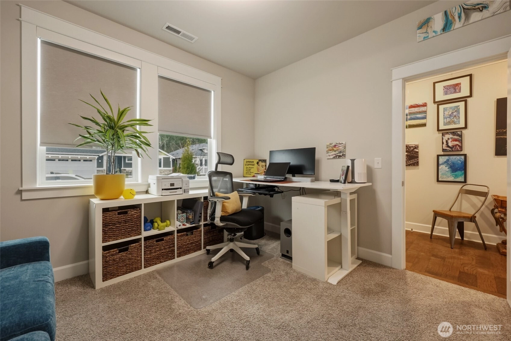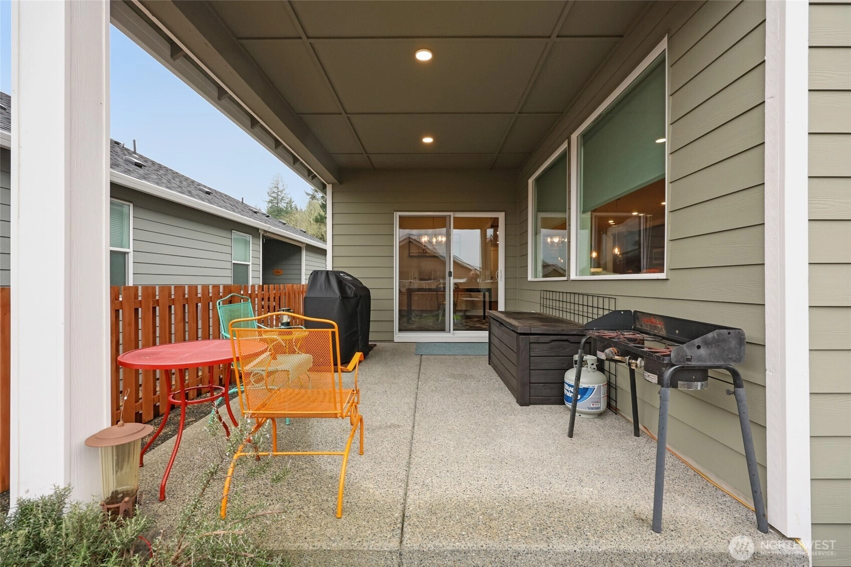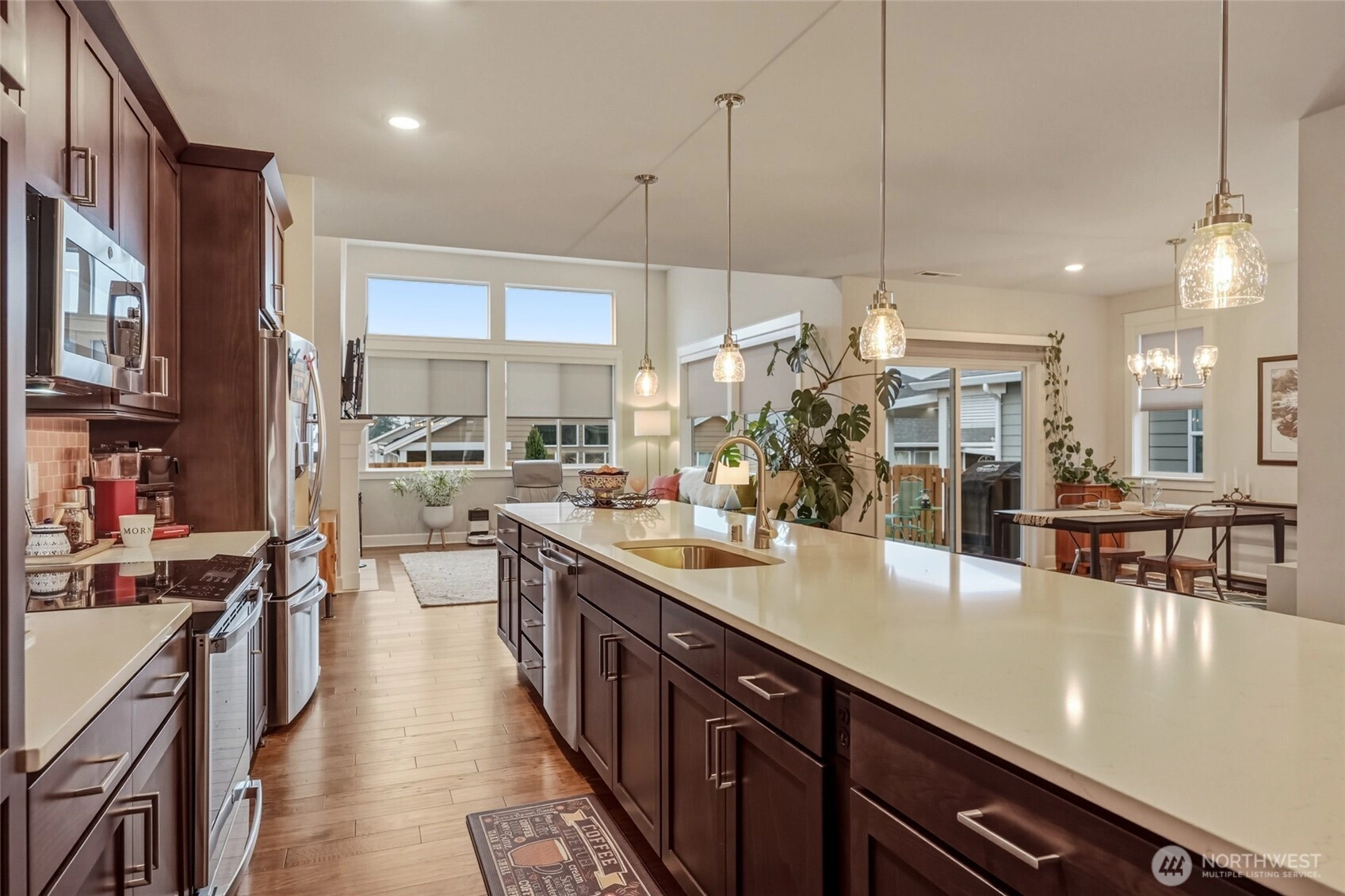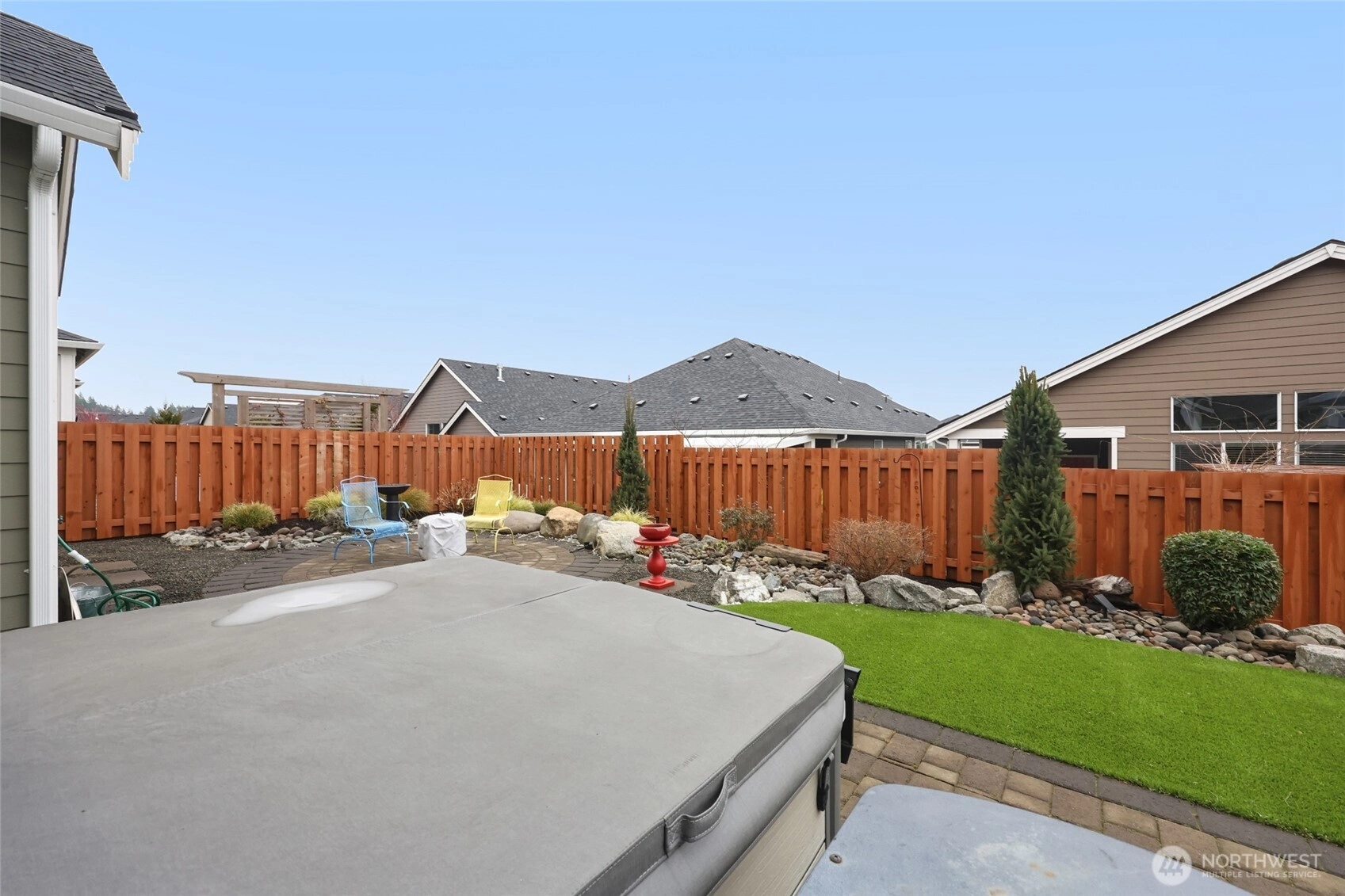 Better than NEW! 2023 move in ready 2 bedroom 1 3/4 bath Aspen plan 1,704 sq ft in lovely active Senior 55 plus Ovation at Oak Tree. 2 generous bedrooms plus a den/office. Primary bedroom with stylish ensuite complete with walk in shower & commode room faces the fully landscaped backyard. Full bathroom off the shared spaces. Built for entertaining this home has a HUGE kitchen island, walnut cabinets, accented with under & over cabinet lighting. The GROOVY barstools can stay! Quartz counter tops, engineered hardwood floors in all the main living spaces. Neutral Sun Shades are in place, Electric Car Charger in the 2 car garage, Hot Tub added to the fully landscaped low maintenance backyard. What a lovely relaxing view of the finished backyard, to top it off you can see Mt. Rainier's peak! Use the second bedroom for your office or guests. Den located off the kitchen, staged as a bedroom. Covered back patio for grilling or your perhaps morning coffee. Live the good life, Ovation has it all! Walking Trails, 2 Clubhouses, Swimming Pool, Community Hot Tub, Bocci Ball & 6 Pickleball Courts! Front yard maintained for you- all this at only $285 a month HOA fee AND there's no additional Buy-In Fee. WOW!