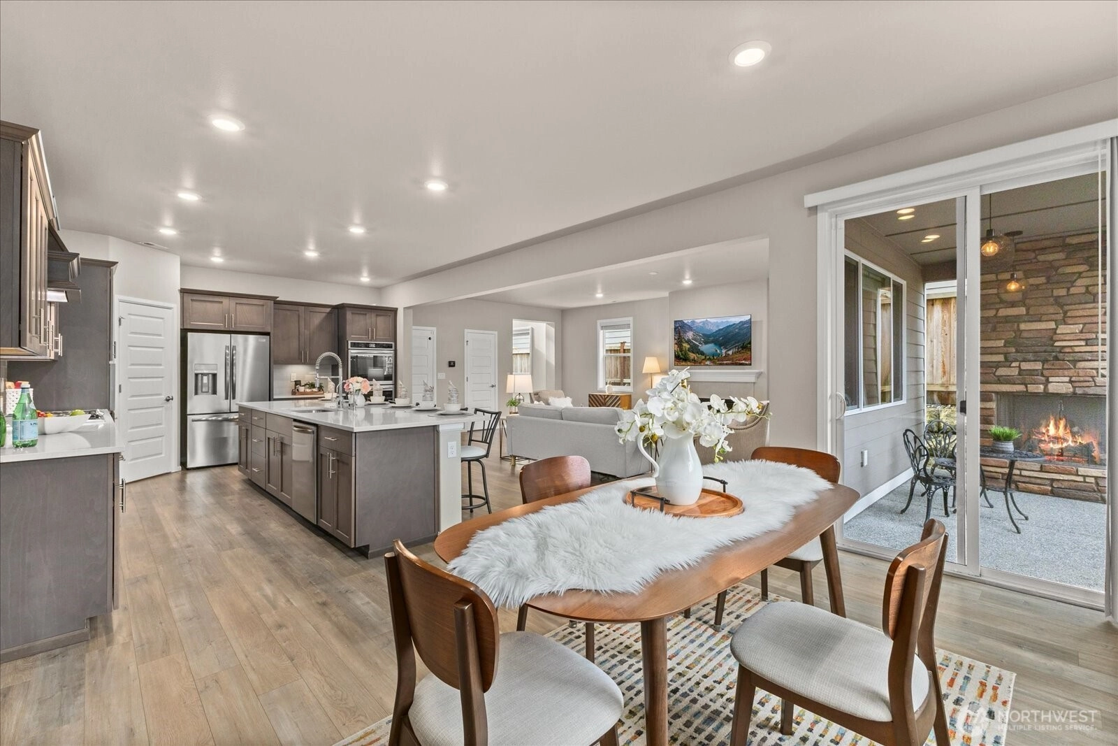 Welcome to this stunning 4 bedroom, 2.5 bath home with a spacious loft, offering one of the community’s most sought-after floorplans. Flooded with natural light, the open-concept living area features a cozy indoor gas fireplace and flows seamlessly into a chef-inspired kitchen with a 12-foot island, quartz countertops, and stainless steel appliances...perfect for everyday living and entertaining. Step outside to an exceptional outdoor retreat complete with a louvered pergola, stone paver patio, and a second gas fireplace, creating year-round enjoyment. Additional highlights include electric car charging, generous storage, and a location within a highly desirable neighborhood known for its community feel and convenience. This home blends modern comfort, thoughtful upgrades, and standout indoor-outdoor living in a truly special setting.