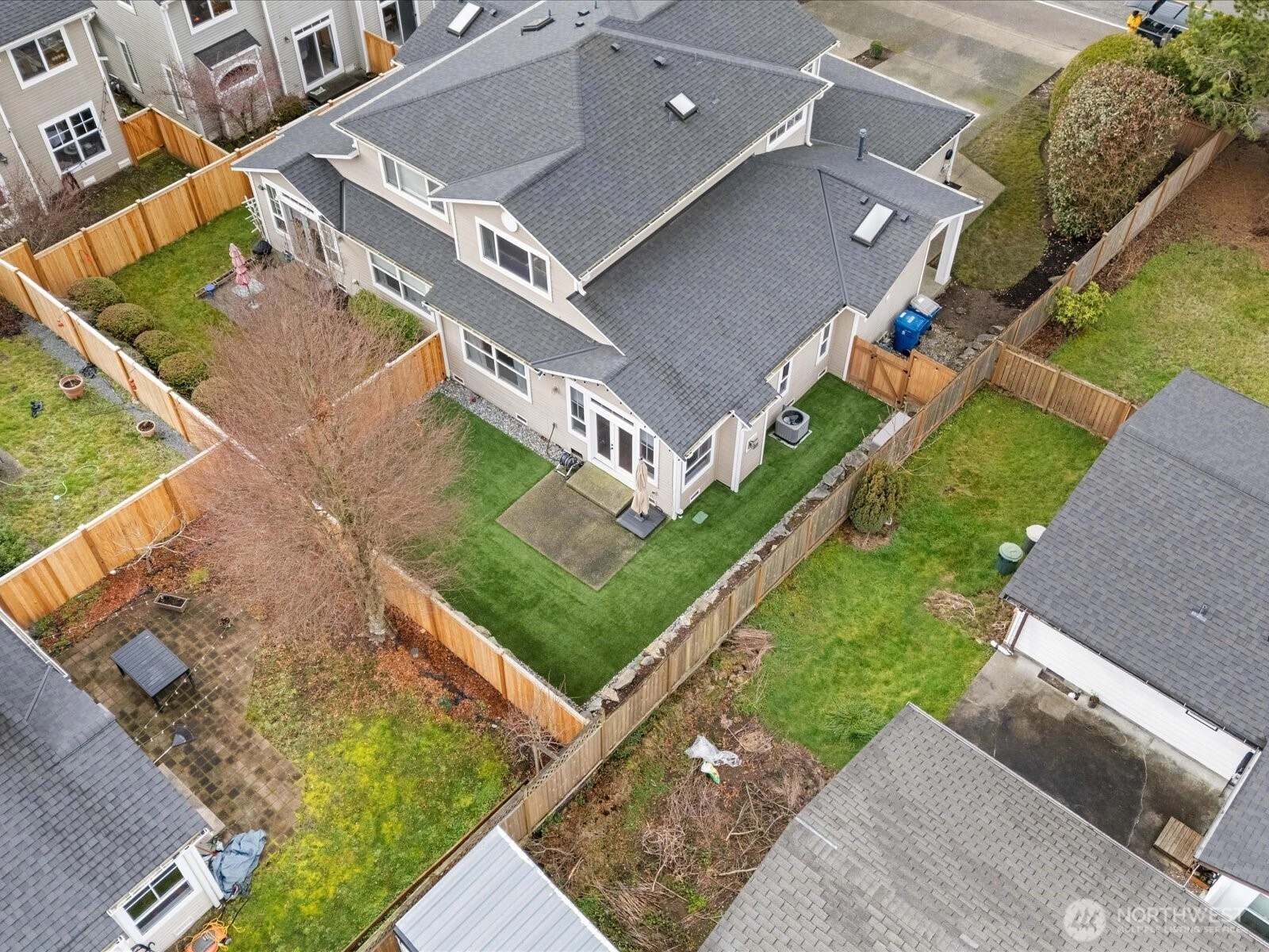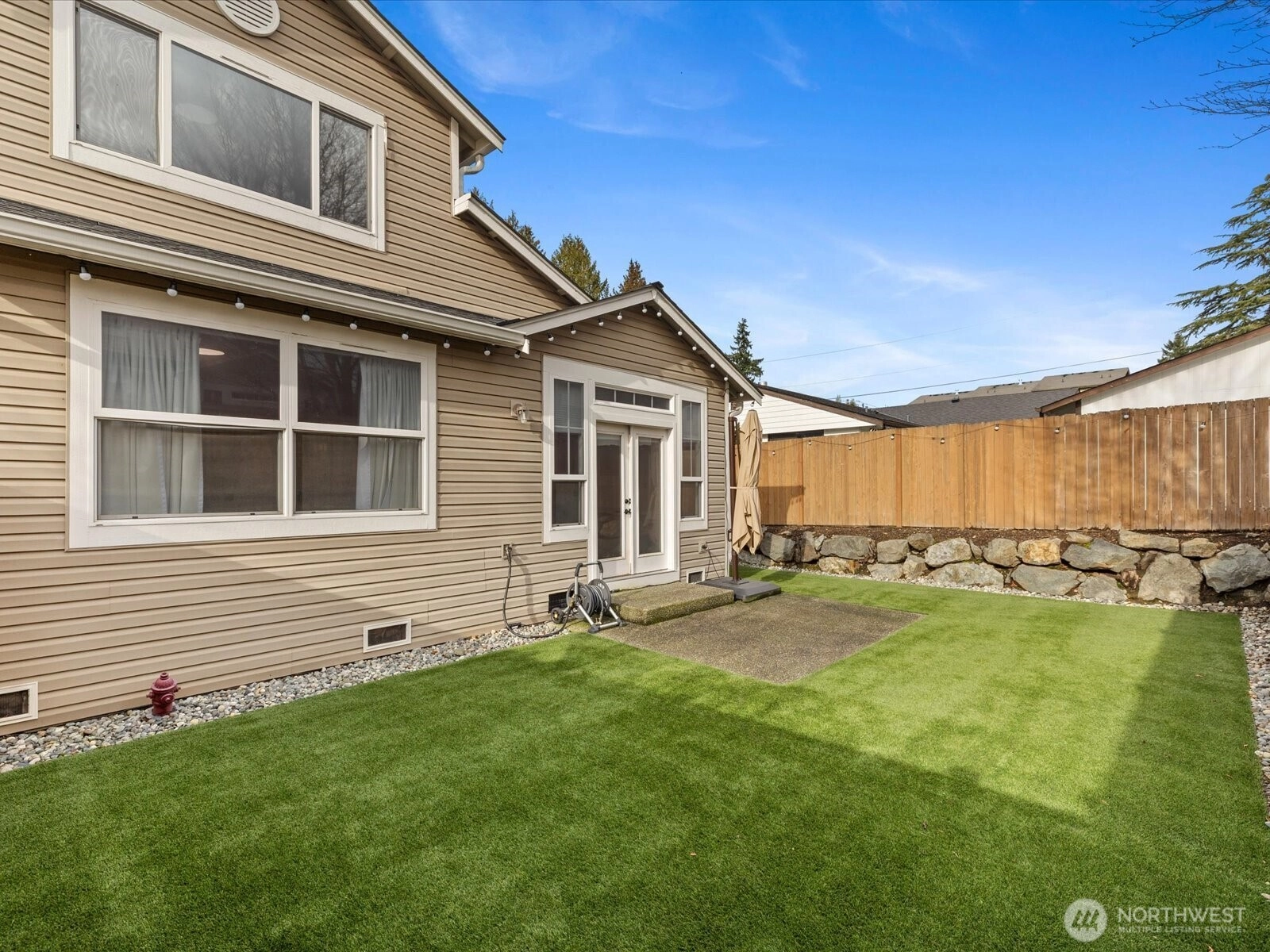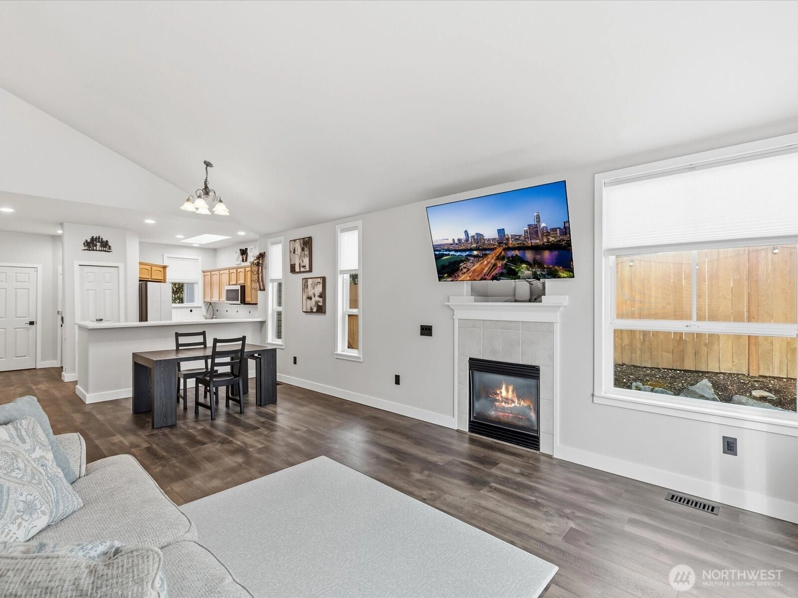 Light-filled open concept Edmonds townhome w/ soaring ceilings, cozy gas fireplace, & LVP floating floors spilling throughout the main. French doors open to a fully fenced, private outdoor oasis, w/ astroturf, & an oversized patio rarely found in townhome living. Primary bedroom on the main offers a walk-in closet w/ built-ins, & a spacious ensuite bathroom. Kitchen includes a pantry, like new appliances, tons of counter/cabinet space, & breakfast bar. Many upgrades including custom window treatments, w/ blackout curtains, landscaping, paint, furnace & AC heat pump. All this, & abundant storage, 2-car garage in a small, well-maintained community w/ HOA-managed front lawns. Lives like a single-family home w/ the ease of low-maintenance living. Commuters Dream - less than 3 miles from Light Rail!