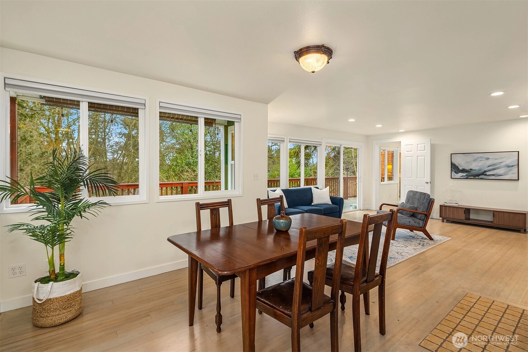 View Ridge retreat offers privacy and tranquility with the convenience of urban living! Inviting main level includes formal living and dining rooms, updated kitchen and a sunlit family room. Walls of windows open to an expansive deck running the full length of the home. Primary bedroom with ensuite bath, plus two additional bedrooms and bath. Potential lower level ADU with private entry features a full kitchen, family room, bedroom, home office and 3/4 bath. Incredibly private, fully fenced front and rear yards. Thoughtful improvements include updated plumbing and electrical, fresh interior paint and refinished hardwood floors. Driveway parking for boat or RV. Fantastic location with access to top rated schools and community parks, welcome home!