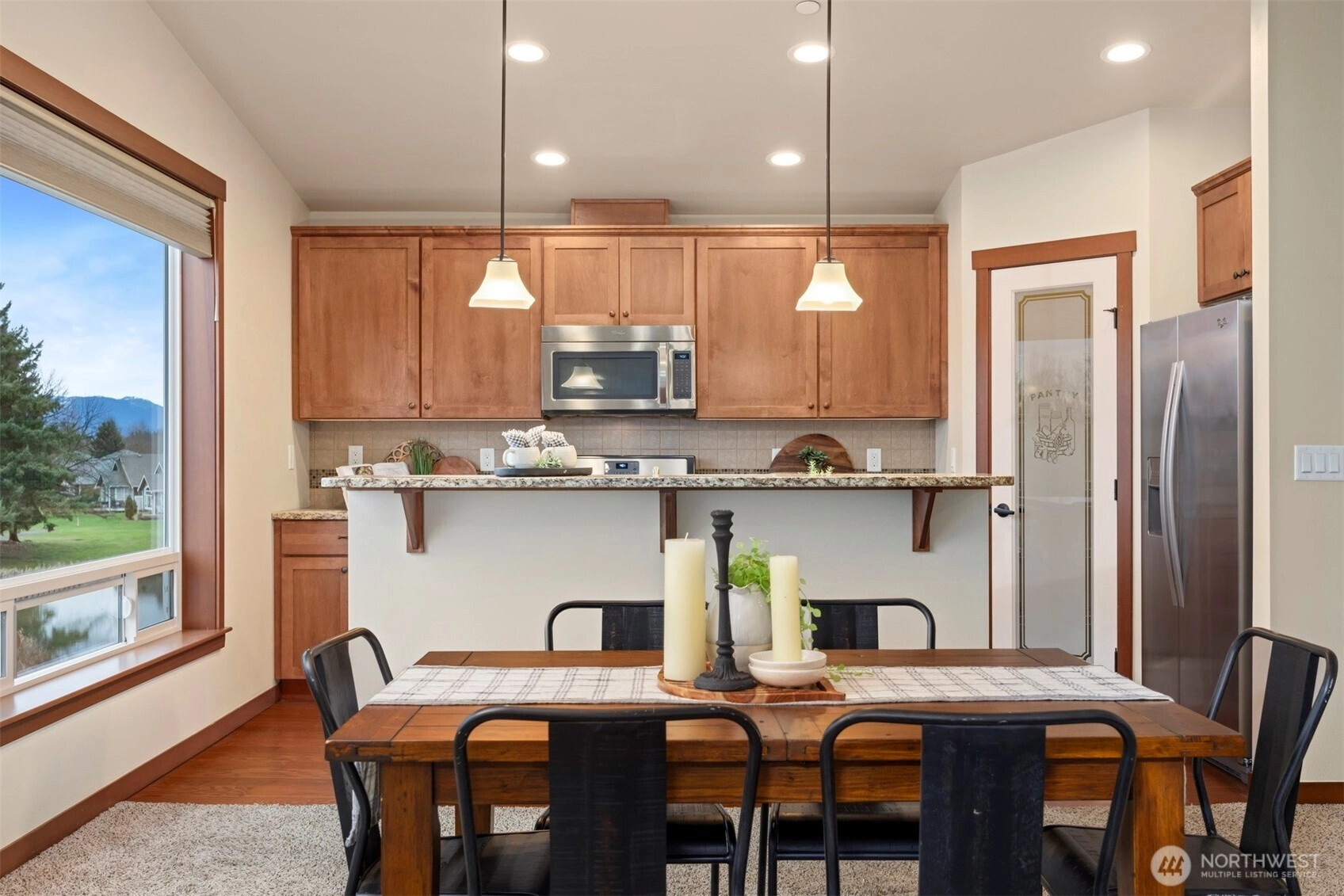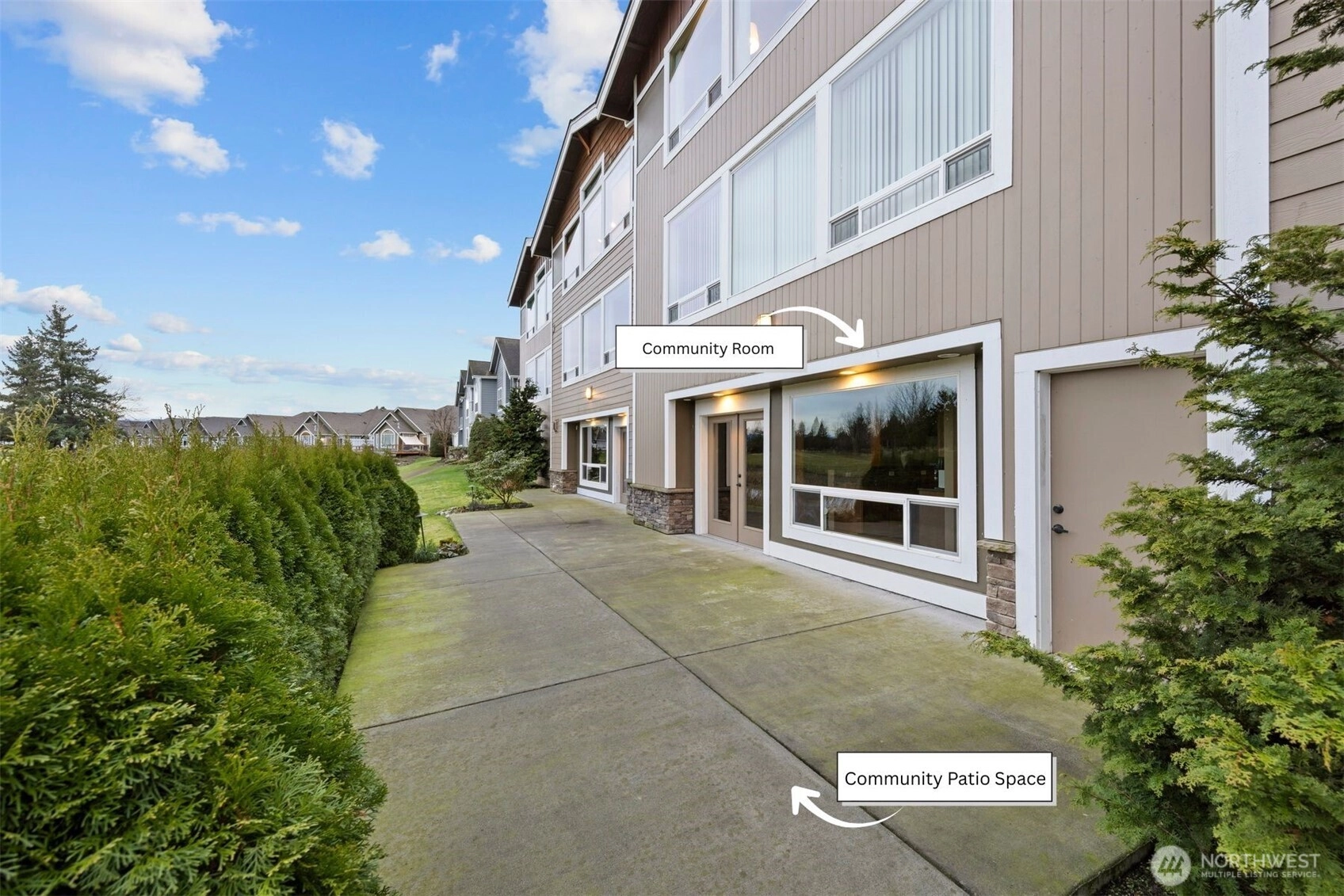 Perched above a sweeping woodland meadow with panoramic mountain views, this elevator accessed top-floor condo offers space, light, and long-term value in one of Lynden’s most desirable settings. Located along the former Homestead golf course, the outlook feels open and expansive—framed by mature trees, rolling greenspace, and wide skies. With abundant wildlife and beautiful sunrises, "staying in" will quickly become your favorite pastime. Inside, vaulted ceilings and oversized windows create an airy, light-filled living space designed to feel both comfortable and refined. Quality construction is evident throughout, with ductless heating and cooling, granite countertops, a gas fireplace and gas cooking, and thoughtfully designed, spacious bedrooms. A third bonus room provides the perfect flex space for crafting, office work, or hobbies. If low maintenance is your vibe, you'll find it here. Storage is abundant—rare for condo living—with generous closets, a true walk-in pantry, in-unit laundry, and an attached 575sqft two-car garage, a practical staple for life in the PNW. Beyond the residence, owners enjoy access to an impressive community gathering space featuring a large great room, full kitchen, half bath, and patio—ideal for hosting celebrations and entertaining guests. Located just minutes from the heart of Lynden, you’ll enjoy easy access to parks, trails, local shops, dining, and community events, along with quick connections to Bellingham and the Canadian border.