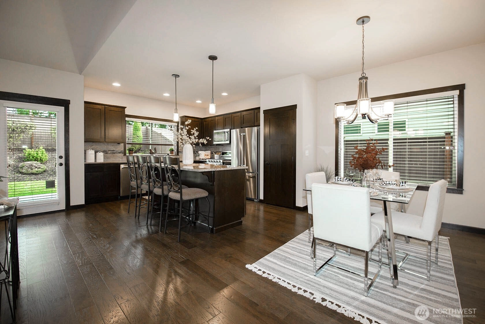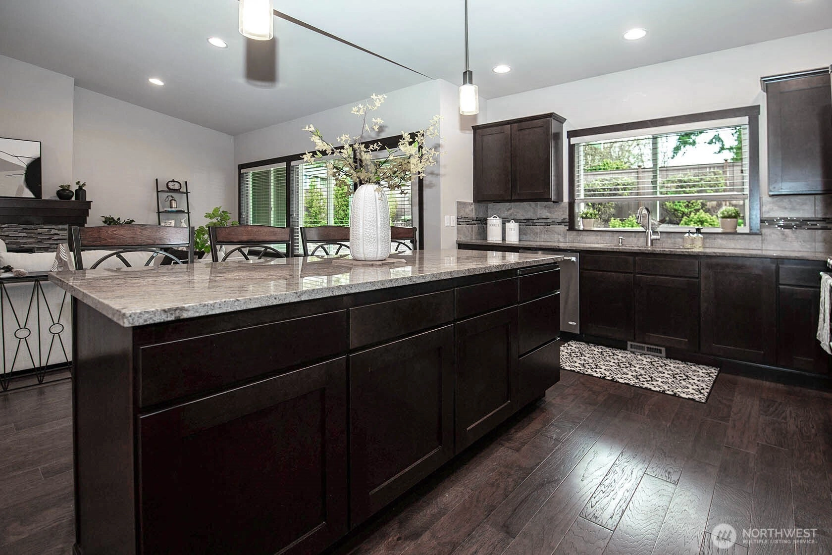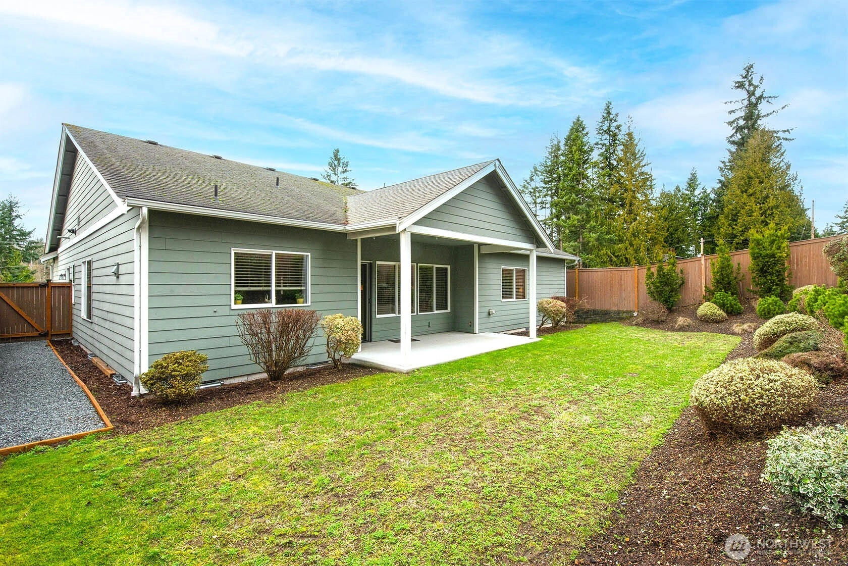Nestled on a generous lot, this beautifully kept rambler offers the finest in single-level living by blending style and comfort with timeless elegance. Gleaming hardwood floors, wood-wrapped windows, and soaring cathedral ceilings create a warm, sophisticated atmosphere, while high-end finishes provide modern convenience. The chef’s kitchen features stainless-steel KitchenAid appliances, slab granite countertops, and a large granite island, along with a sunny dining area that flows seamlessly into the family room with a cozy gas fireplace, creating a bright, open great-room concept ideal for everyday living and effortless entertaining. Just off the entry, a spacious office with French doors is perfect for working from home or as a hobby space. Down the hall you will find three bedrooms including a serene Primary Retreat with a large walk-in closet and spa-like en-suite bath with a walk-in shower. Outside, enjoy a private, fully fenced backyard with a spacious covered patio overlooking beautifully manicured landscaping, perfect for outdoor dining and relaxation. Additional features include a double-car garage with storage racks, paved RV parking, and zero-grade, curbless entry with wide hallways and doors for accessibility and convenience. Located in a desirable enclave of single-story homes, all just minutes from the Downtown Everett Waterfront, Everett Mall, top-rated schools, shopping, and restaurants.