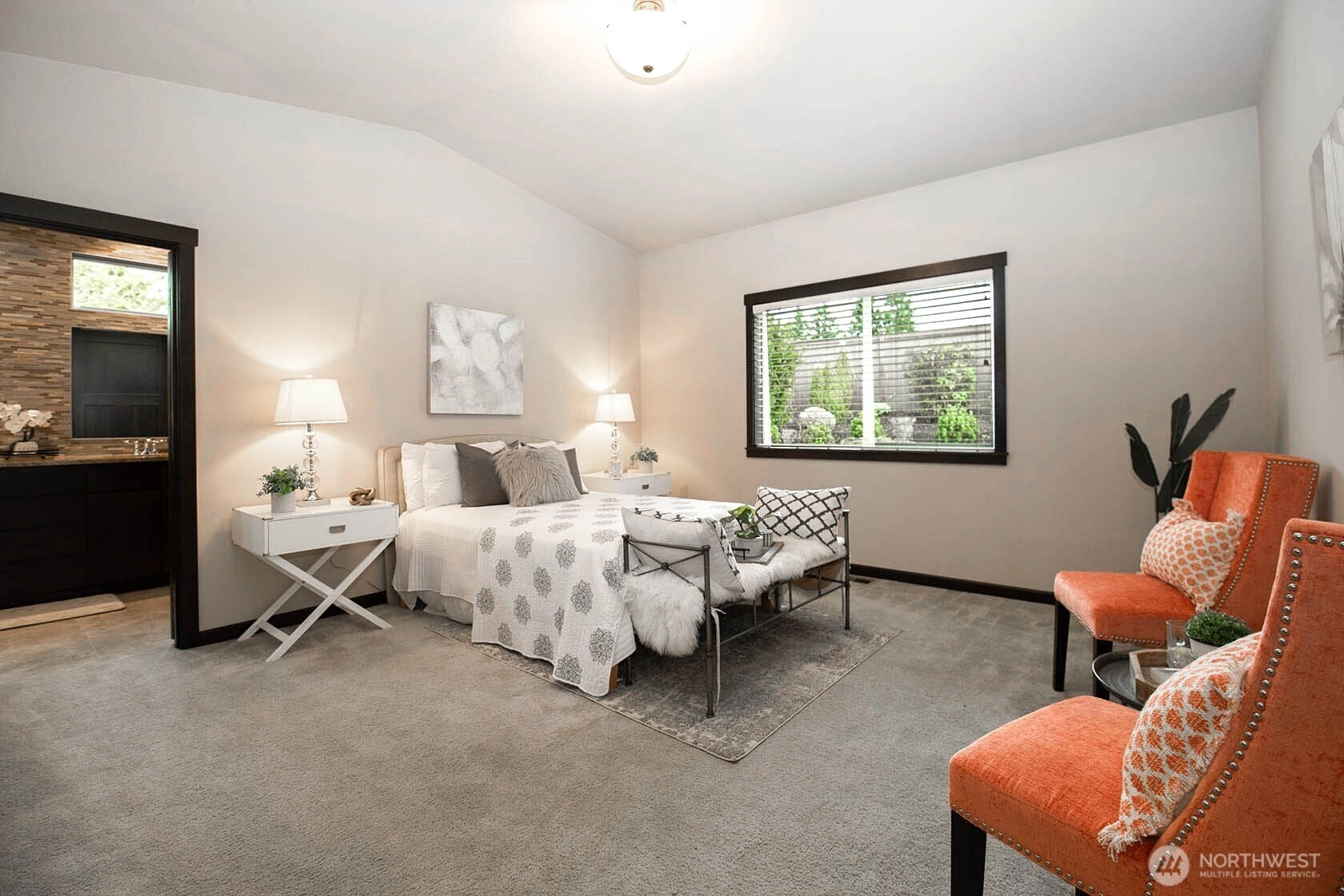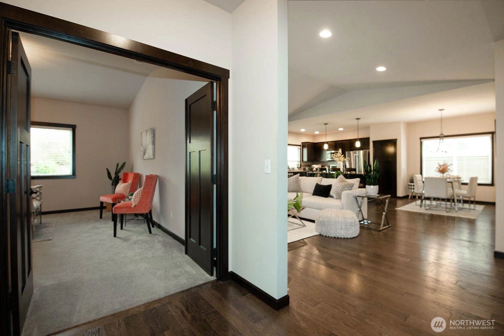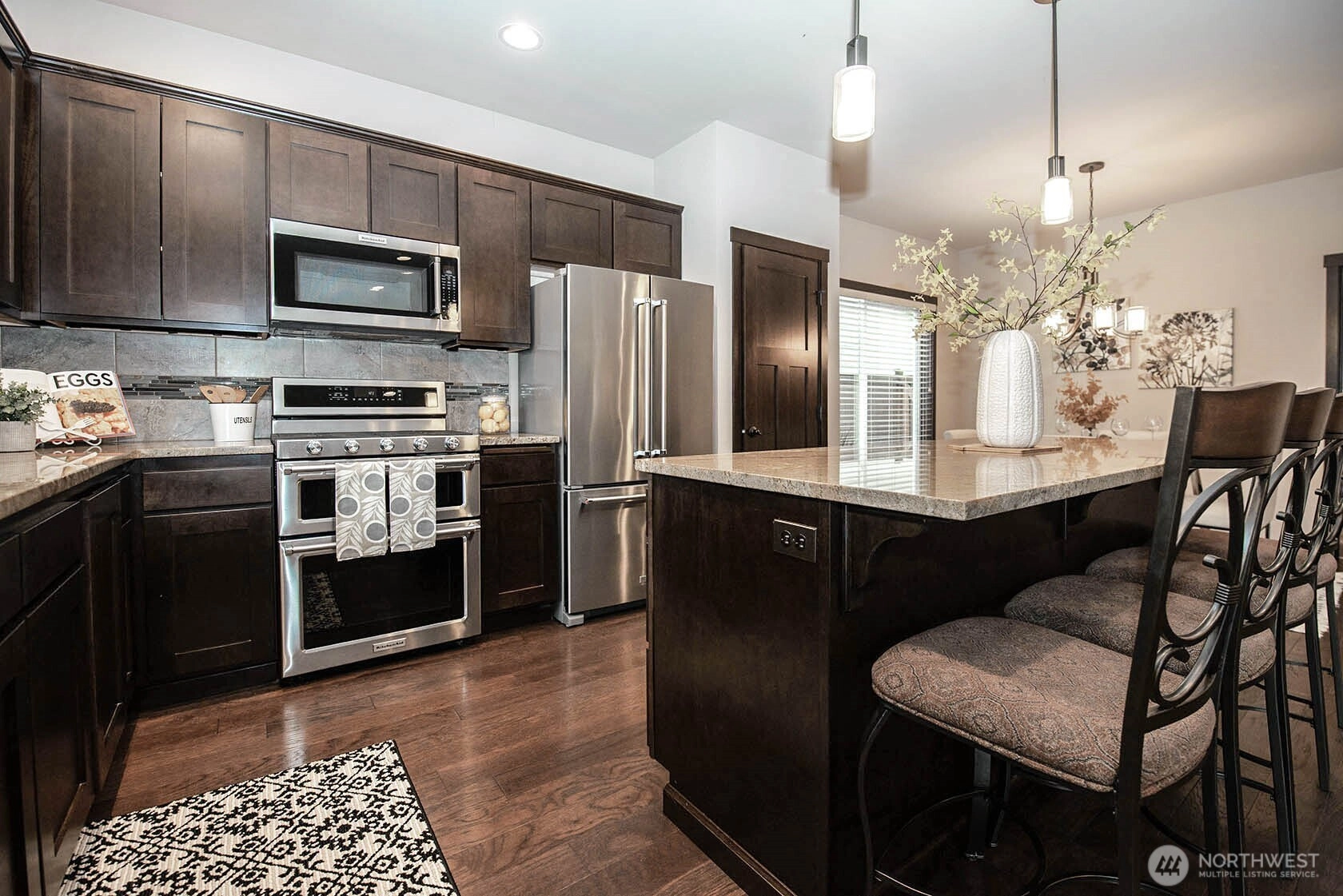 Nestled on a generous lot, this beautifully kept rambler offers the finest in single-level living by blending style and comfort with timeless elegance. Gleaming hardwood floors, wood-wrapped windows, and soaring cathedral ceilings create a warm, sophisticated atmosphere, while high-end finishes provide modern convenience. The chef’s kitchen features stainless-steel KitchenAid appliances, slab granite countertops, and a large granite island, along with a sunny dining area that flows seamlessly into the family room with a cozy gas fireplace, creating a bright, open great-room concept ideal for everyday living and effortless entertaining. Just off the entry, a spacious office with French doors is perfect for working from home or as a hobby space. Down the hall you will find three bedrooms including a serene Primary Retreat with a large walk-in closet and spa-like en-suite bath with a walk-in shower. Outside, enjoy a private, fully fenced backyard with a spacious covered patio overlooking beautifully manicured landscaping, perfect for outdoor dining and relaxation. Additional features include a double-car garage with storage racks, paved RV parking, and zero-grade, curbless entry with wide hallways and doors for accessibility and convenience. Located in a desirable enclave of single-story homes, all just minutes from the Downtown Everett Waterfront, Everett Mall, top-rated schools, shopping, and restaurants.
