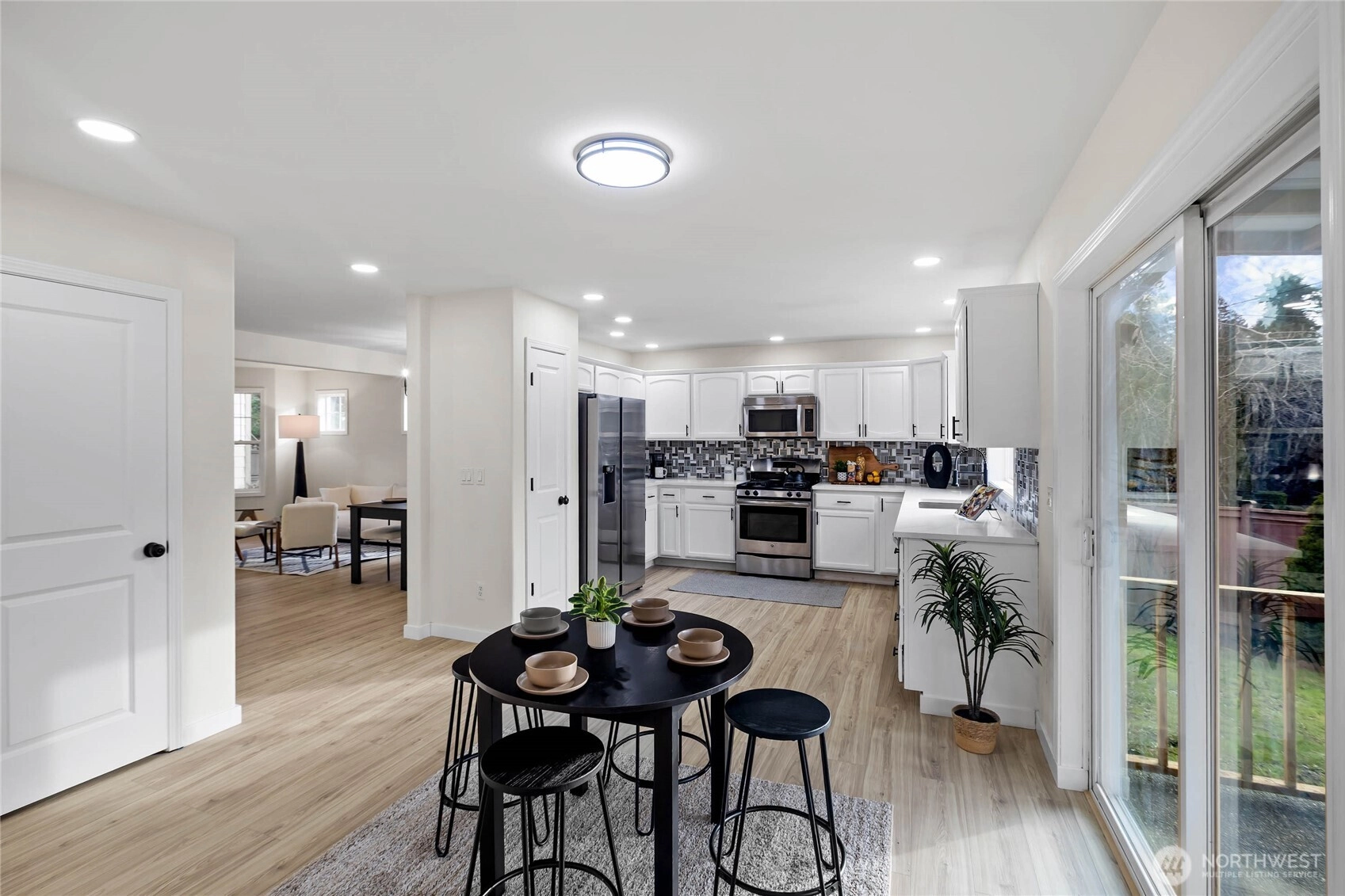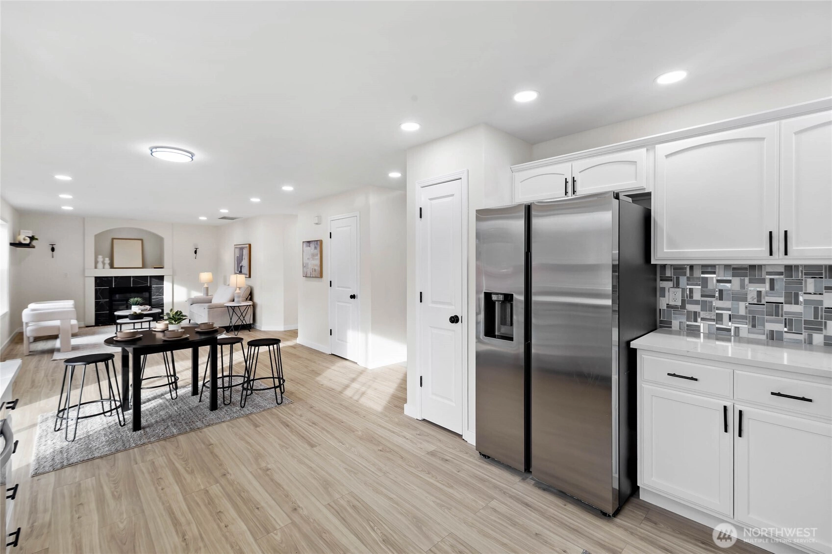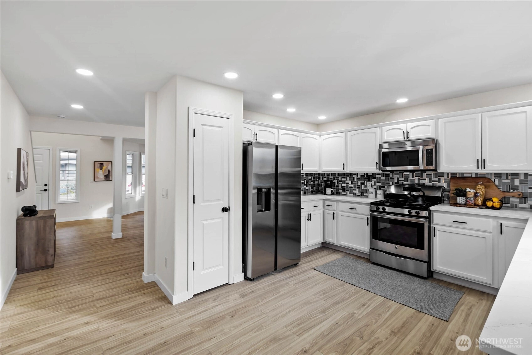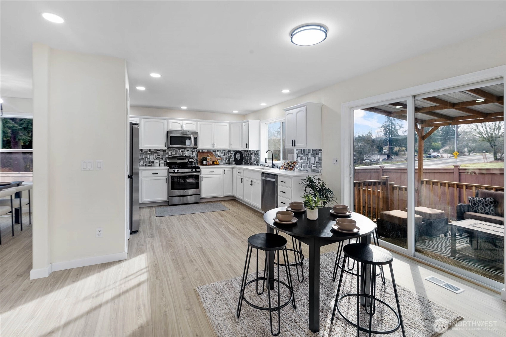Discover a beautifully updated West Hill home where every upgrade feels intentional and every space feels welcoming. Set on a corner lot at the entrance of a quiet cul-de-sac, this refreshed residence offers rare privacy next to a peaceful greenbelt. Inside, natural light highlights the new LVP flooring, fresh paint, modern lighting, black hardware, and new baseboards. The layout includes formal living and dining rooms, a comfortable great room, and a bright breakfast nook. The kitchen features refaced cabinetry, new countertops, a stainless steel sink and faucet, a new garbage disposal, and updated hardware. All three bathrooms have been fully remodelled with new tile, quartz surfaces, modern fixtures, and glass accents. Upstairs, four spacious bedrooms include a generous 5-piece primary suite with excellent comfort and storage. Major improvements add long-term value: new roof (2025), new refrigerator (2025), covered patio (2022), A/C (2020), updated garage floors, New blinds (2026) and stonework around the fireplace. Corner-lot perks include extra yard space and abundant guest parking. Pre-inspected for peace of mind and offering quick access to I-5, Hwy 167, Hwy 18, and the Kent Light Rail, this move-in-ready home blends modern updates with a peaceful setting—truly a MUST SEE!