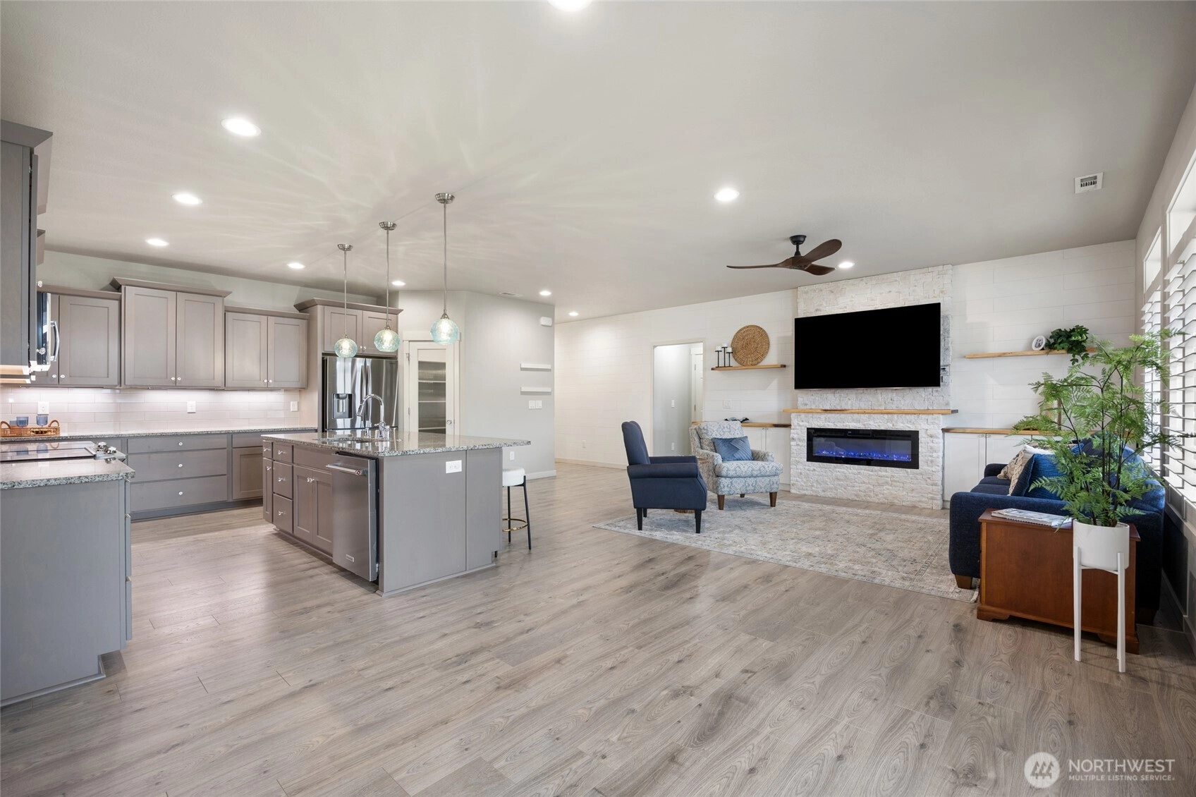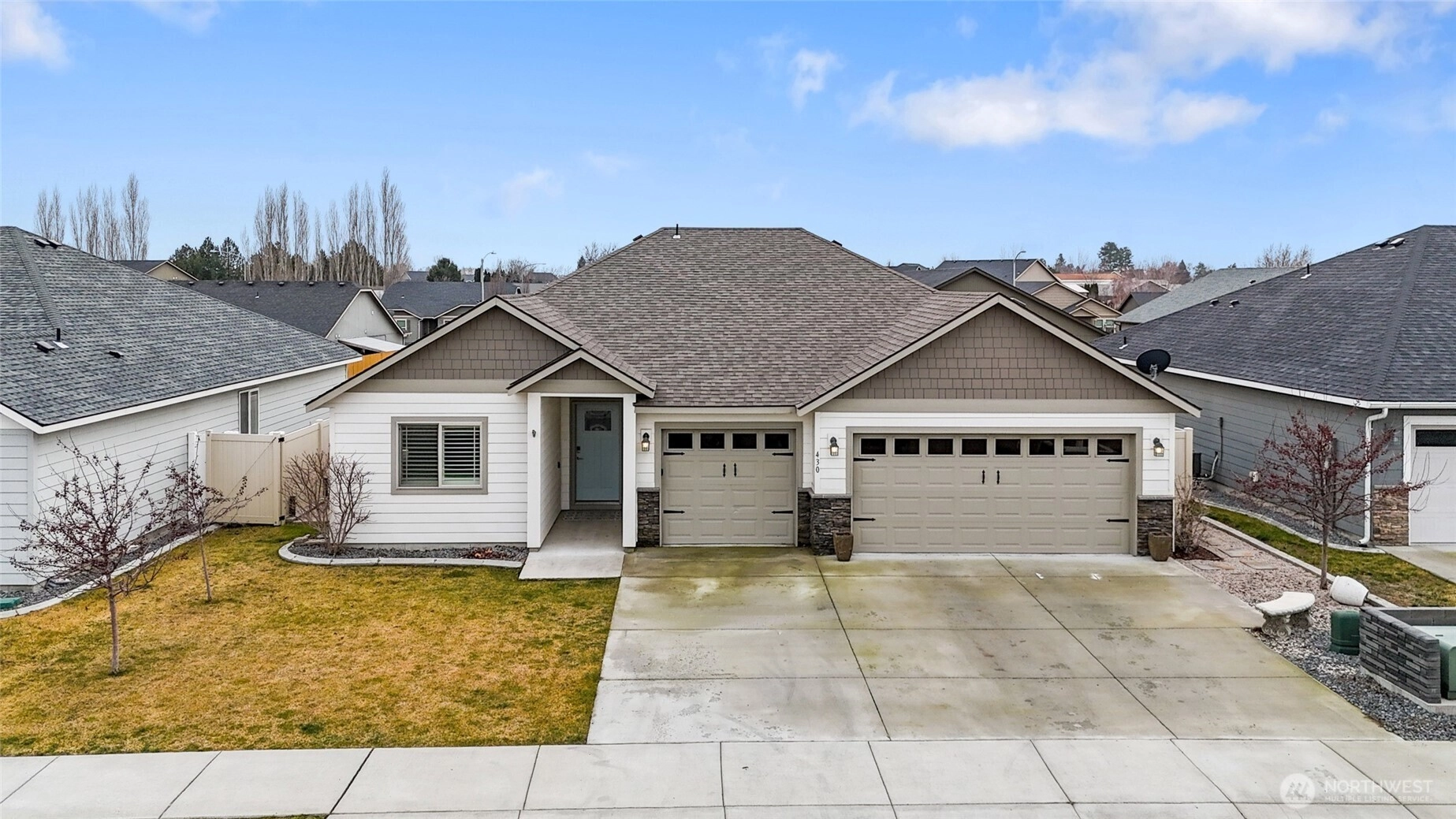 Discover this beautifully crafted Alderbrook custom home offering 1,782 sq. ft. of thoughtful design and quality upgraded custom built-ins and finishes. Enjoy 3 spacious bedrooms, 2 modern bathrooms, and an inviting great room with electric fireplace in the uniquely designed shiplap wall with custom shelves. There's laminate flooring throughout and the gourmet kitchen features stunning granite countertops, perfect for cooking and entertaining with a sit-up bar for 5 stools. The primary suite includes a convenient bathroom with a barndoor, added for comfort and privacy and located at the back of the house. The other bedrooms are separated, one at the front, close to the front door and the other at the back on the other side of the house by the laundry room. A fully insulated and sheet-rocked 3-car garage provides ample space for vehicles, storage, or hobbies. One bay is separated by a wall for storage or workshop but is also useable as a 3rd garage. Step out the back slider to a covered patio with a hot tub in the fully level landscaped yard with underground sprinklers, a 6' fence creating a private low-maintenance outdoor oasis. Even the side of the home is landscaped with pavers and solar lighting. This home is packed with upgrades and thoughtful touches, and there's so much more. Truly a must-see for anyone seeking comfort, style, and quality craftsmanship including the wood wrapped windows and shutters. Call now!