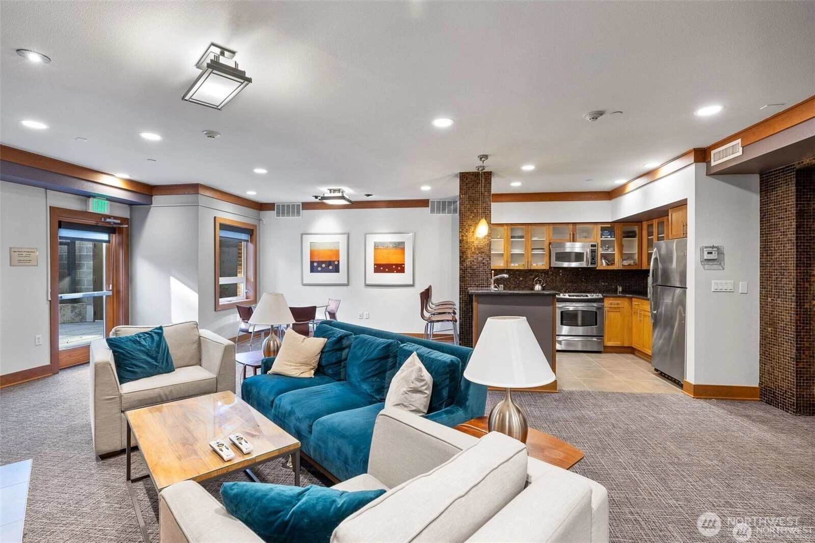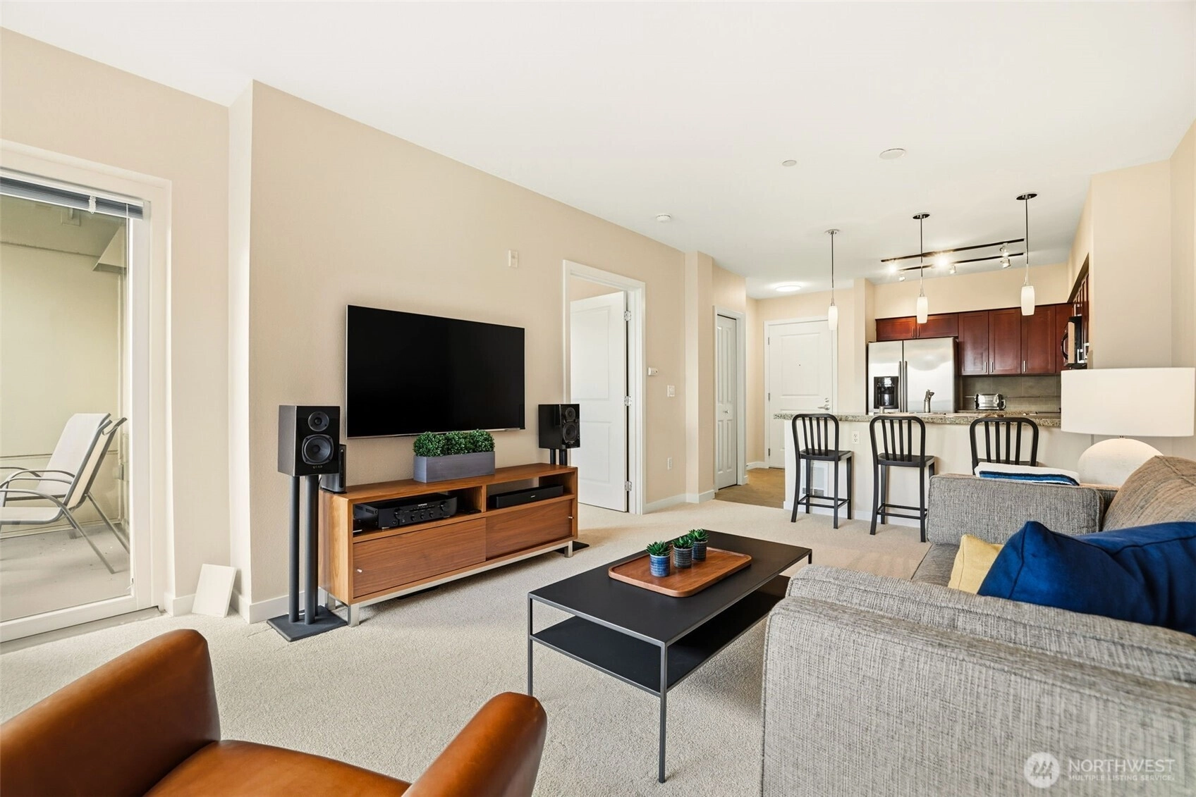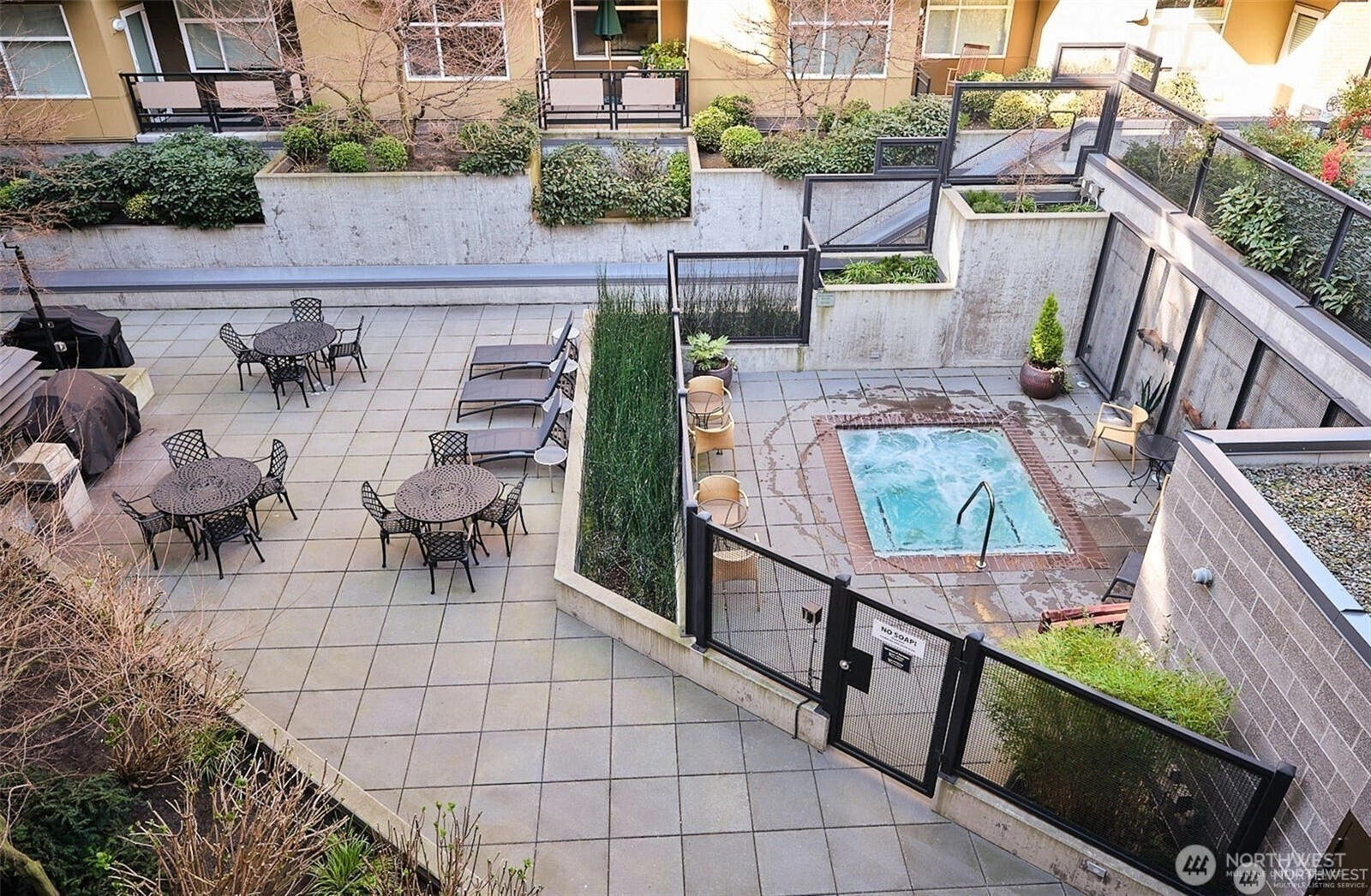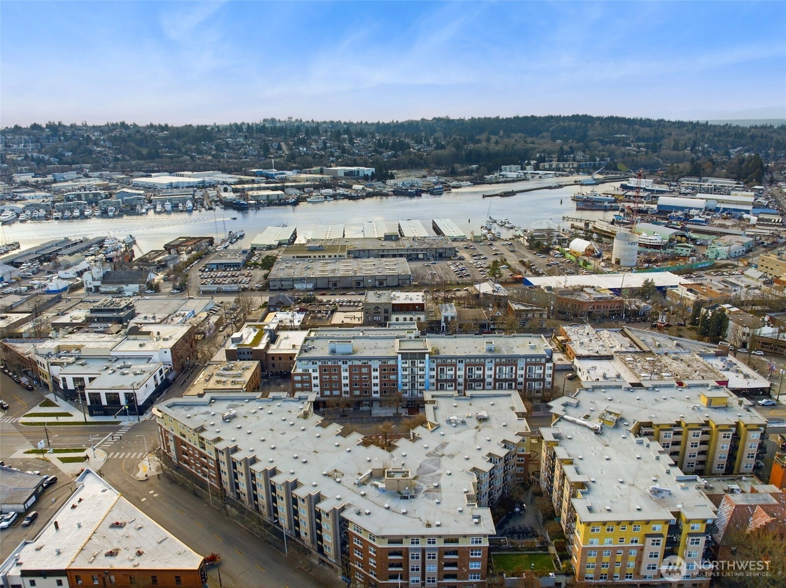 This 4th level condo in Ballard's Canal Station is filled with natural light, offering stunning views of the courtyard and overlooking the second level rooftop garden for a bit of that calm, zen feeling in the city. Great room has large windows and a full glass door to the view deck. Open kitchen comes complete with natural stone countertops, stainless appliances and well planned, intentional lighting over kitchen and bar seating area. Spacious bedroom with generously sized walk-in closet. In pristine condition and featuring new carpet, fresh interior paint, and a new range in the kitchen... the owner's continued meticulous care for the unit is evident. Key amenities include gym, spa, sauna, BBQ, lounge, secure parking garage and an on-site manager to assist with your needs. The location boasts great walkability and is a remarkable opportunity for a place to live in style and with convenience. No rental cap and well managed, this is a great place to live or invest to rent. One garage parking space is included.
