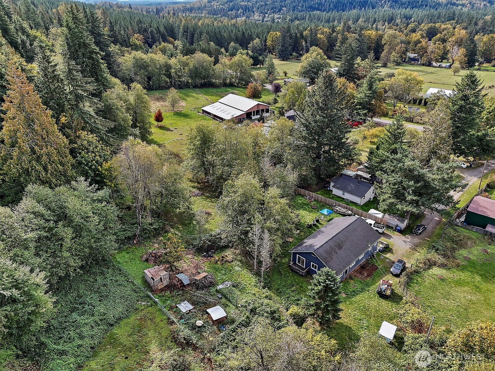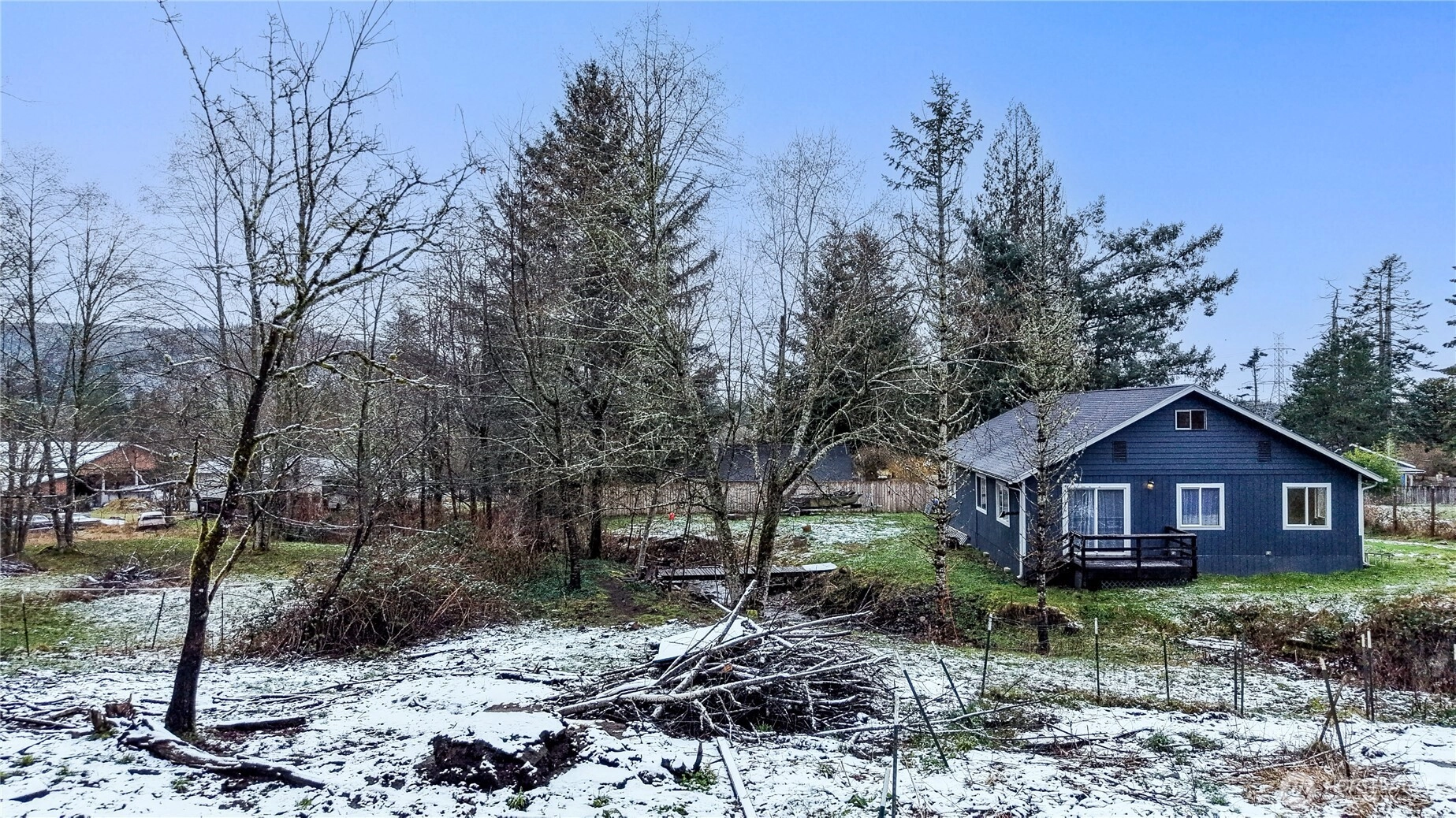 Charming 3-bedroom, 2-bath home nestled on nearly one acre in the peaceful community of Ravensdale. Surrounded by nature, this inviting property offers a serene Pacific Northwest lifestyle with the convenience of nearby amenities. Inside, enjoy a light-filled interior featuring new flooring, fresh neutral paint, and a cozy stove that creates a warm and welcoming atmosphere. The open living area is enhanced by large windows and a sliding glass door that leads to a spacious deck—perfect for entertaining, morning coffee, or unwinding while taking in tranquil forest views. Upstairs, the home offers flexible living spaces with charming sloped ceilings, ideal for bedrooms, a home office, guest space, or a creative studio. Each room provides versatility to suit your lifestyle needs. Outside, the expansive yard is framed by mature trees, offering privacy and plenty of room for gardening, play, outdoor gatherings, or simply enjoying the peaceful surroundings. Located just minutes from Maple Valley, Covington, and Black Diamond, this home offers the best of quiet country living with easy access to shopping, dining, schools, and recreation. A unique opportunity to own a private retreat in a beautiful, natural setting—perfect for those seeking space, comfort, and connection to the outdoors.