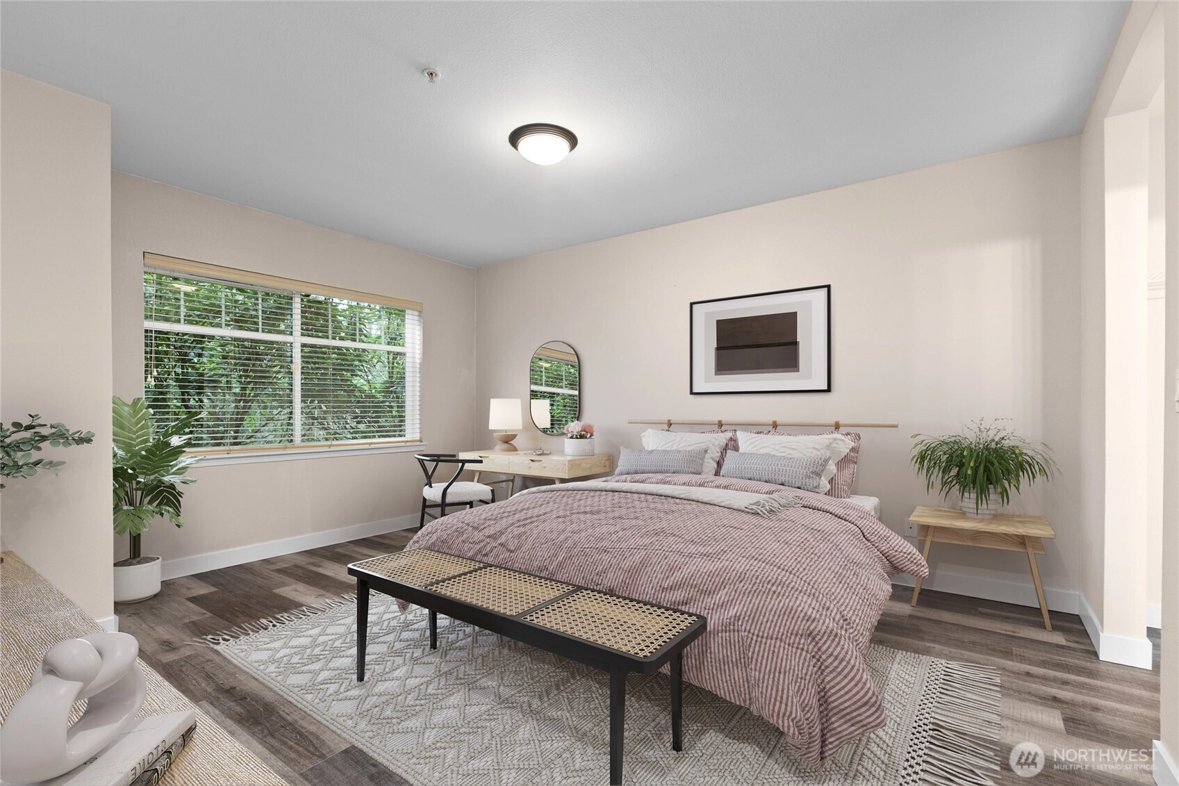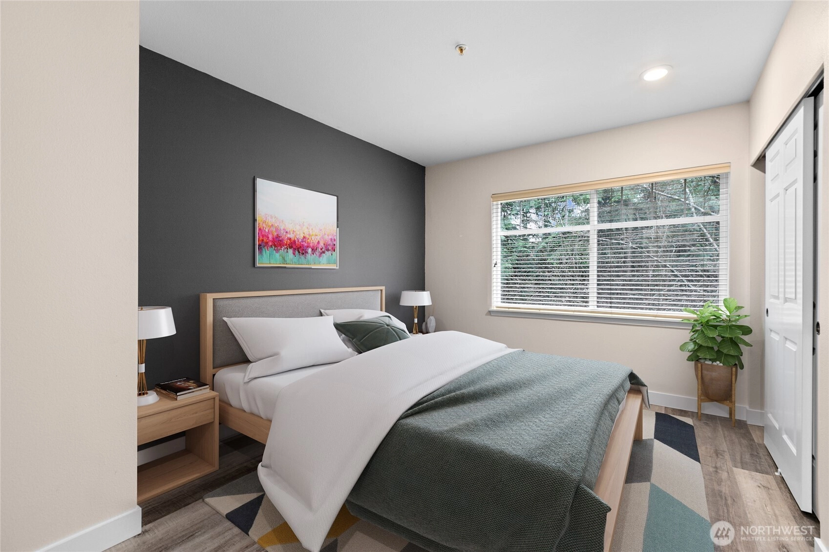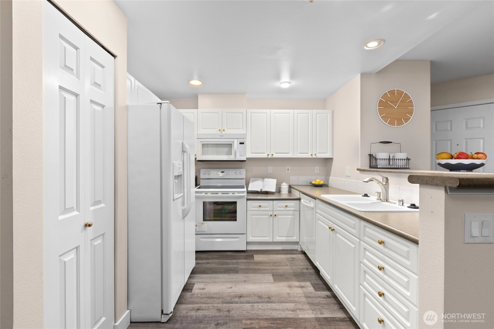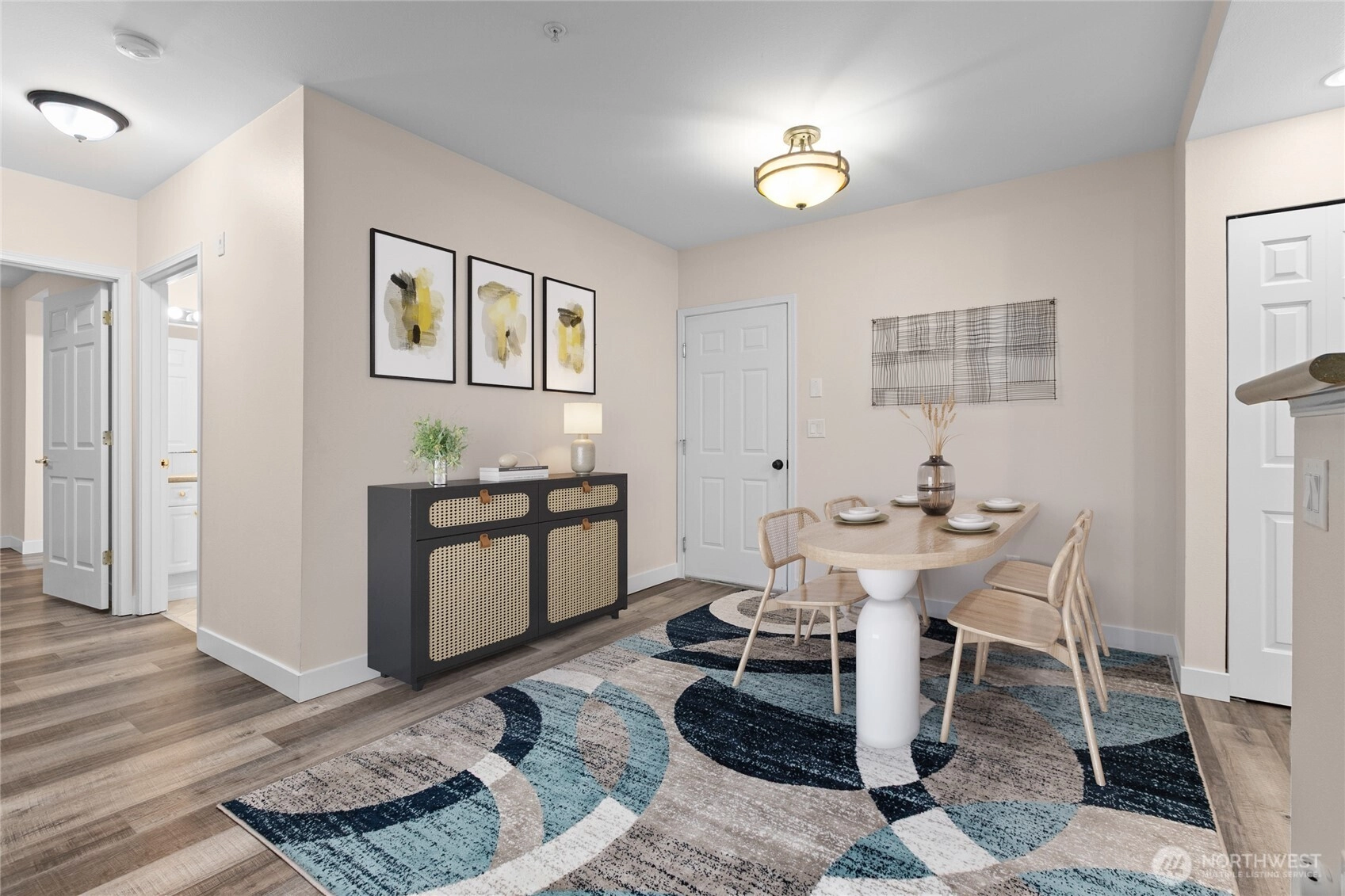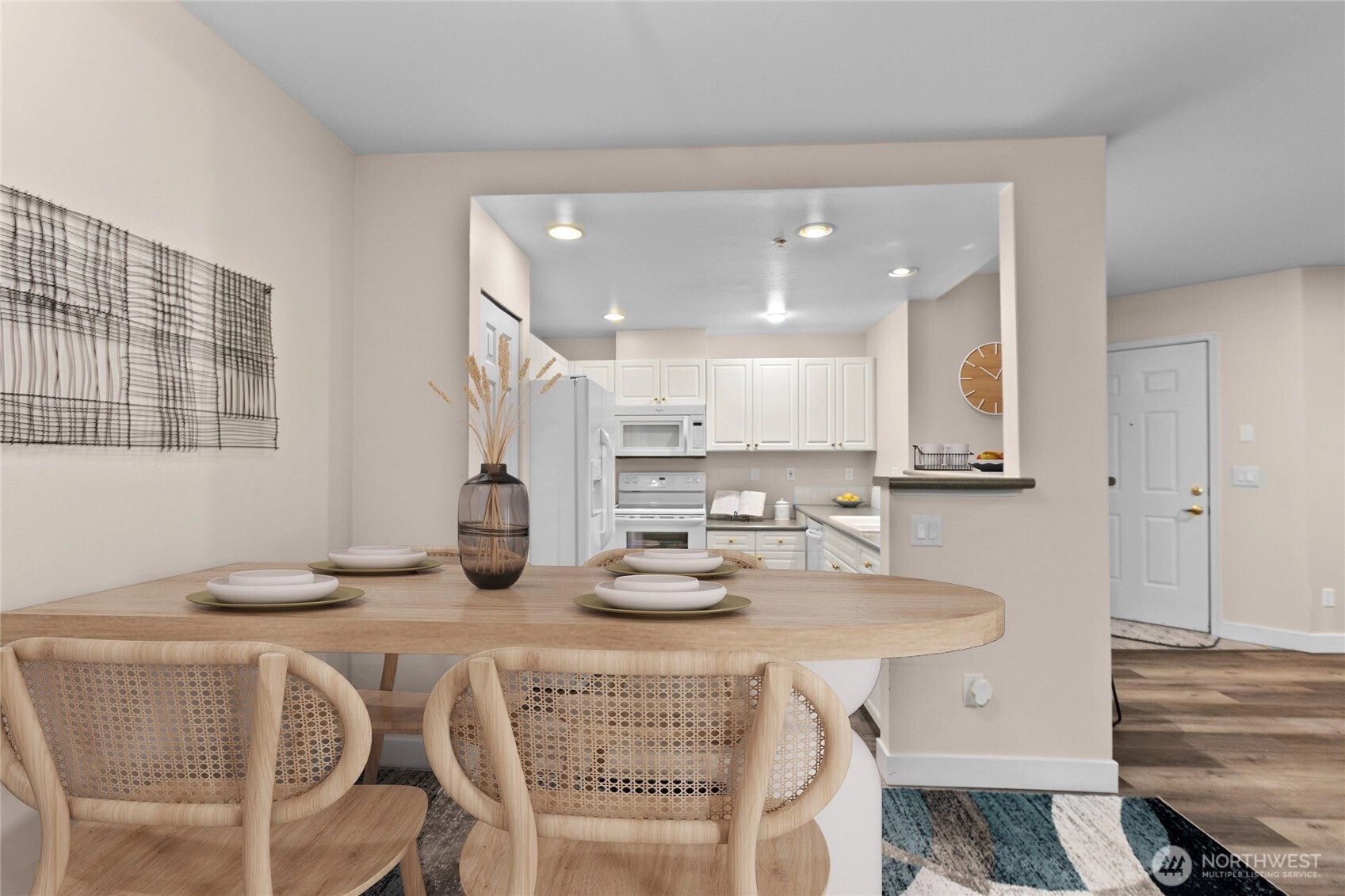 Welcome to this inviting ground-level condo offering 1,011 square feet of thoughtfully designed living space. This 2-bedroom, 1.75-bath home features durable LVP flooring that flows seamlessly throughout, creating a modern and cohesive look. The open living area centers around a cozy gas fireplace and opens directly onto a private patio—perfect for relaxing or entertaining. The well-appointed kitchen includes bar seating for casual meals, generous cabinet storage, and a separate dining area for more formal gatherings. Both bedrooms are well sized. The secondary bedroom includes convenient double closets, while the primary suite boasts a walk-in closet and its own en-suite bathroom for added privacy and convenience. Practical features include a tandem garage with space for two full-size vehicles plus extra storage. With no rental cap, this property offers excellent flexibility for investors or future planning. Located in the heart of Lynnwood, you'll enjoy quick access to diverse shopping, dining options, and major freeways for easy commuting.