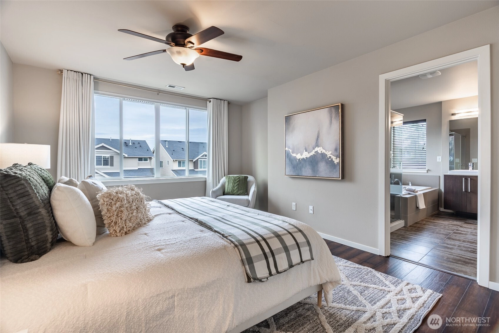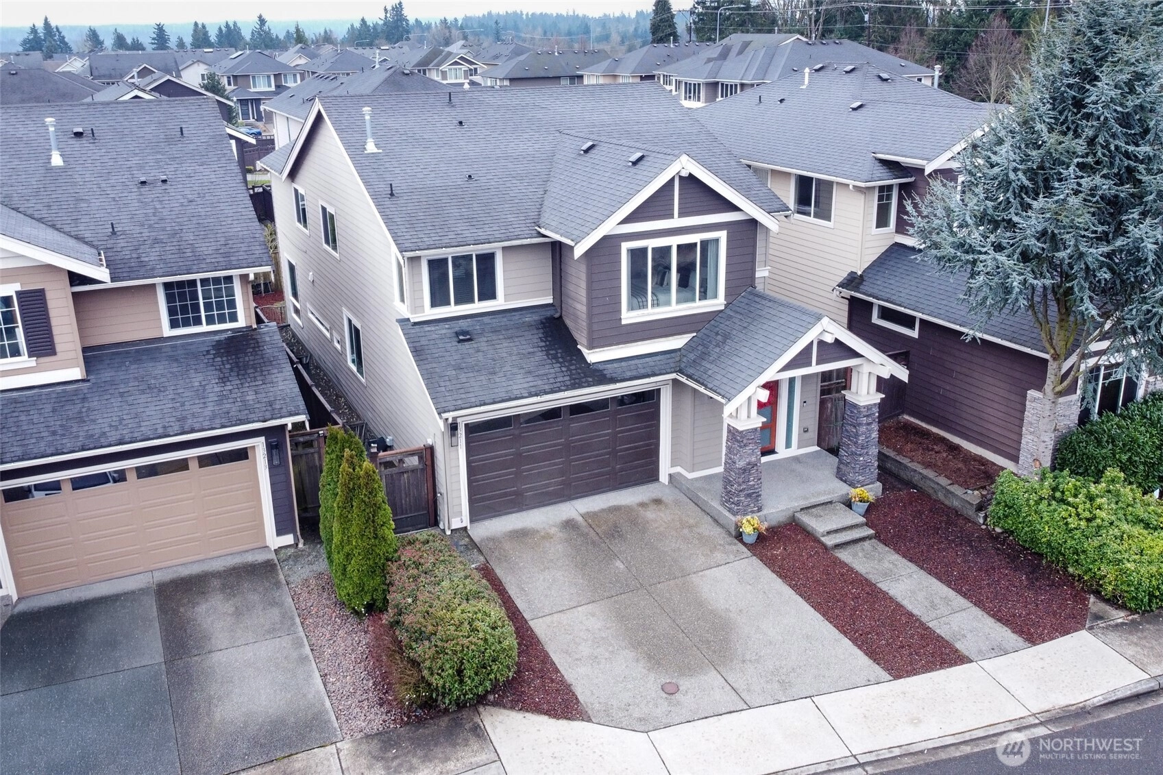 Lea Hill Luxury in Auburn! This gorgeous MainVue home in a beautiful area of Auburn boasts 5 bedrooms, 2.5 baths, and nearly 2,800 square feet of space to grow into! The main floor consists of an open concept style living room, dining room and kitchen with large island and 10 foot ceilings. Loads of windows let in ample amounts of natural light and the large island allows a maximum entertaining space! Quartz countertops, stainless steel appliances, gas range, and a walk-in pantry are just a few features that make this kitchen stand out. On the main floor, there is also a main floor bedroom with a closet that could be used as an office or guest room. The garage includes ductless mini-splits for heating and cooling providing a temperature controlled space for the garage for any hobby. Upstairs you'll find a giant loft area for a 2nd family/living room and 4 additional bedrooms. The oversized primary bedroom includes a 5 piece bath and a GIANT walk-in closet. There is a designated laundry room with additional storage. Outside includes a covered patio with a fireplace and a fully fenced backyard. Partial mountain views show from the top floor. Close to Hwy. 18 for great commuting and stores and restaurants just around the corner. Don't miss your chance to live in this incredible neighborhood in a high-quality construction home!