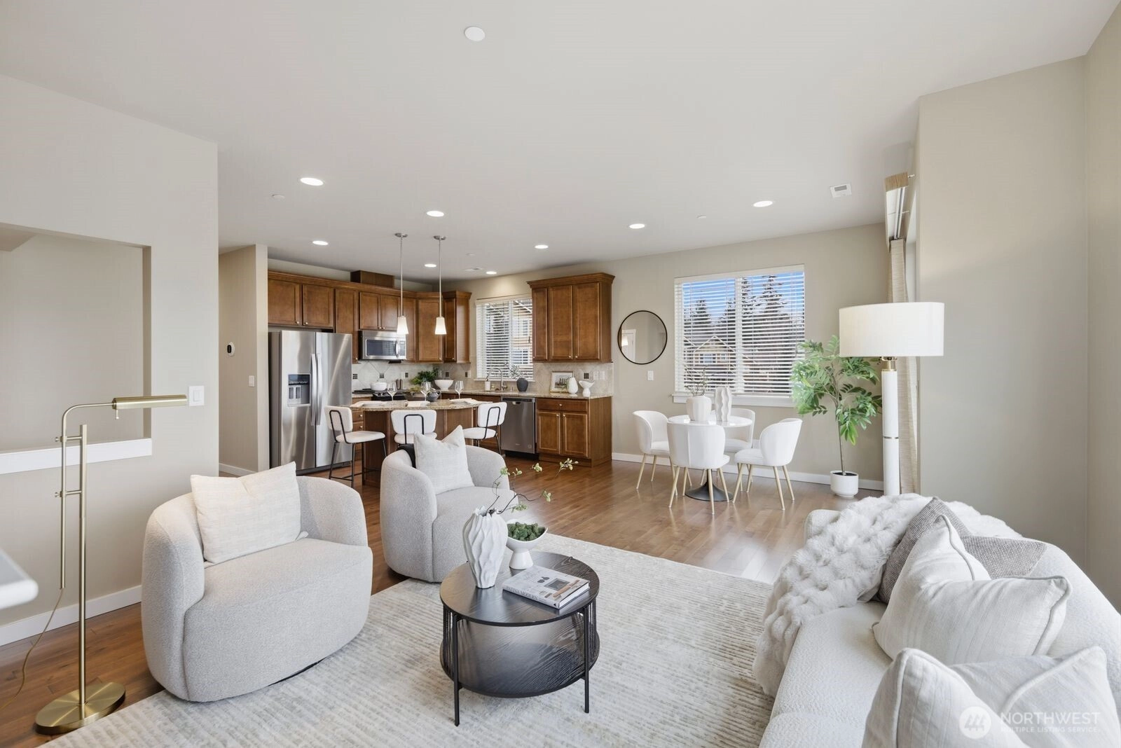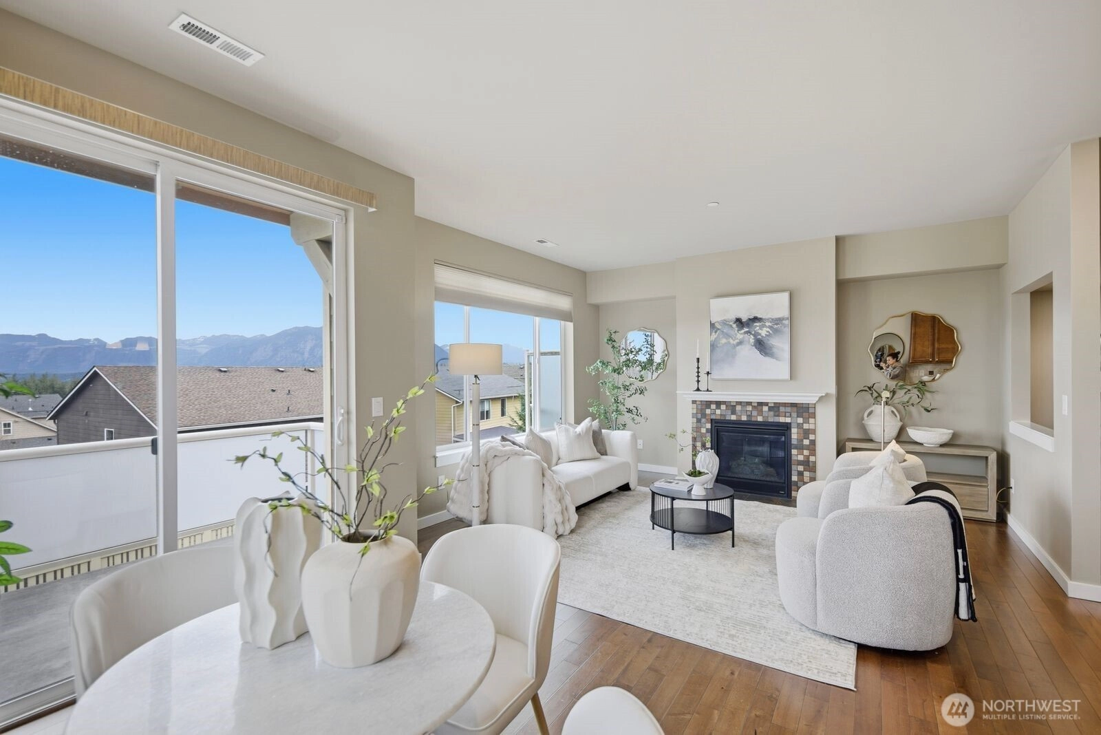 This stunning home has 3 bedrooms + office/den and offers amazing Cascade Mountain View. Originally purchased new with a $50k premium lot upgrade. This rare end unit provides exceptional privacy, abundant natural light, and a thoughtfully designed, highly versatile floor plan. The home features two spacious primary suites with spa-inspired bathrooms, plus a main-floor bedroom with a convenient ¾ bath—ideal for guests, multigenerational living, or a private home office. The home has brand new carpert, fresh interior paint, and seamless flow for both everyday living and entertaining. The bright corner kitchen is beautifully appointed with a center island, granite countertops, tile backsplash, stainless steel appliances, generous cabinetry, and breakfast bar seating. The inviting family room is anchored by a cozy gas fireplace and opens through sliding glass doors to a wrap-around deck with privacy glass railings—perfect for morning coffee, evening sunsets, and taking in peaceful mountain scenery. Additional highlights include a main-floor den or flex space, central A/C for year-round comfort, an attached two-car garage with extra storage, and a premium corner lot. Meticulously maintained, this move-in-ready home blends timeless finishes, modern convenience, and elevated Snoqualmie Ridge living at its finest.